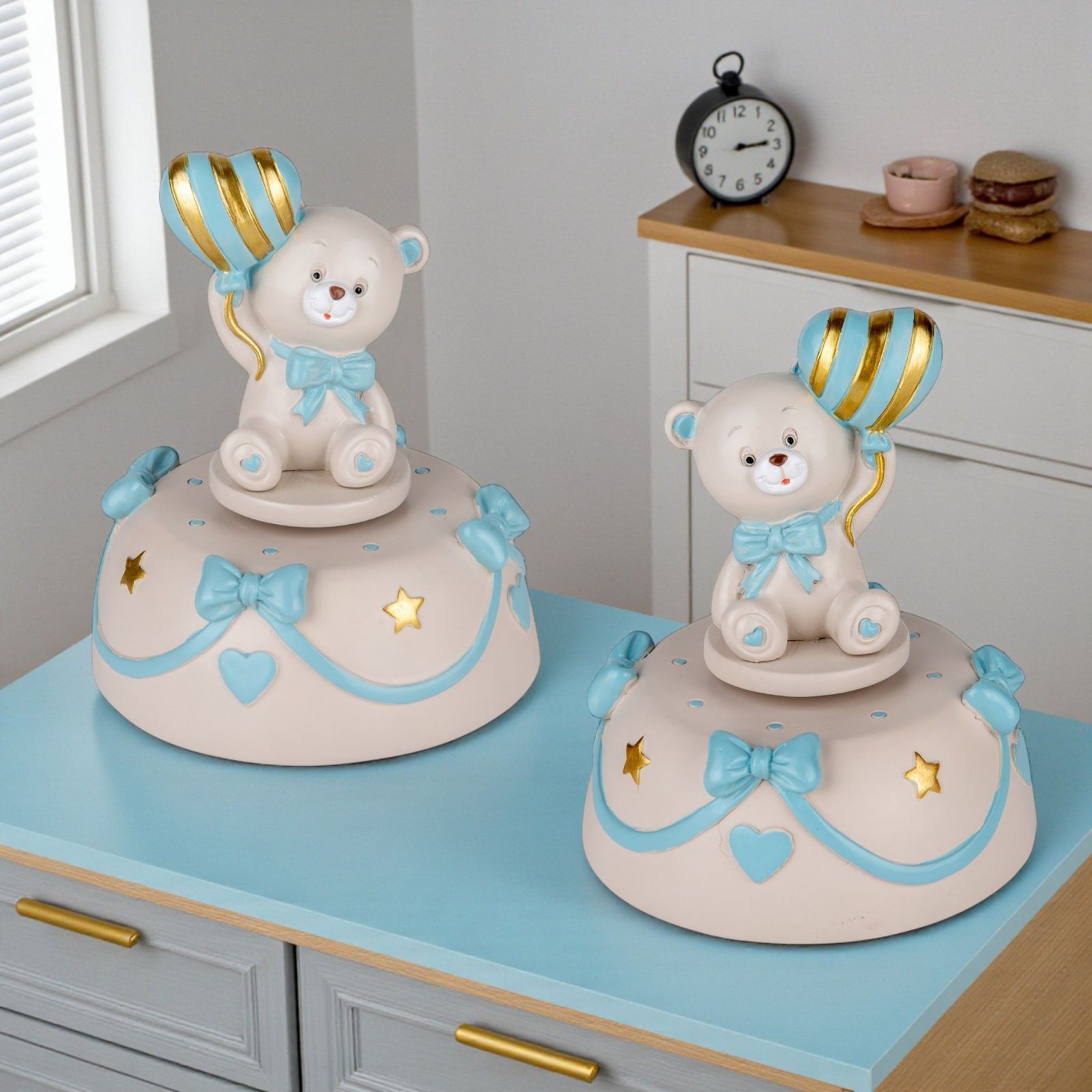 Realizzata in resina di alta qualità, questa bomboniera si distingue per i suoi dettagli delicati. Il grigio tenue, abbinato ai fiocchi azzurri e ai cuoricini color oro, crea un'atmosfera incantevole e raffinata. Ogni carillon è un pezzo unico, pensato per lasciare un ricordo indelebile nel cuore di chi lo riceve. Le idee battesimo originali bomboniere non sono mai state così affascinanti!