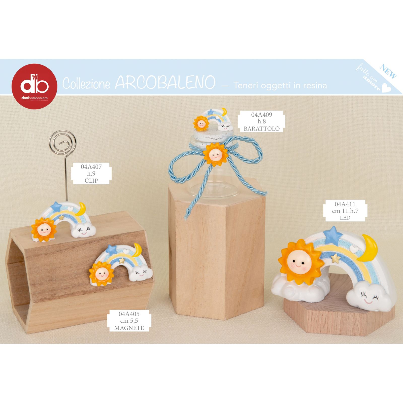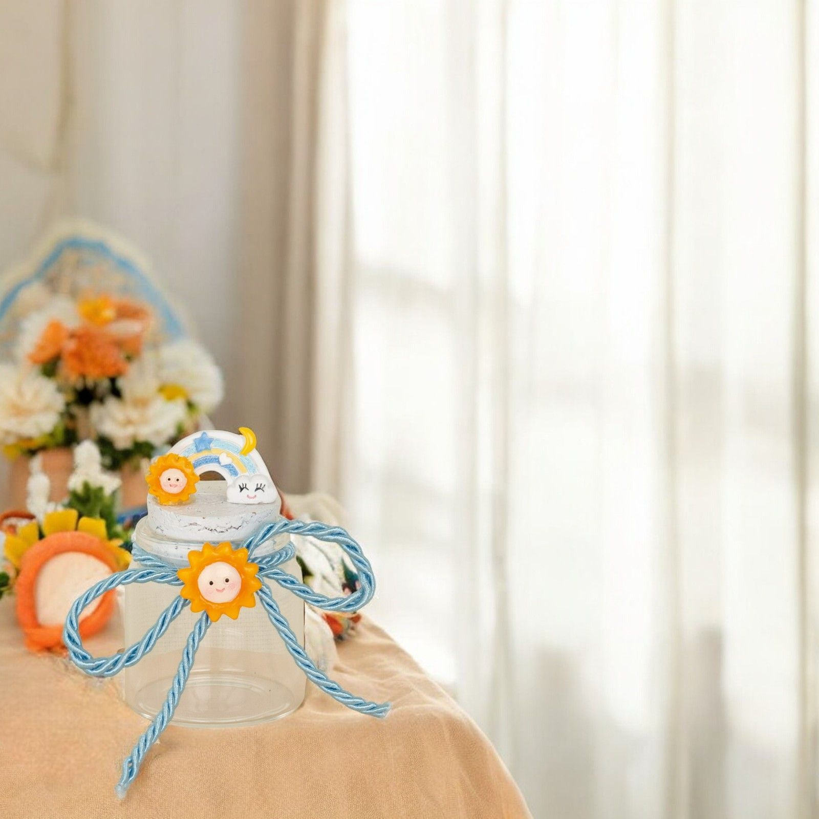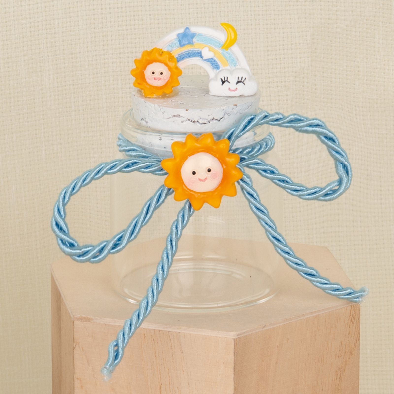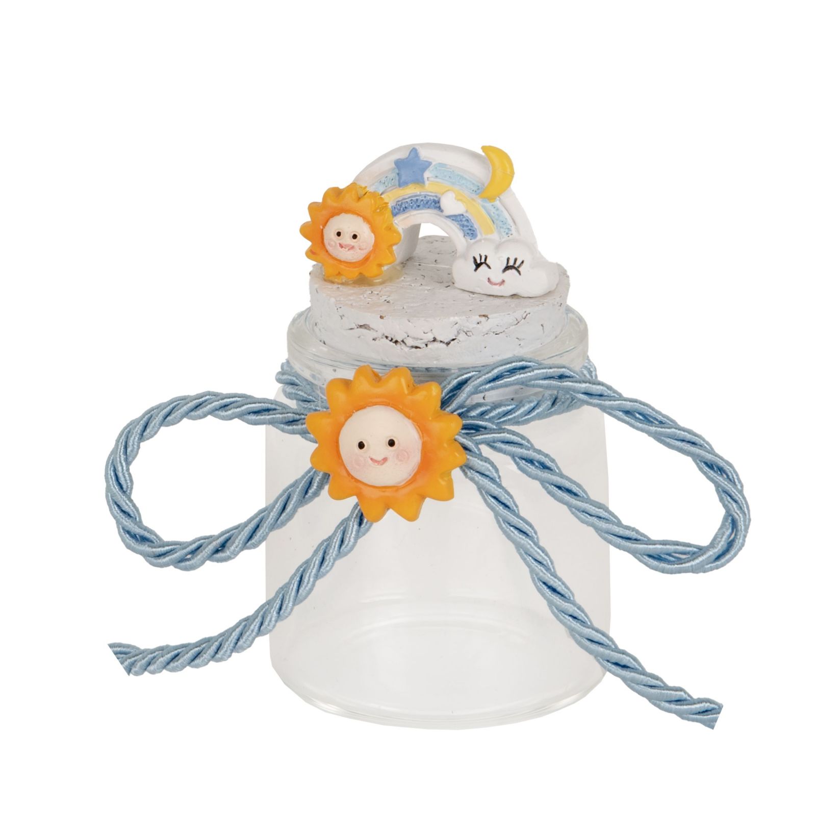 Il Barattolo con tappo decorato con arcobaleno con sole e nuvoletta sorridente è ideale per celebrare il battesimo di un bimbo. Questa bomboniera è un'idea originale e utile da regalare agli invitati come ricordo speciale di questo giorno così importante.