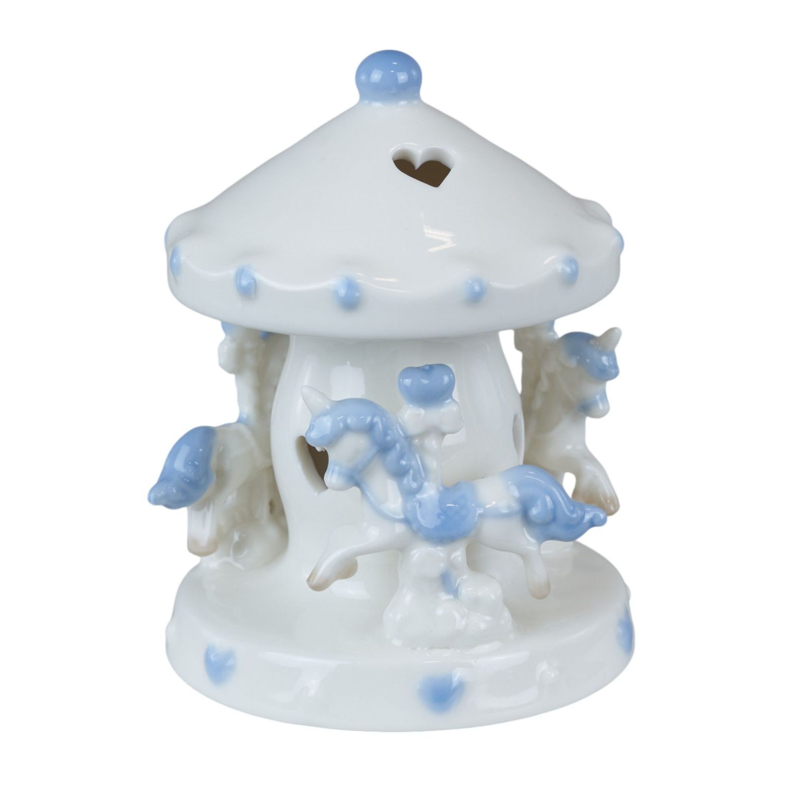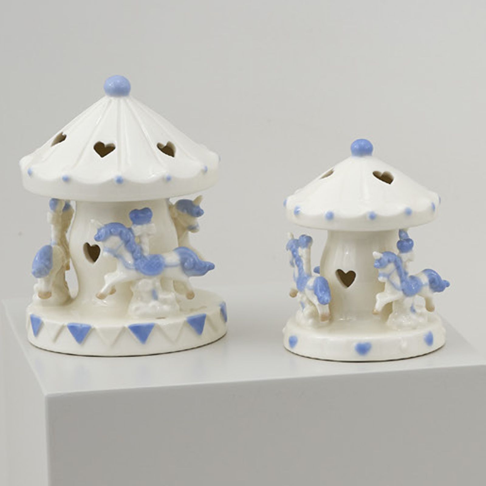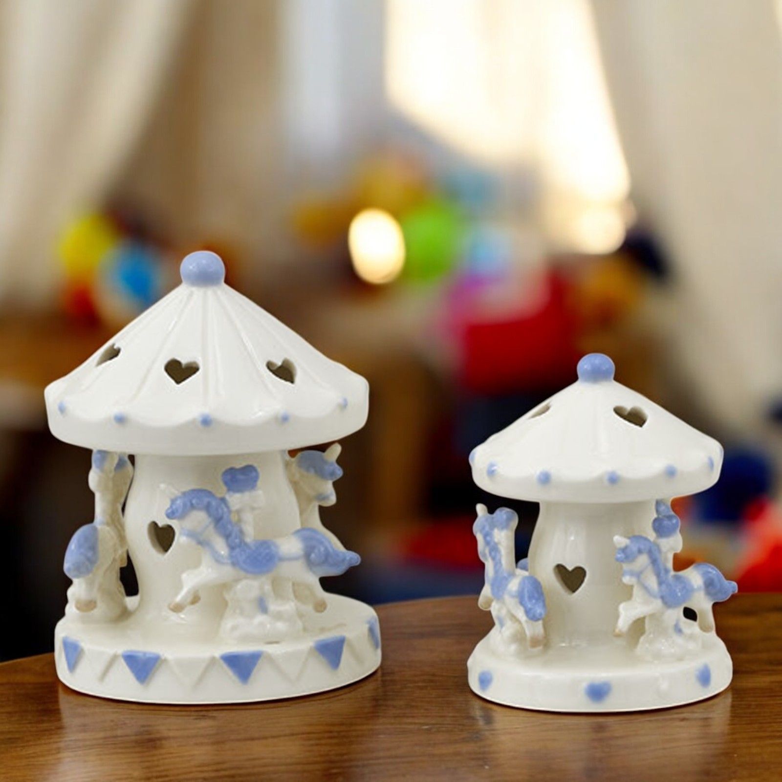 Questa splendida lampada led giostrina con cavalli traforata con cuoricini è l'idea perfetta come bomboniera battesimo, unica e originale. Realizzata in ceramica bianca e celeste, è disponibile in due dimensioni per adattarsi alle esigenze del tuo evento: standard (7,5 x 7,5 x 9,8 cm) e grande (9,3 x 9,3 x 12,3 cm).