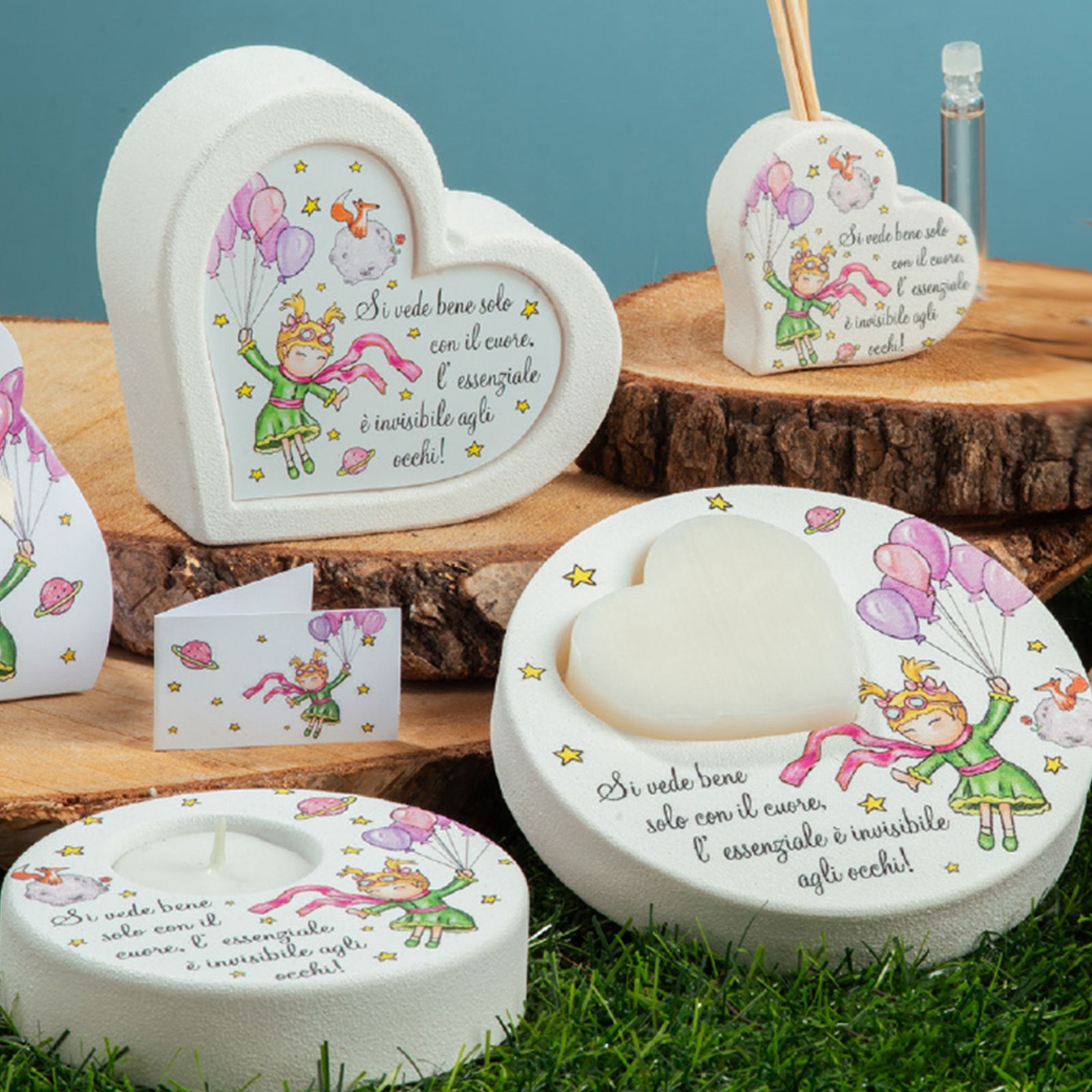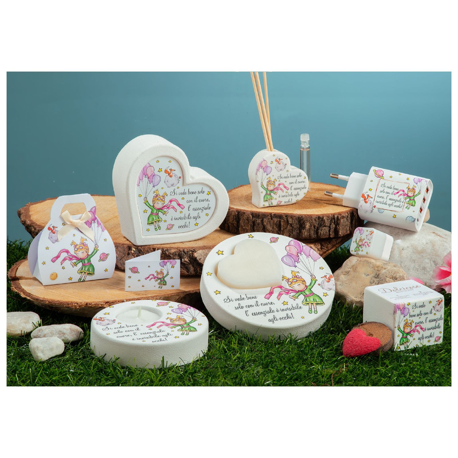 Questa bomboniera con soggetto principessa e palloncini tra le mani è un'opzione perfetta per celebrare eventi speciali come il battesimo o la comunione. I modelli disponibili sono vari e ognuno porta con sé un messaggio unico: "Si vede bene solo con il cuore, l'essenziale è invisibile agli occhi".