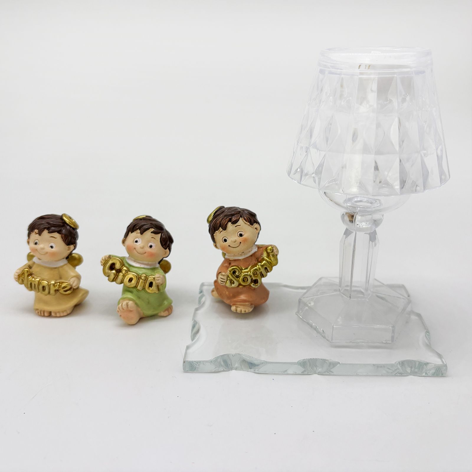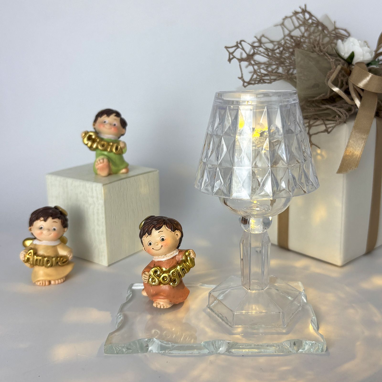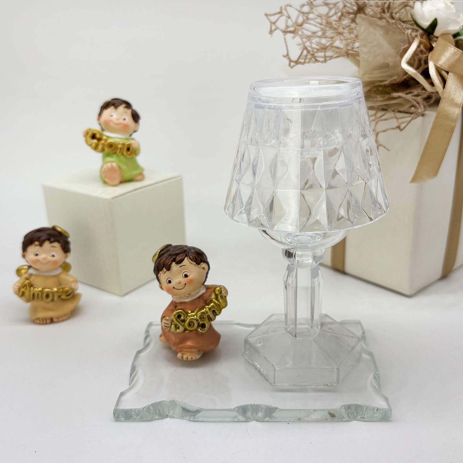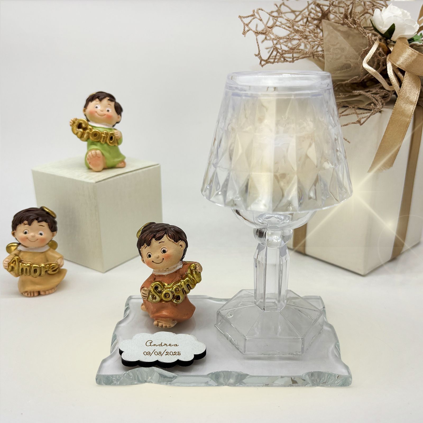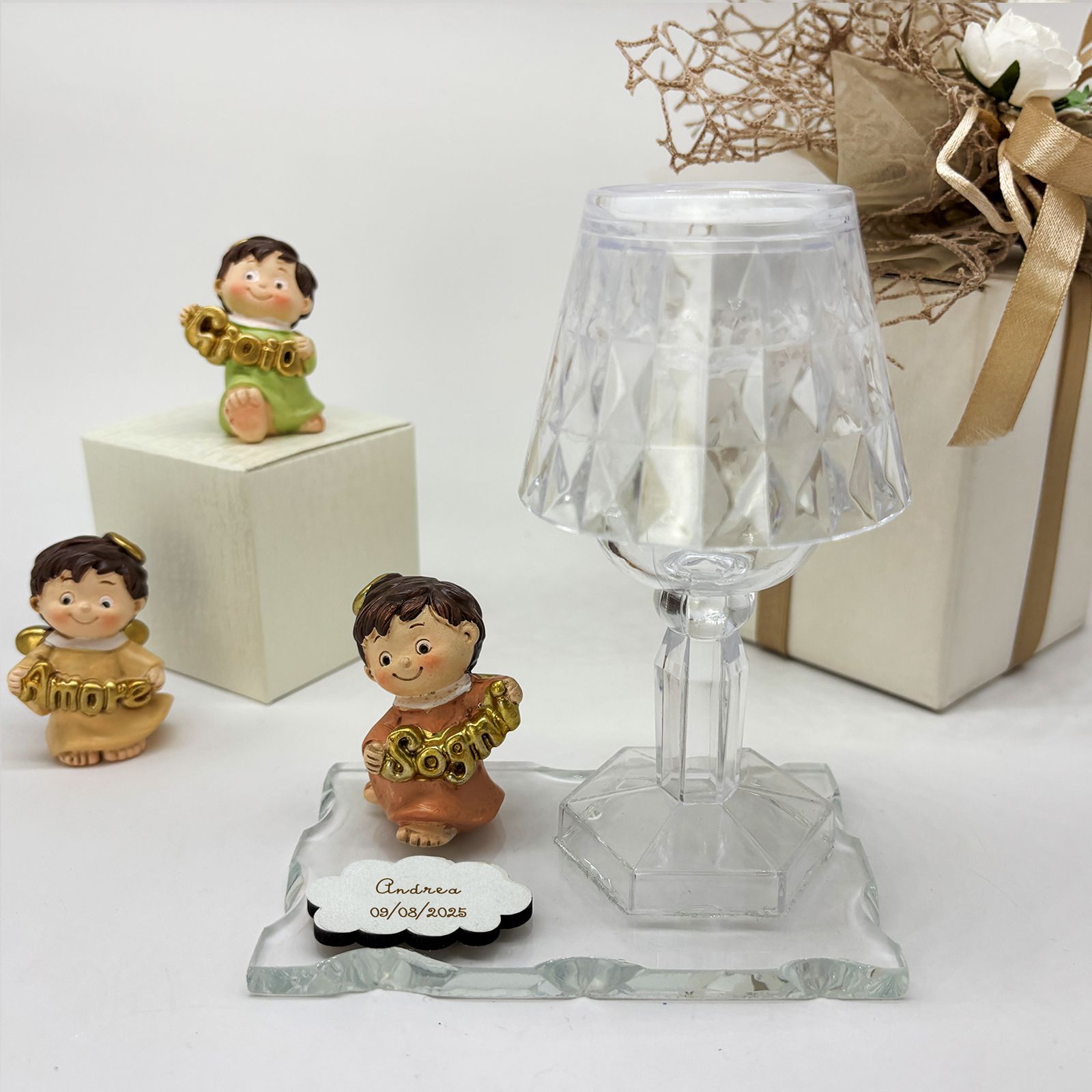 Un dono speciale per celebrare un evento importante con eleganza e significato. Questa creazione unisce una base in vetro, un raffinato lumetto LED in plexiglass e una statuina di un dolce angioletto assortito in tre varianti di posizione. Gli angioletti, vestiti nei delicati colori pastello, tengono tra le mani scritte dorate con le parole "Amore", "Gioia" e "Sogni", rendendo questa bomboniera perfetta per chi cerca bomboniere comunione o bomboniere battesimo dal design particolare e raffinato.
