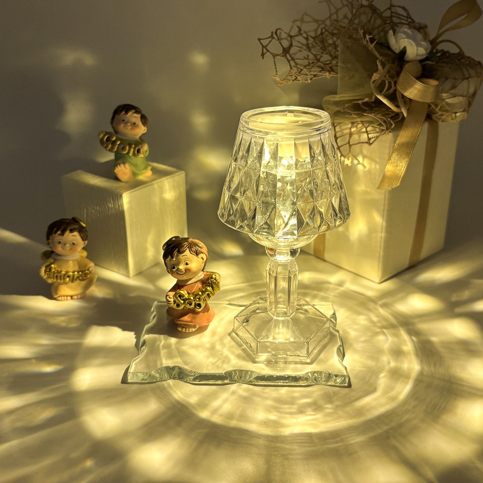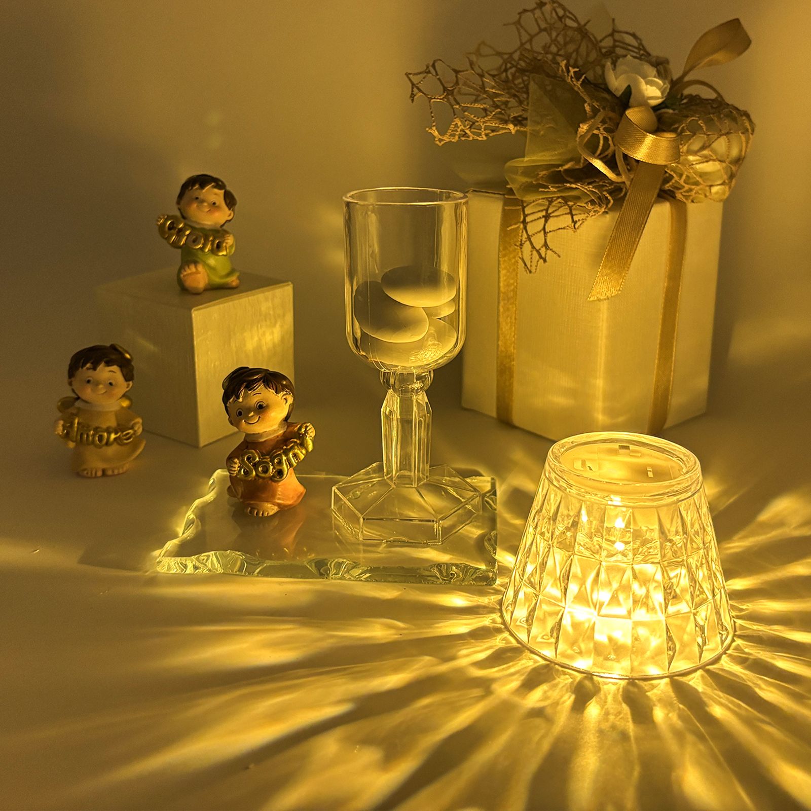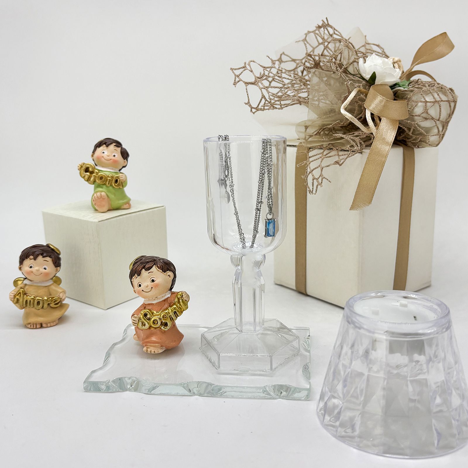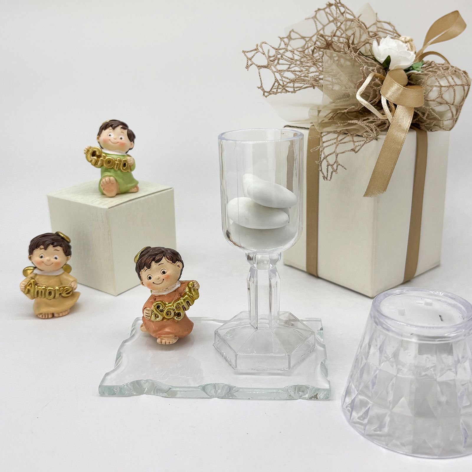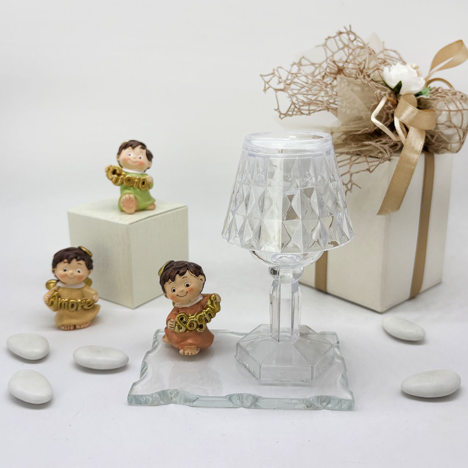 Un dono speciale per celebrare un evento importante con eleganza e significato. Questa creazione unisce una base in vetro, un raffinato lumetto LED in plexiglass e una statuina di un dolce angioletto assortito in tre varianti di posizione. Gli angioletti, vestiti nei delicati colori pastello, tengono tra le mani scritte dorate con le parole "Amore", "Gioia" e "Sogni", rendendo questa bomboniera perfetta per chi cerca bomboniere comunione o bomboniere battesimo dal design particolare e raffinato.