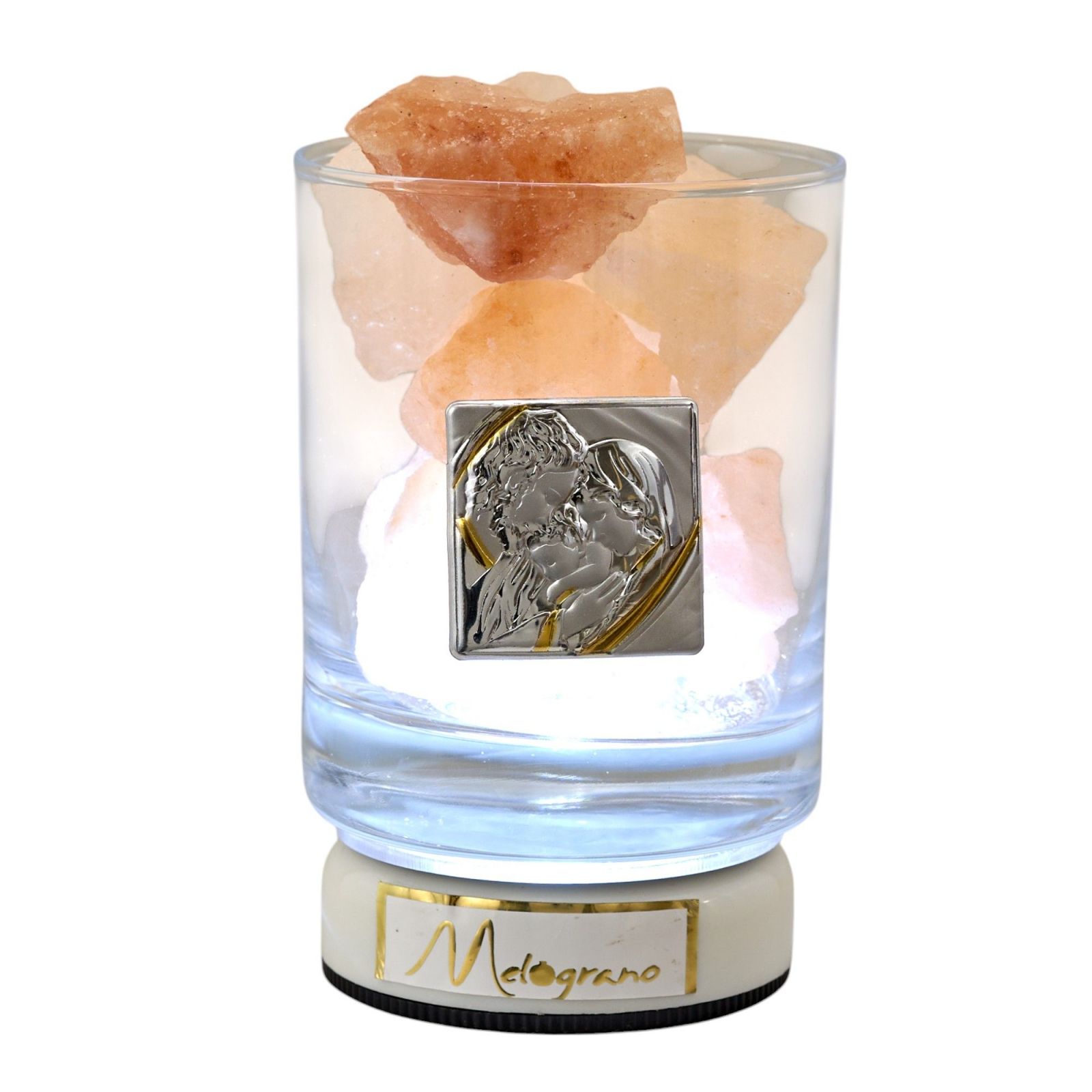 Il sale dell'Himalaya all'interno della lampada non solo renderà l'ambiente più accogliente grazie alle sue proprietà curative, ma anche aggiungerà un tocco di originalità e particolarità alla tua bomboniera. La placchetta argentata con Sacra Famiglia in rilievo conferisce un tocco di eleganza e spiritualità al regalo, rendendolo ancora più significativo.