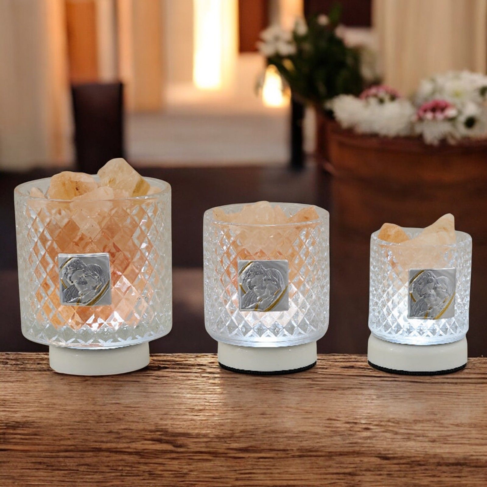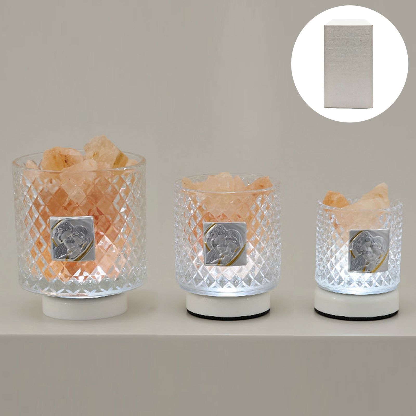 Regalare questa lampada significa donare un oggetto che unisce l'eleganza del design con il benessere del sale himalayano rosa, noto per le sue proprietà benefiche per il corpo e la mente. La placchetta argentata con Sacra Famiglia aggiunge un tocco di spiritualità e protezione alla tua bomboniera, rendendola ancora più speciale e significativa.