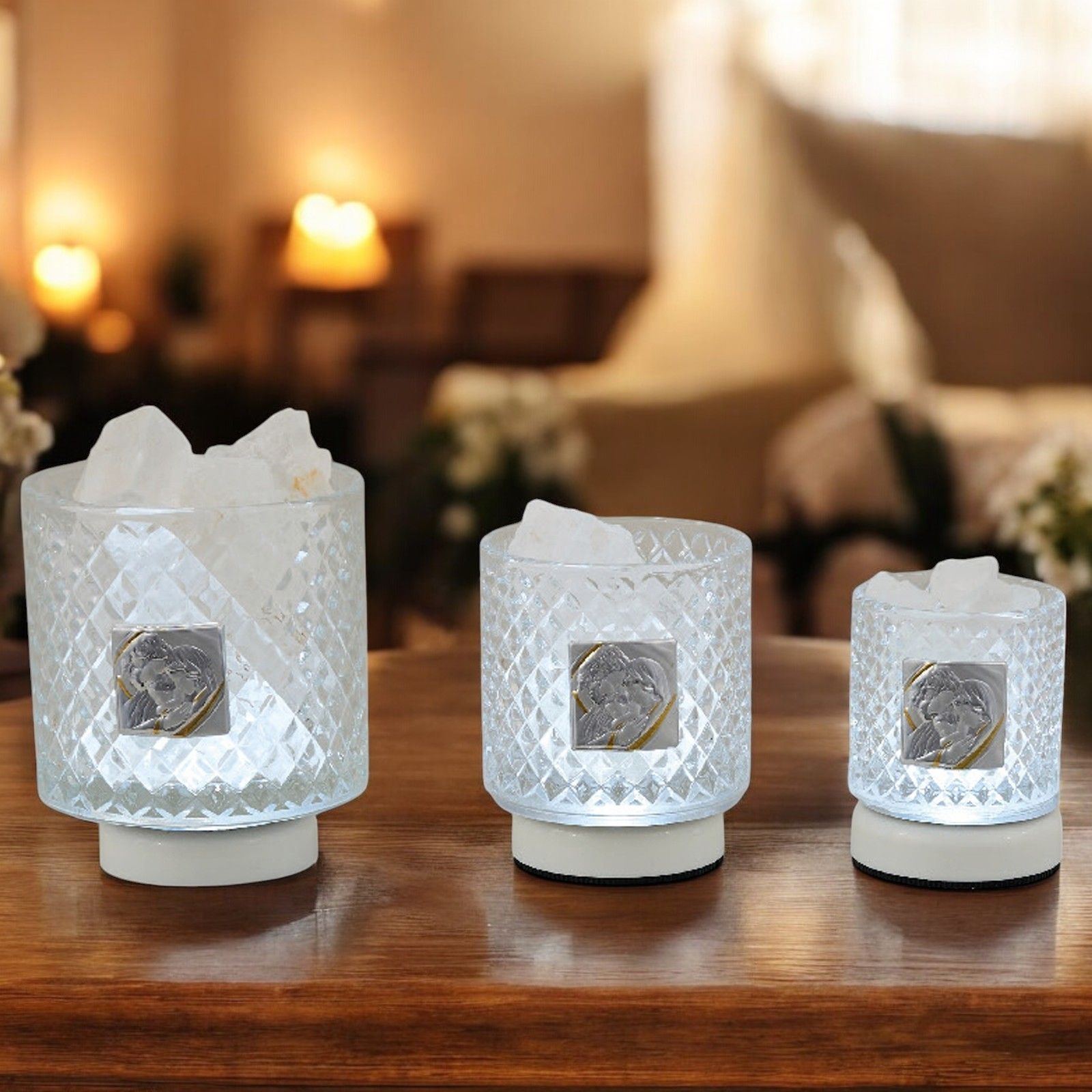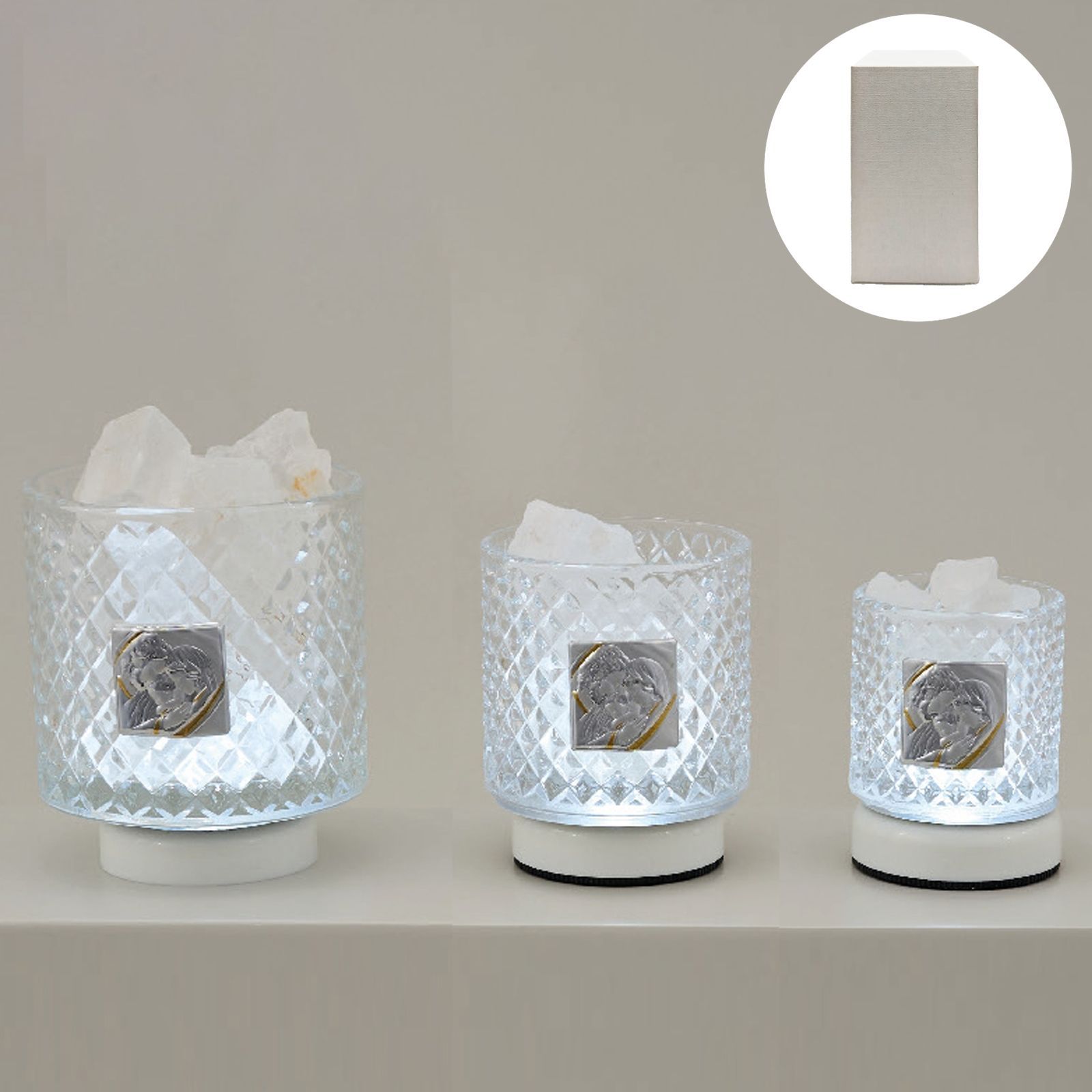 In occasione di eventi speciali come il battesimo, la comunione, la cresima, l'anniversario o il matrimonio, regalare una bomboniera unica come questa lampada led è un gesto di grande significato. Realizzata in vetro con sale dell'Himalaya bianco, la lampada presenta una placchetta argentata con un'immagine della Sacra Famiglia in rilievo, aggiungendo un tocco di eleganza e spiritualità.
