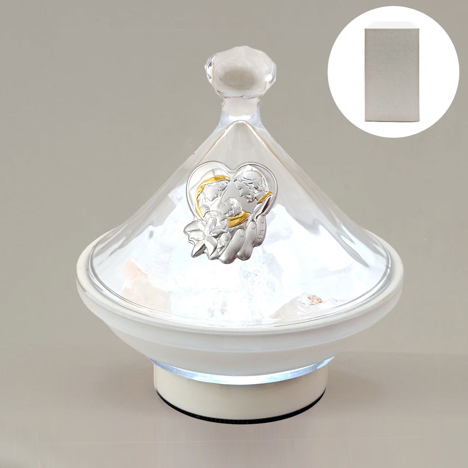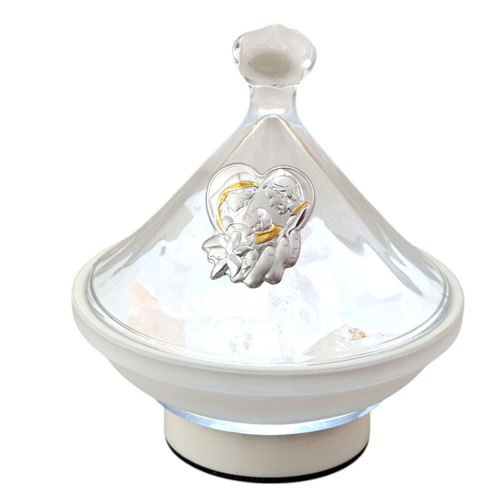 Una bomboniera particolare e significativa per celebrare il battesimo, la comunione, la cresima, un anniversario o un matrimonio. La lampada in sale bianco dell'Himalaya a forma di trullo con la placchetta della Sacra Famiglia è un regalo che racchiude simboli di amore e protezione divina.