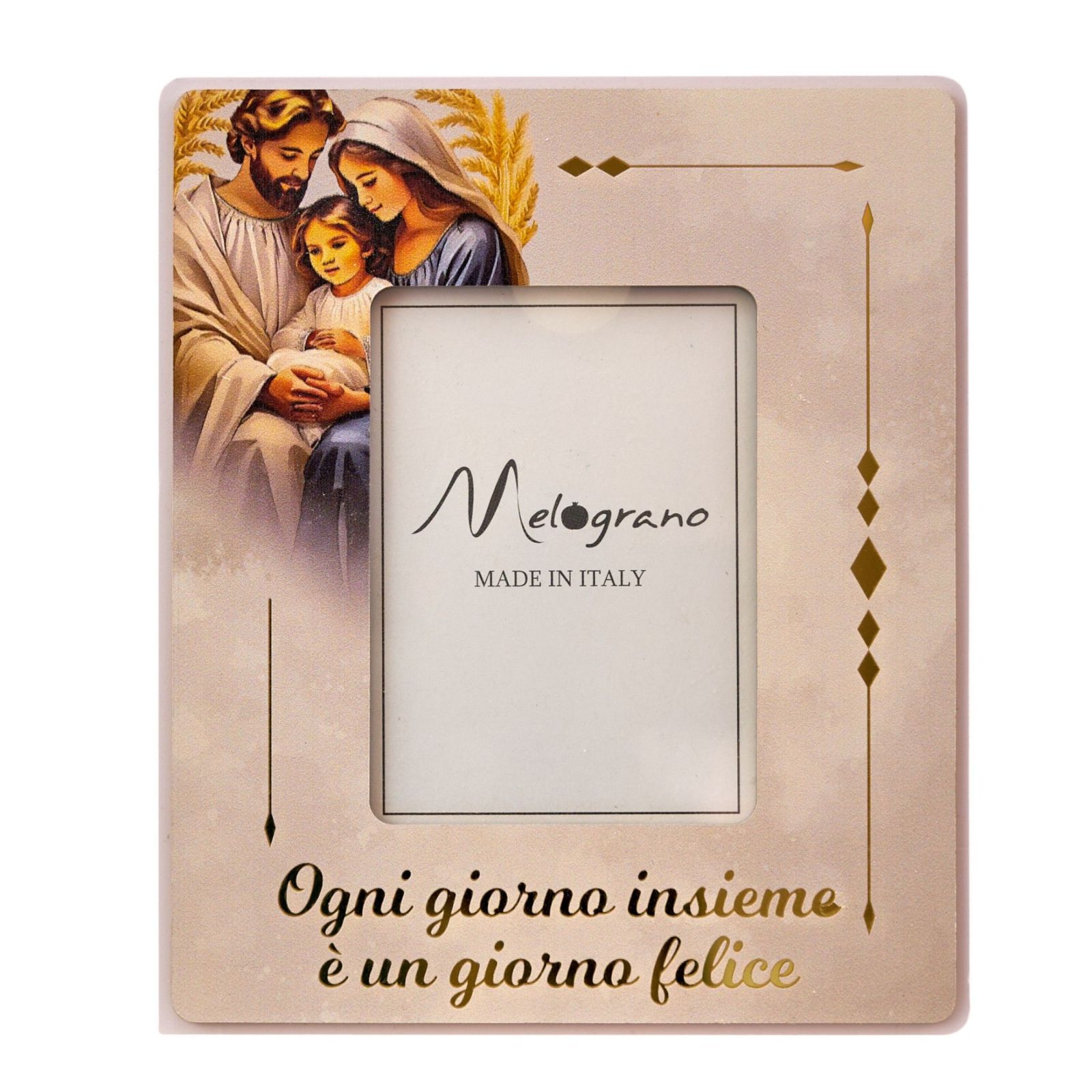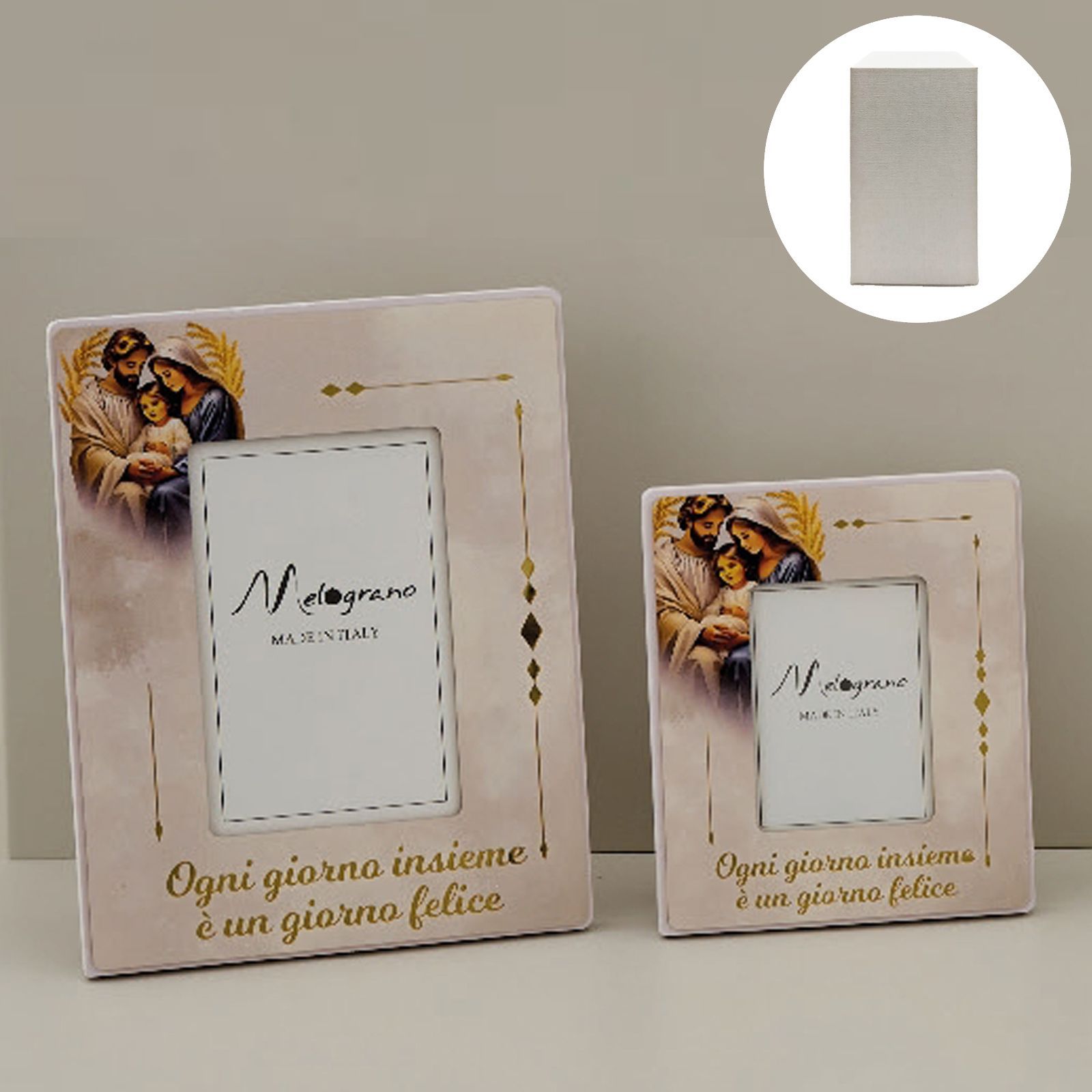 Un ricordo speciale per celebrare momenti unici! Questo raffinato portafoto con l’immagine della Sacra Famiglia è un simbolo di amore, unione e serenità. Perfetto per chi desidera donare agli ospiti un oggetto dal profondo significato spirituale, arricchito dalla dolce frase "Ogni giorno insieme è un giorno felice". Un’idea originale per ringraziare amici e parenti con un dono che custodirà preziosi ricordi.