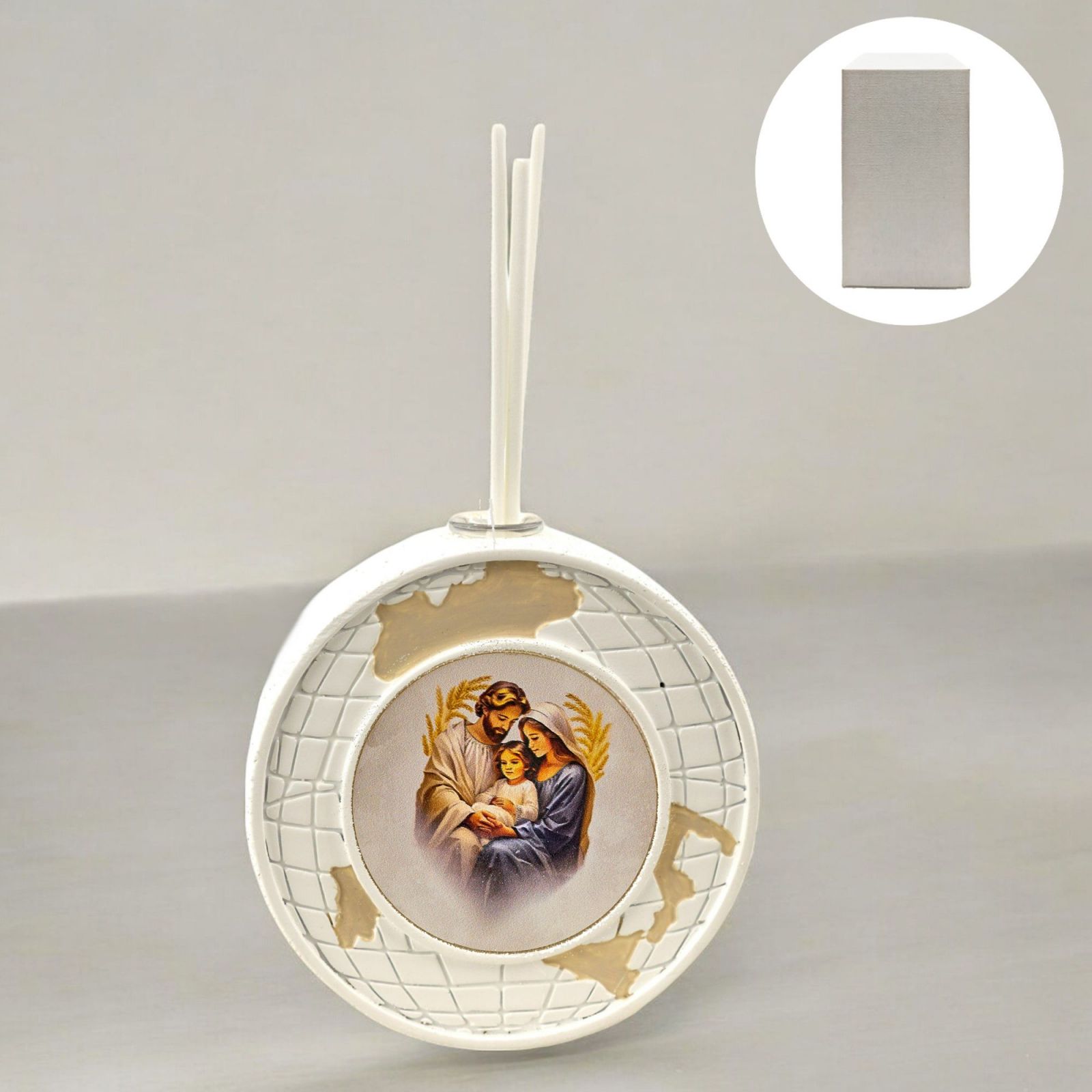 Regala un tocco di eleganza e spiritualità con questo diffusore essenza a forma di mondo con raffigurazione della Sacra Famiglia. Le dimensioni di questa bomboniera sono 10 x 9,5 x 3 cm circa, rendendola perfetta per essere esposta in casa o in ufficio.