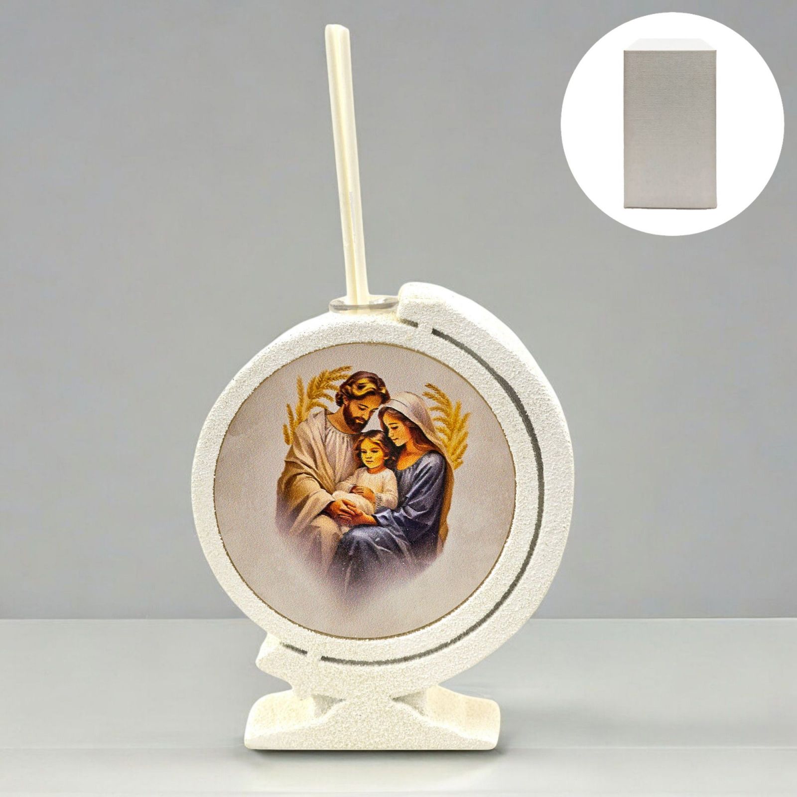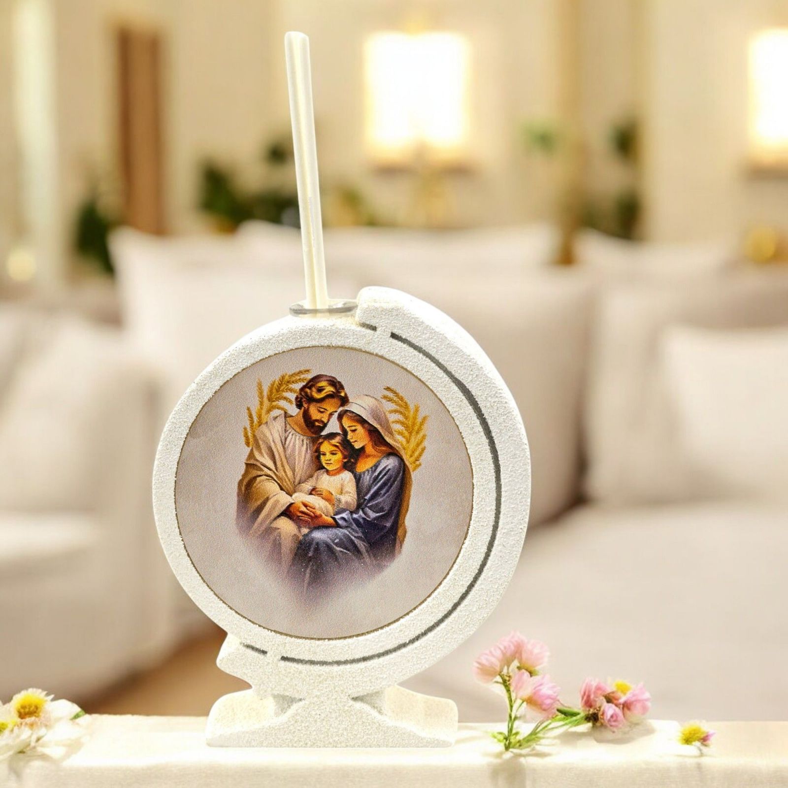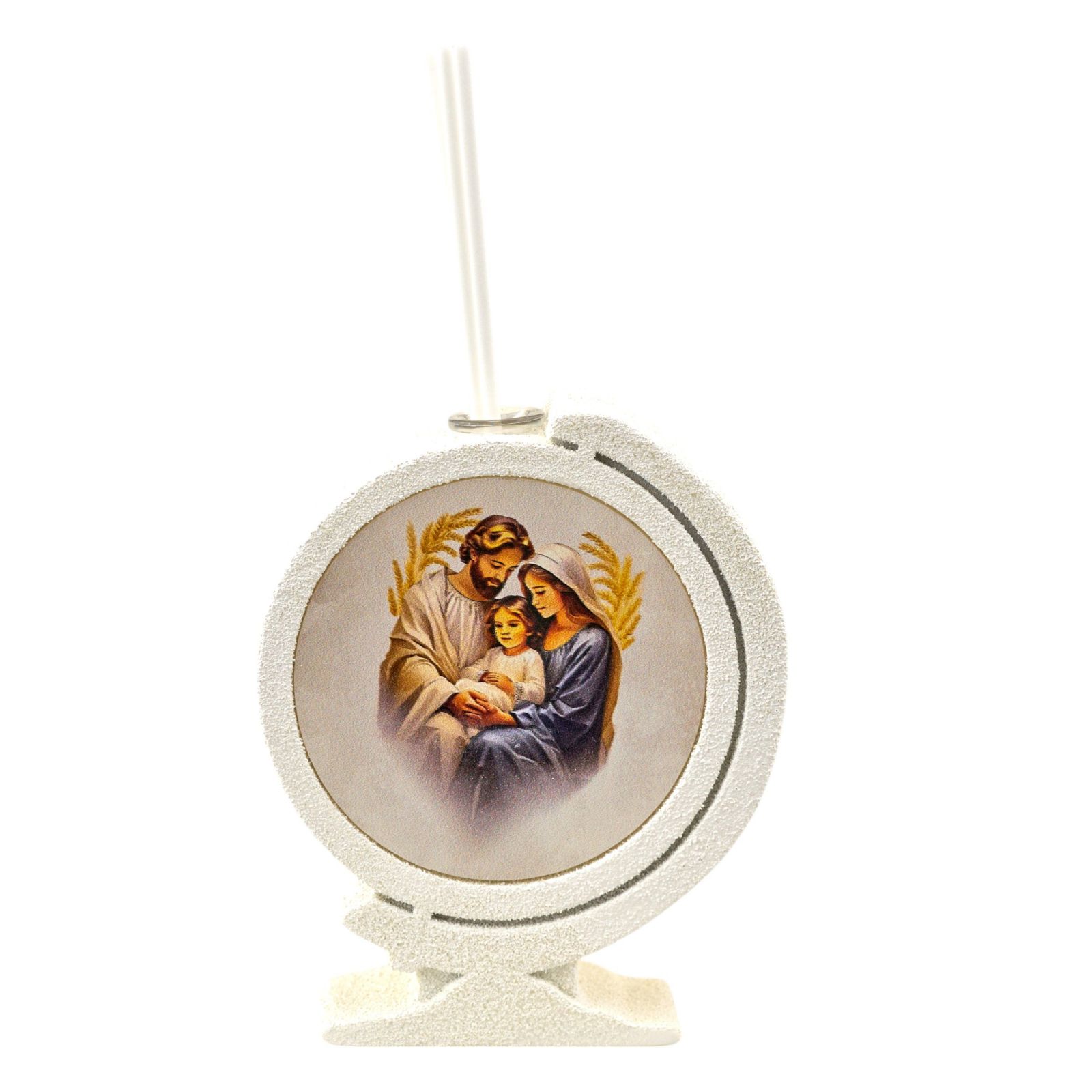 Questa bomboniera particolare e originale è perfetta per eventi speciali come battesimi, comunioni e cresime. Con le sue dimensioni di 11,5 x 9,5 x 3 cm circa, questo diffusore essenza a forma di mappamondo con raffigurazione della Sacra Famiglia è un'idea regalo unica e significativa.