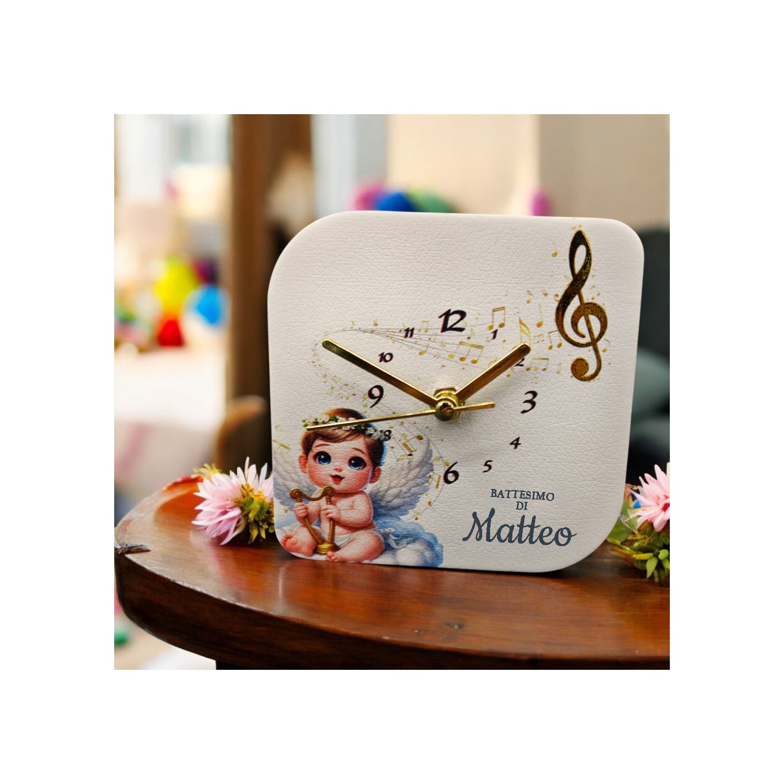 Celebra il battesimo con una bomboniera che rappresenta lamore, la dolcezza e la spiritualità. Questo orologio in ecopelle, con un design esclusivo che raffigura un angioletto con arpa e note musicali, è il regalo perfetto per rendere questo giorno ancora più speciale. Realizzato in materiale ecopelle di alta qualità, l'orologio è un ricordo indimenticabile che accompagnerà i tuoi ospiti per tutta la vita.