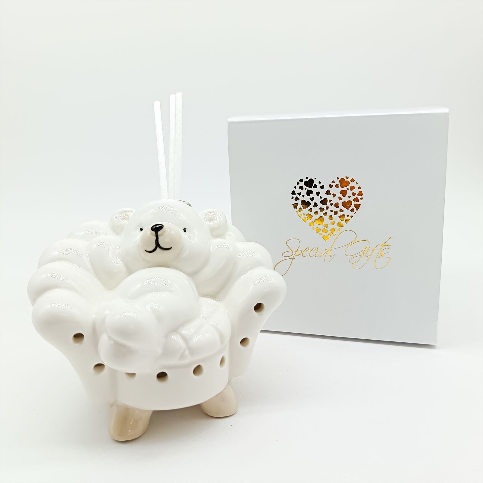Il diffusore ha una dimensione di circa 9x9 cm ed è realizzato in ceramica lucida, con dettagli tortora, perfetto per un piccolo maschietto o una femminuccia. Un regalo elegante e raffinato che non passa inosservato.