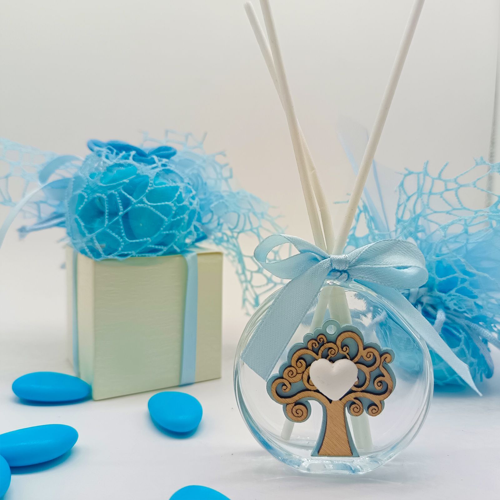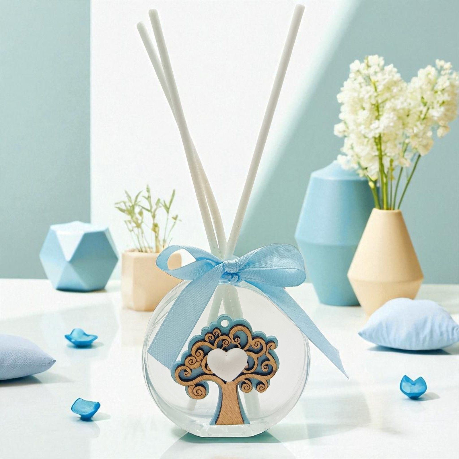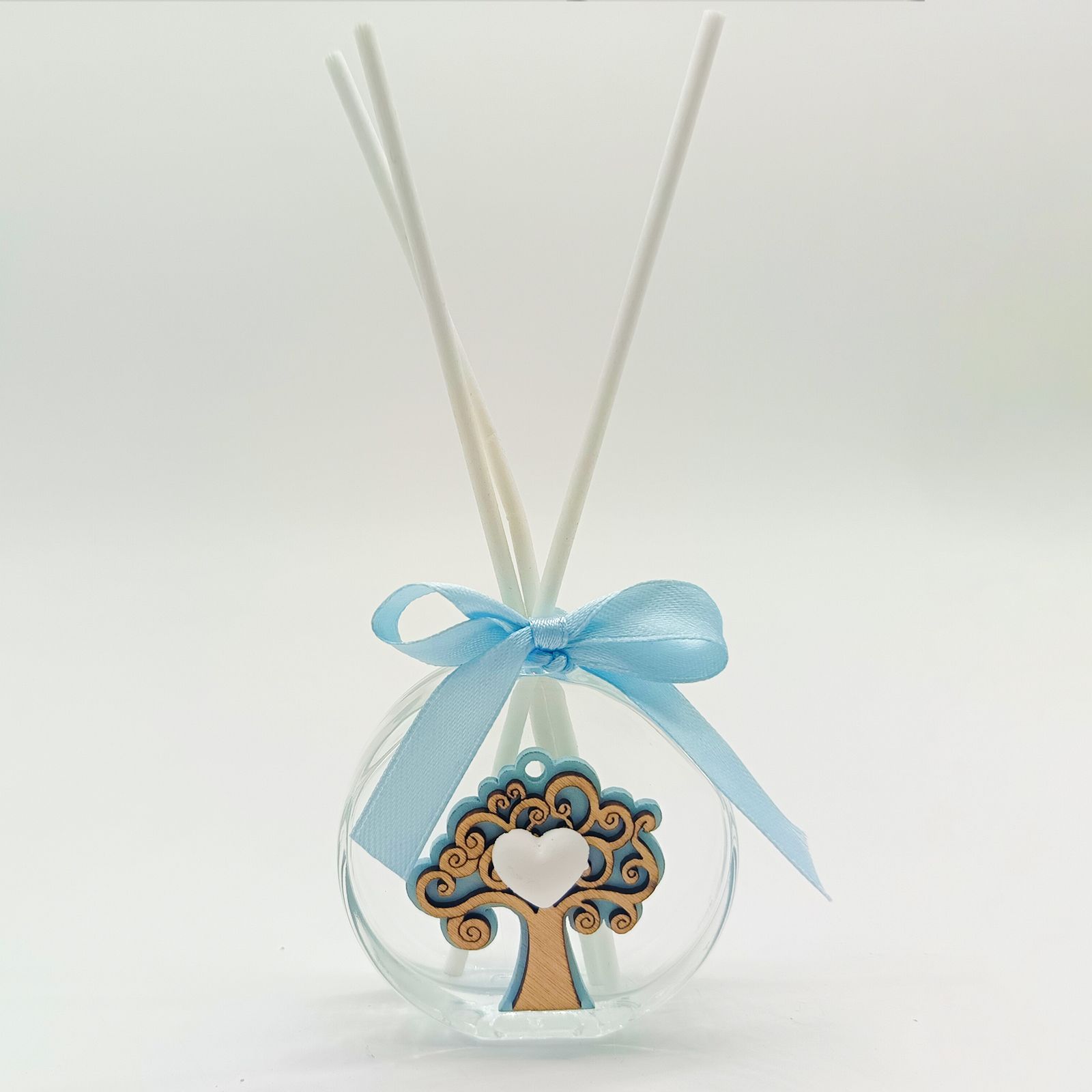 Profumatore ambiente tondo in vetro con decorazione a albero della vita in legno color celeste e un delicato cuoricino bianco al centro, ideale per festeggiare battesimo, primo compleanno e comunione con un tocco di eleganza e significato.