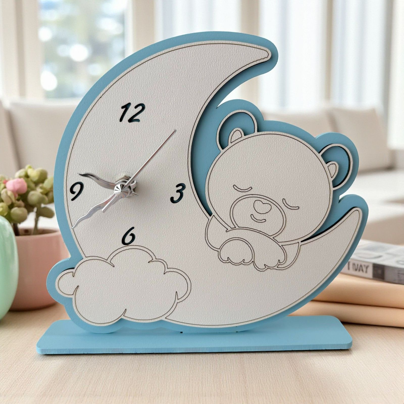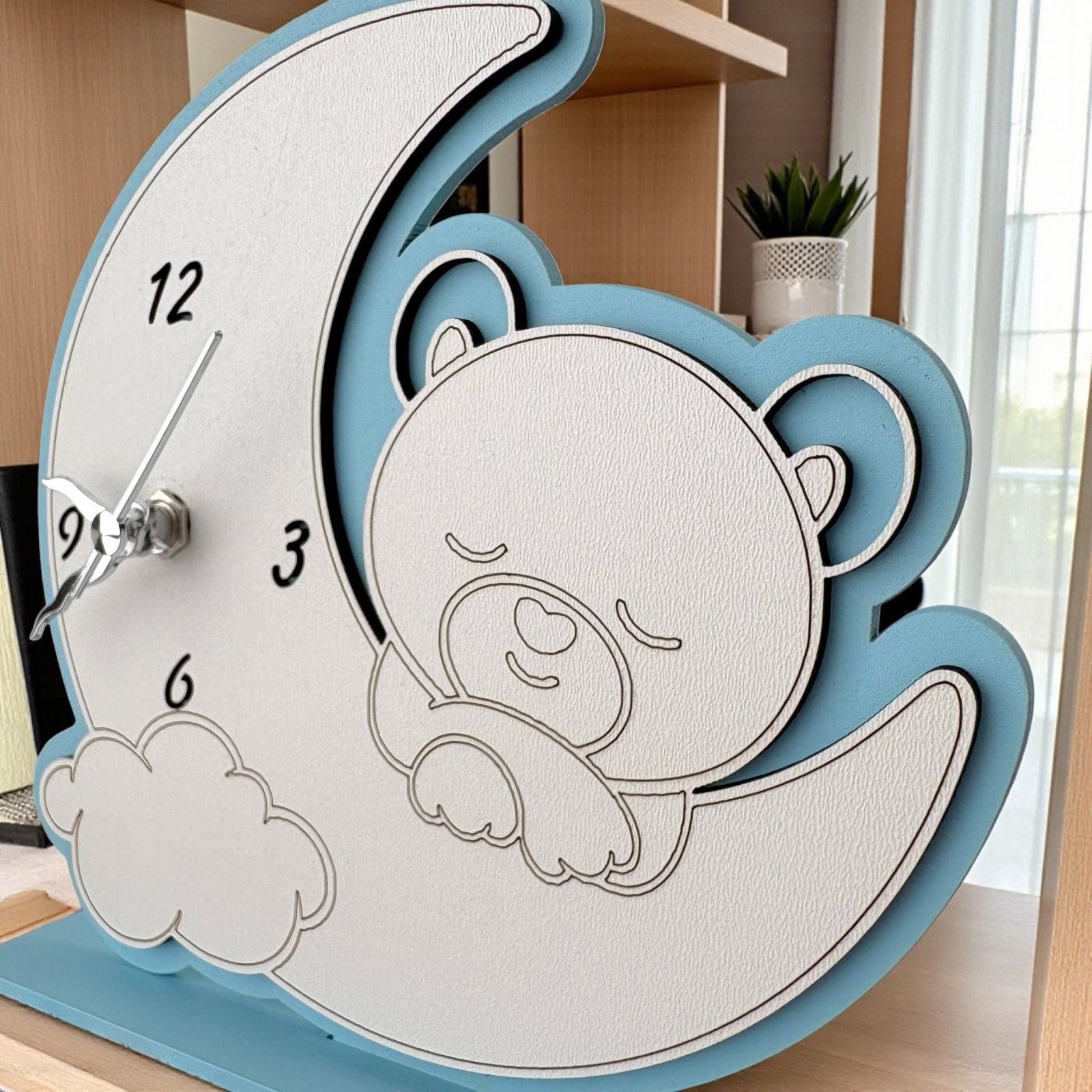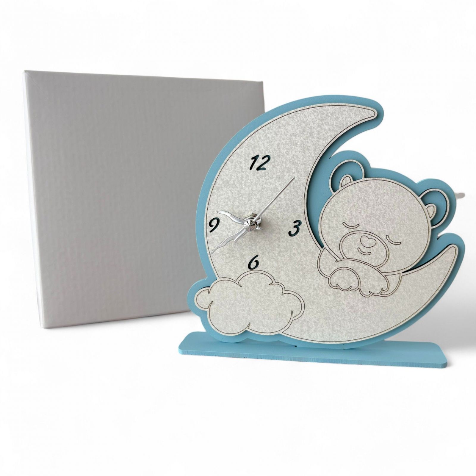 Un dolce orologio a forma di luna con orsetto che poggia su una soffice nuvola, accogliendo delicatamente il quadrante. Perfetto come bomboniera per battesimo o primo compleanno, questo oggetto unisce funzionalità e tenerezza, trasformando un semplice ricordo in un simbolo di affetto e dolcezza.