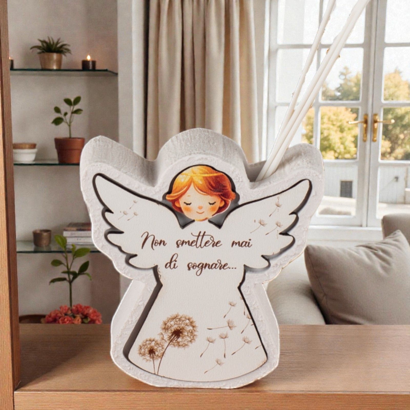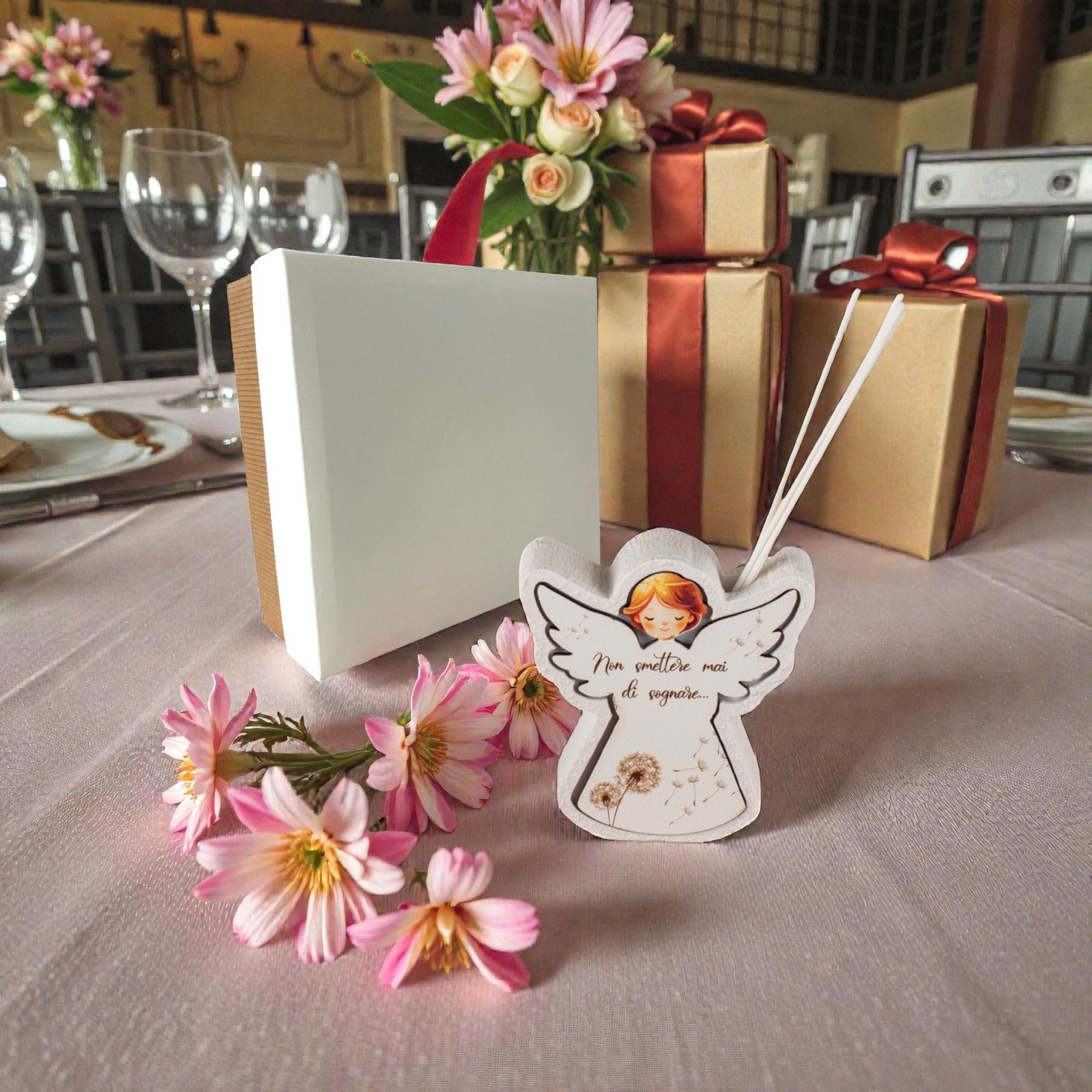 Il nostro diffusore angioletto è molto più di un semplice profumatore: è un simbolo di amore e protezione, ideale come bomboniera battesimo o bomboniera comunione. Realizzato in resina effetto pietra, questo tenero angioletto non solo diffonde una fragranza delicata, ma porta con sé anche un messaggio d'incoraggiamento: “Non smettere mai di sognare”. Ogni volta che verrà utilizzato, ricorderà ai vostri ospiti il significato di questo giorno speciale.