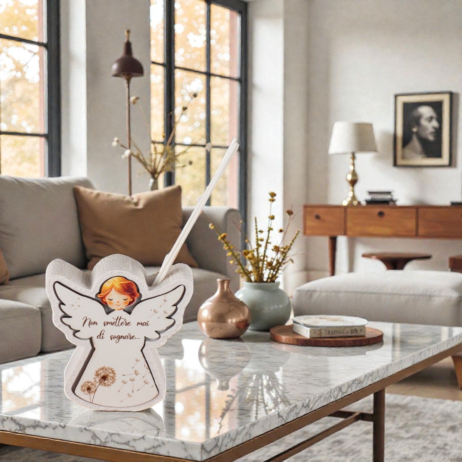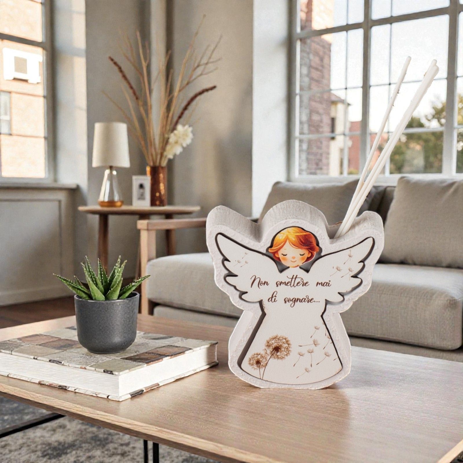 Il colore bianco del diffusore evoca purezza e serenità, perfetto per celebrare eventi così significativi come battesimi e comunioni. Ogni angioletto è impreziosito da una sagoma in legno che lo rende unico e ricco di dettagli. La confezione regalo include scatola, bastoncini ed essenza, permettendo ai vostri cari di godere di un’atmosfera profumata e accogliente.
