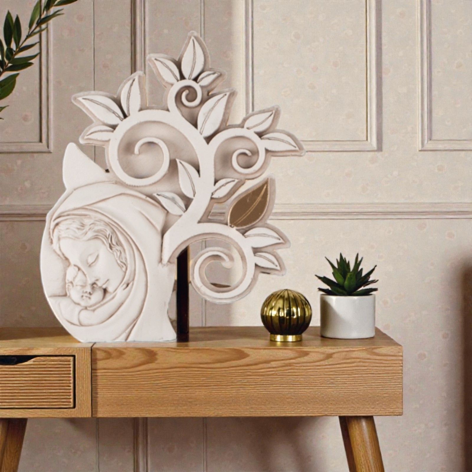 Realizzato in resina di alta qualità e arricchito da un elegante fondo beige, questo quadretto è adornato da un albero della vita con foglie in plexiglass dorato. Ogni dettaglio è curato con amore, rendendo questo oggetto un'icona sacra da esporre con orgoglio nella casa di ogni famiglia. La scatola regalo inclusa rende questo prodotto ancora più speciale, pronto per essere donato.
