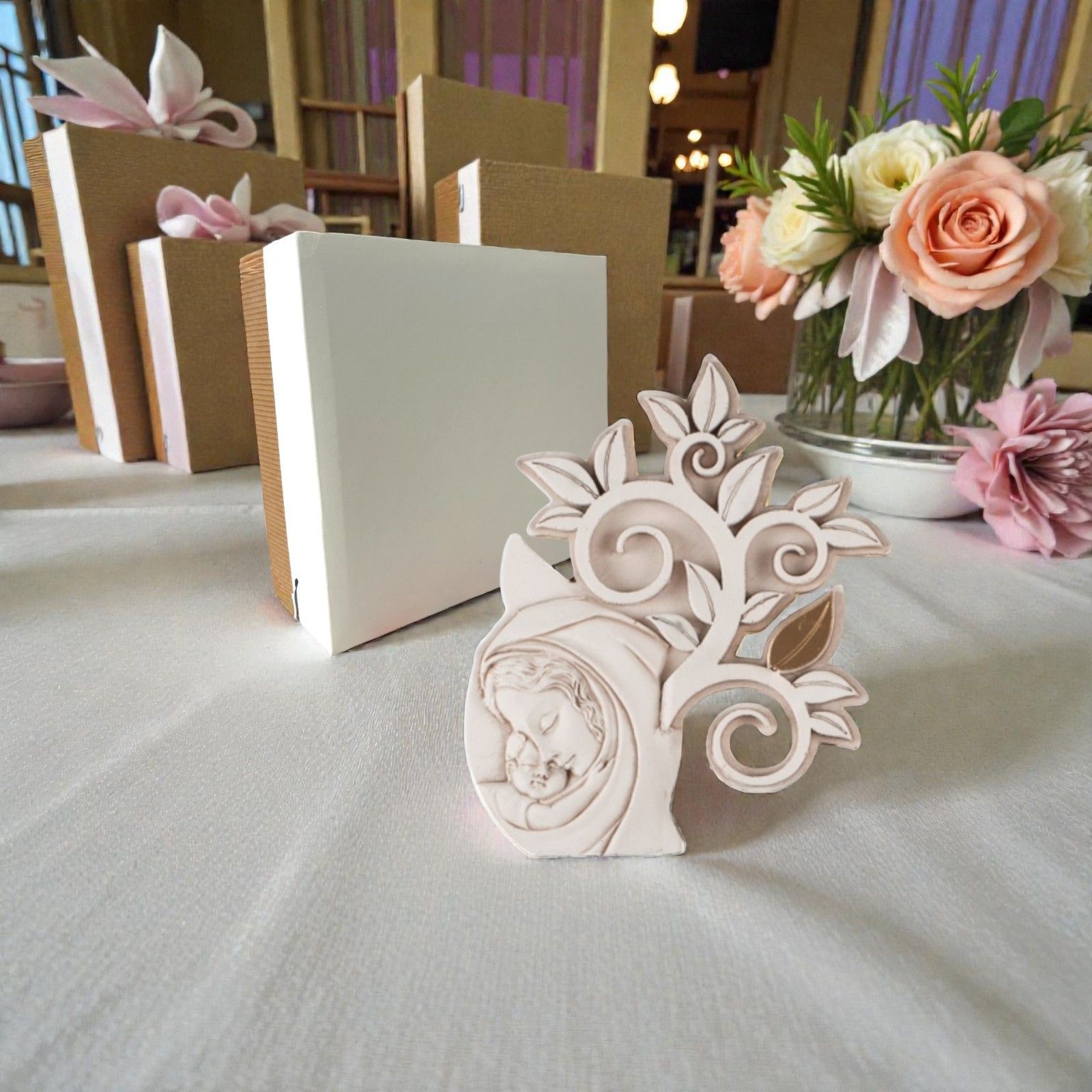 Scopri la nostra bomboniera battesimo ideale per celebrare un bambino o una bambina. Questo meraviglioso quadretto maternità rappresenta un simbolo profondo di amore e protezione, grazie alla sua raffigurazione della Madonna con bambino. Con il suo design unico e delicato, si trasforma in un regalo che accompagnerà i piccoli nella loro crescita, custodendo preziosi ricordi.