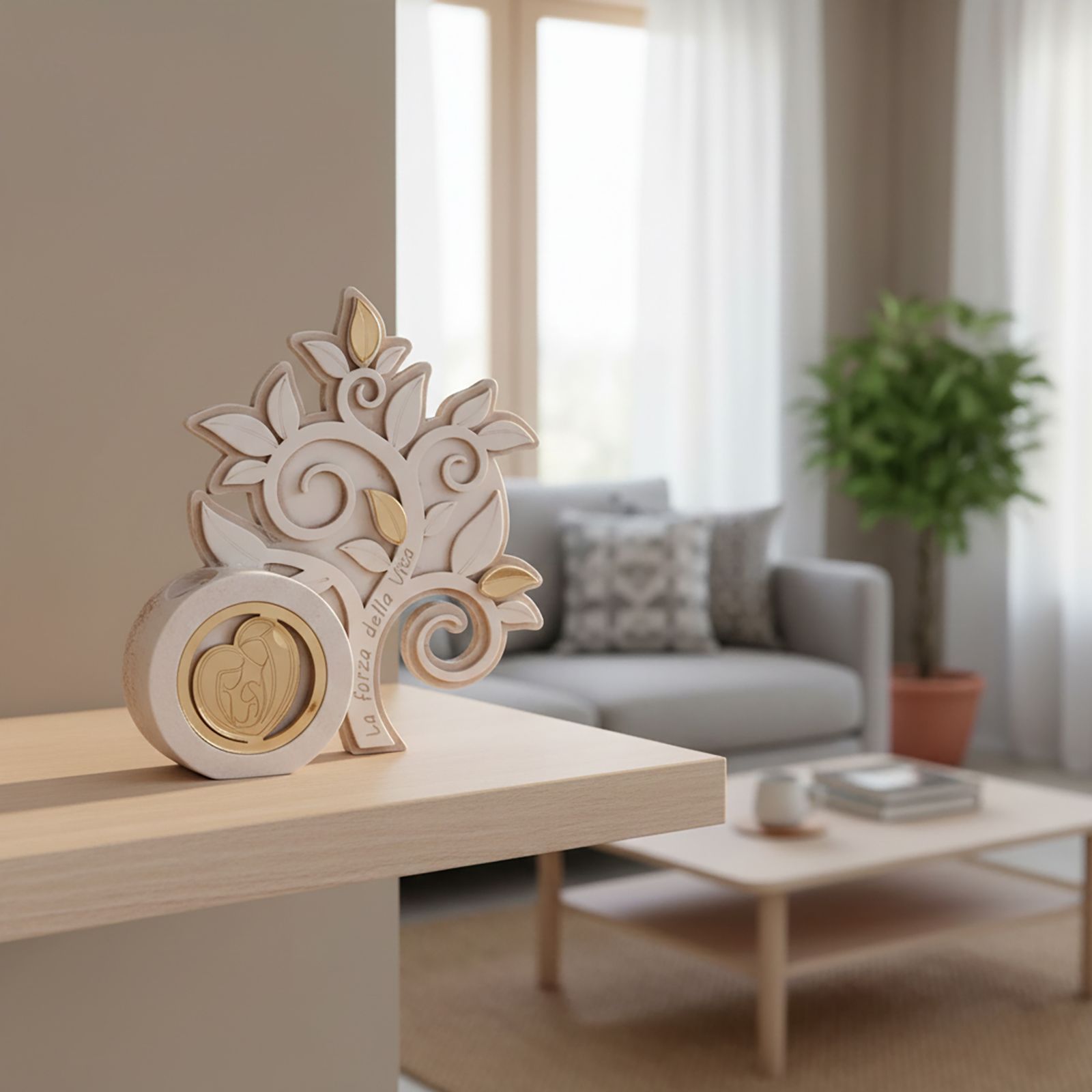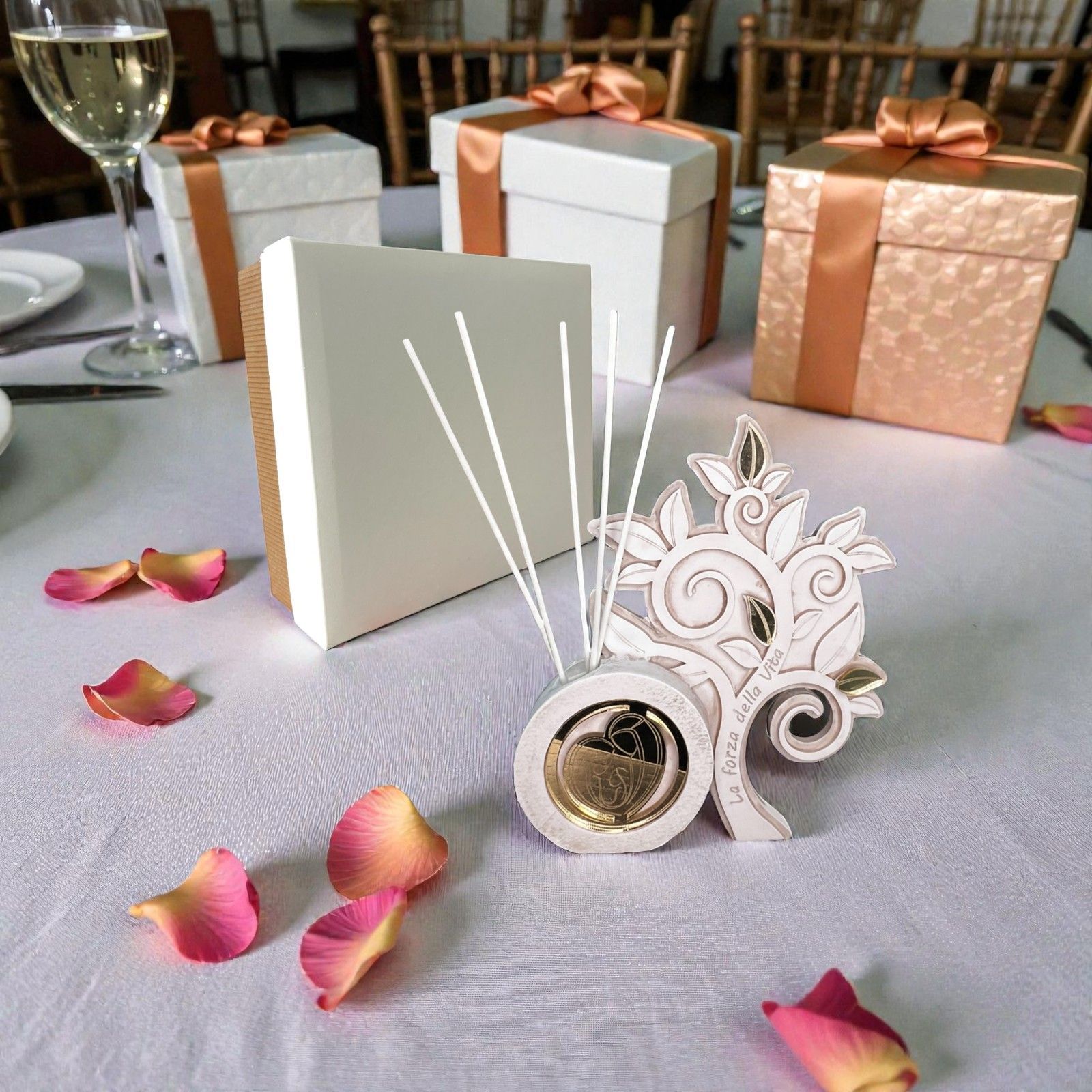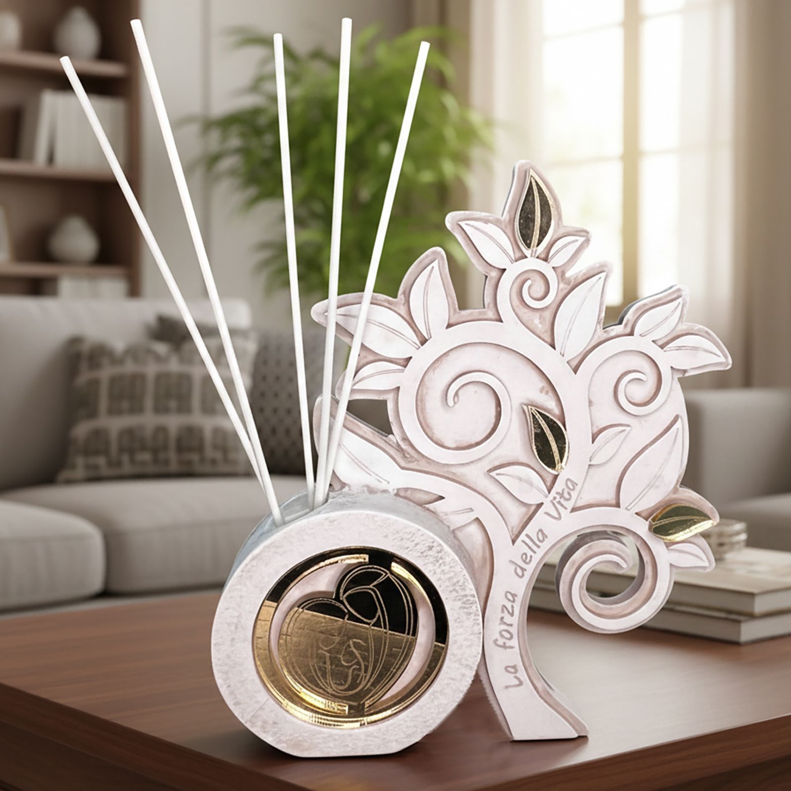 Realizzato in resina di alta qualità e impreziosito da tre foglie dorate in plexiglass, il nostro profumatore è un simbolo di unità e protezione. La frase "La forza della vita" scritta sul tronco non è solo un ornamento, ma un messaggio profondo che accompagnerà i vostri cari in ogni momento della loro vita. Confezionato in una raffinata scatola regalo, con bastoncini ed essenza inclusi, è pronto per essere donato e apprezzato.