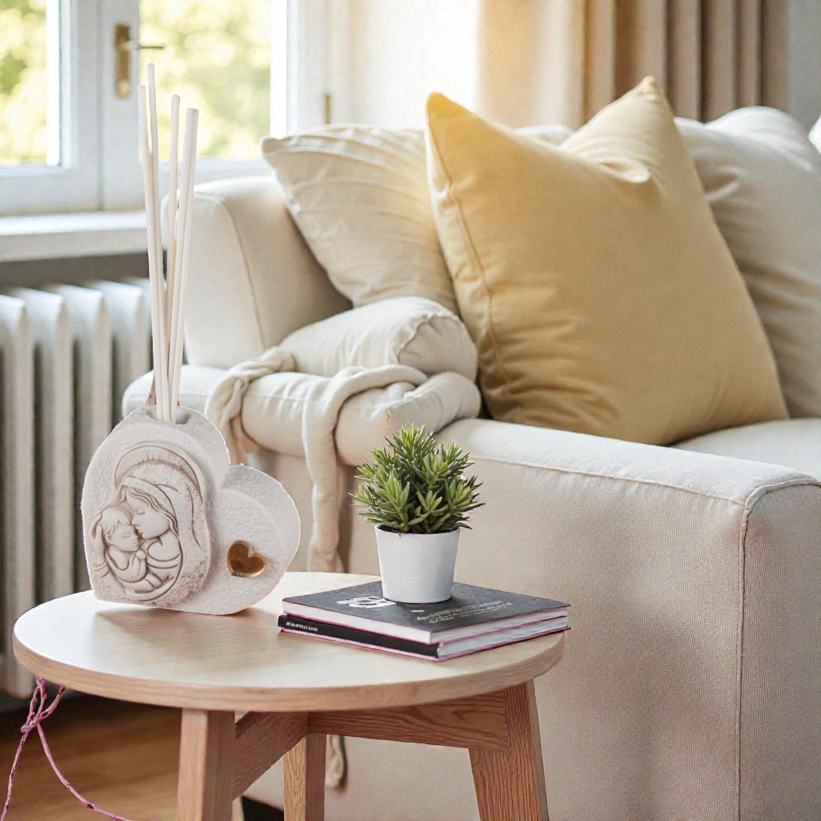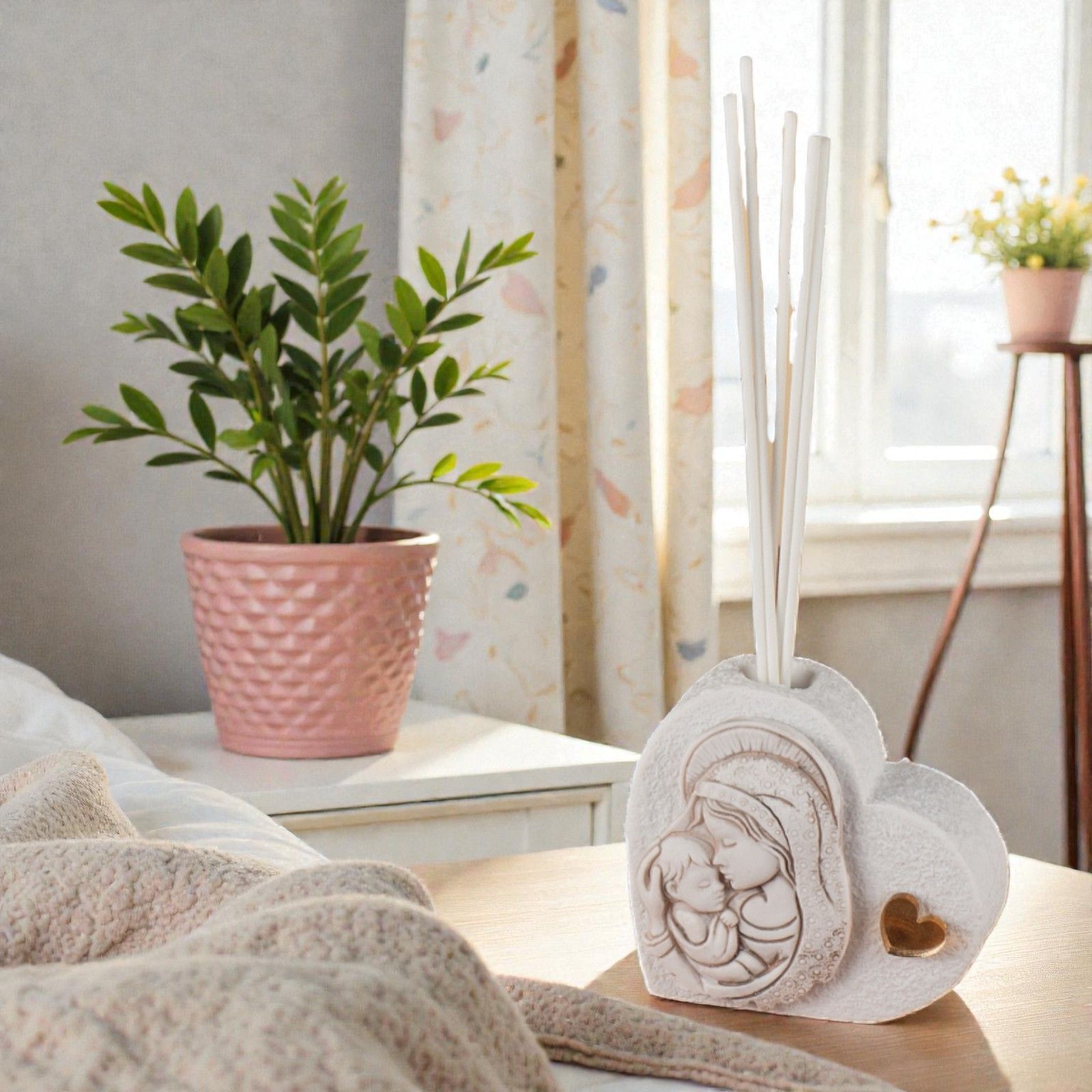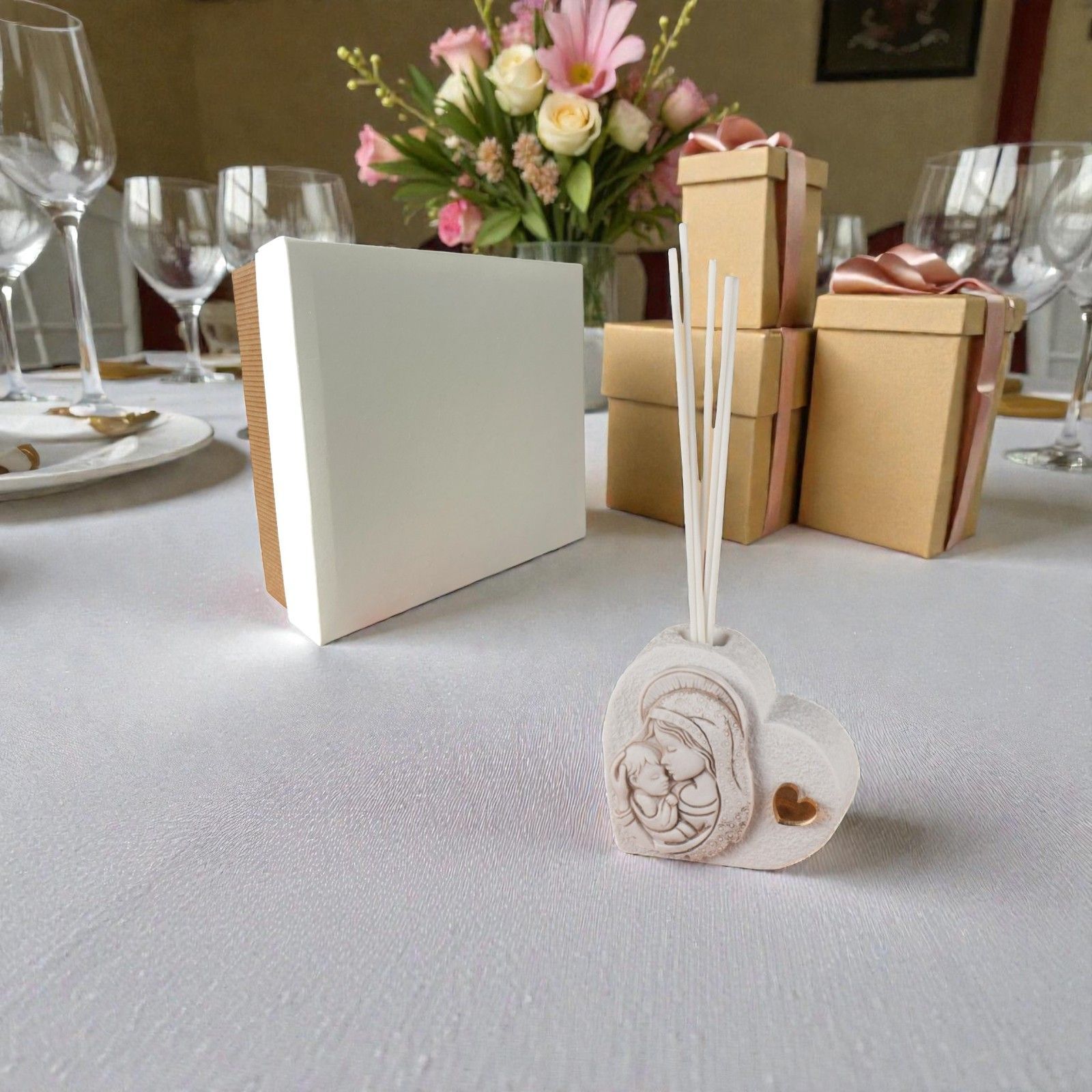 Scopri la magia di un momento unico con il nostro profumatore a forma di cuore, un'elegante bomboniera battesimo che celebra l'amore e la protezione divina. Questo raffinato diffusore non è solo un accessorio per la casa, ma un simbolo profondo di benedizione e serenità, perfetto per accogliere un bambino o una bambina nel mondo. La delicata raffigurazione della Madonna con il bambino, scolpita in bassorilievo, trasmette un senso di pace e unione familiare.