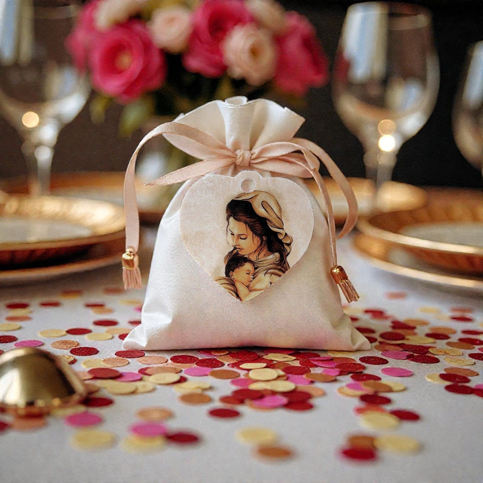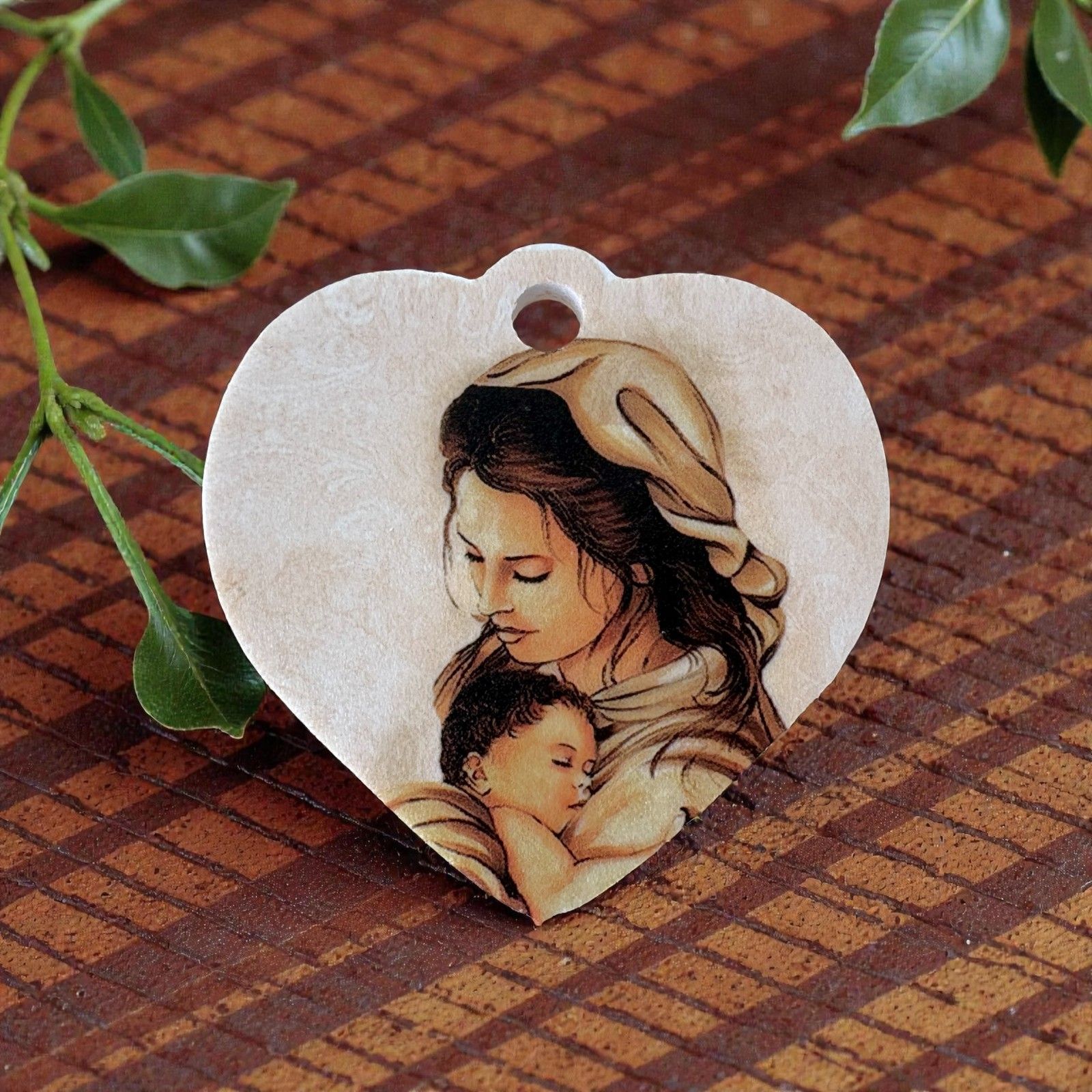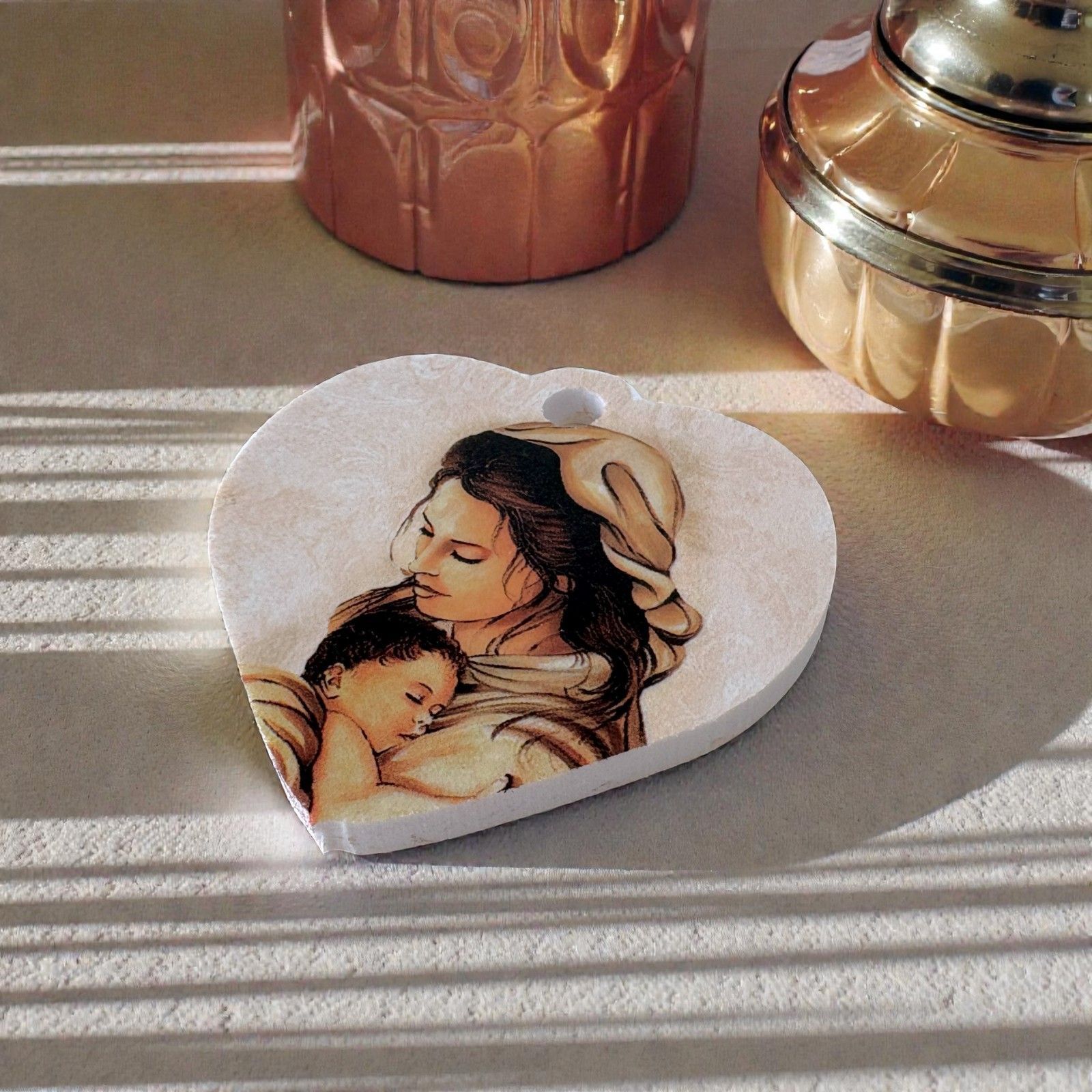 Scopri l'emozione di un battesimo unico e indimenticabile con il nostro esclusivo ciondolo a forma di cuore, un regalo che racchiude l'amore e la protezione della Maternità. Questo delizioso ciondolo, realizzato in resina di alta qualità, presenta una raffinata stampa della Madonna con bambino, rendendolo un simbolo perfetto per celebrare l'inizio della vita del tuo piccolo. Ogni dettaglio è pensato per evocare dolci ricordi e creare un legame speciale tra chi riceve e chi dona.