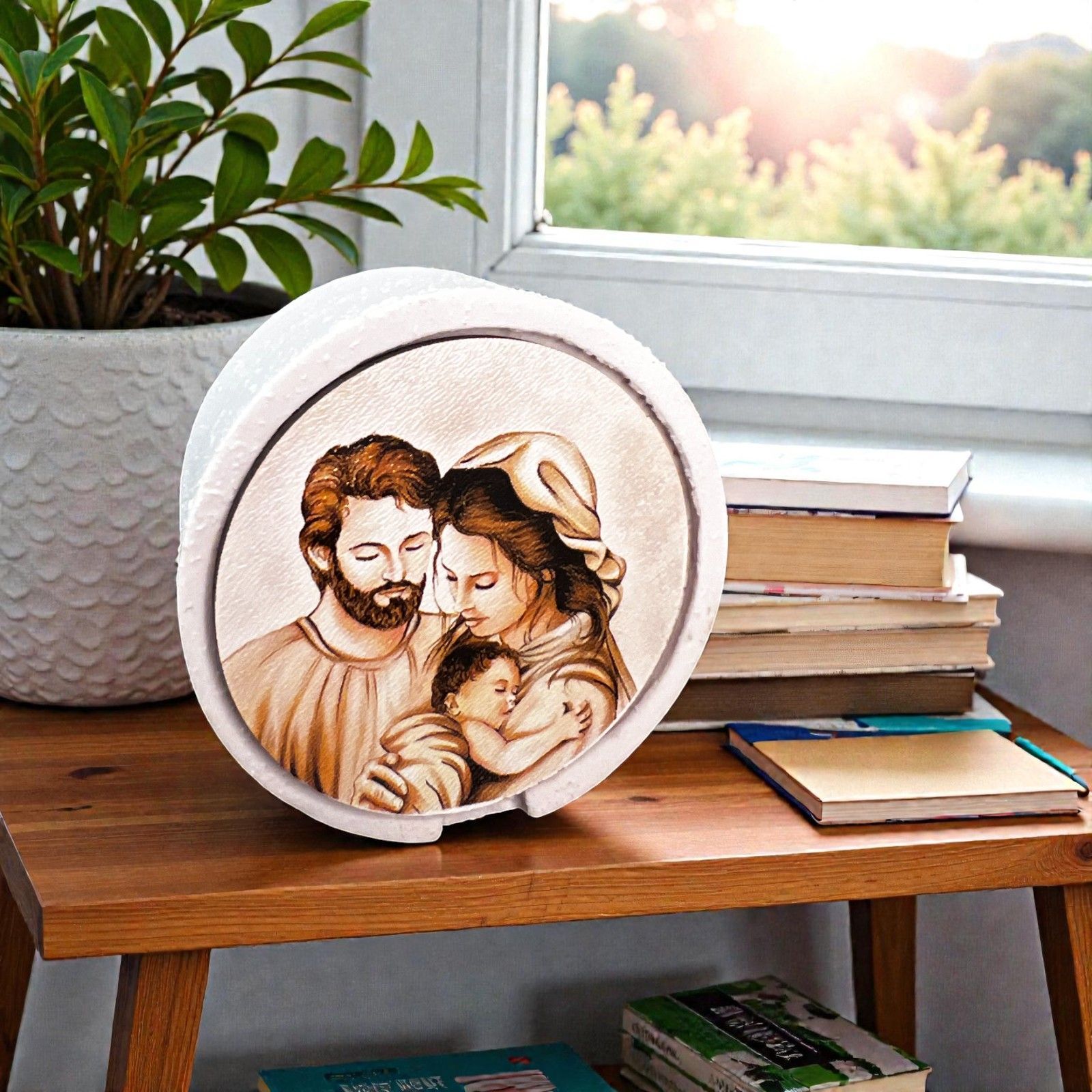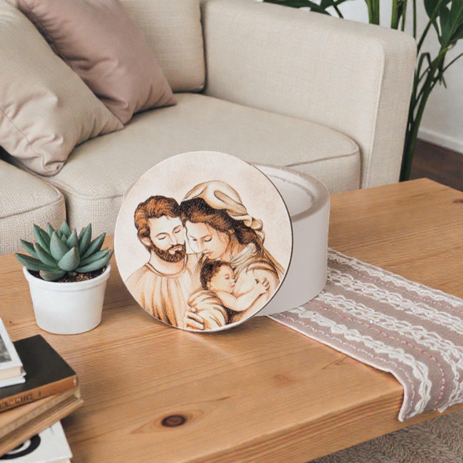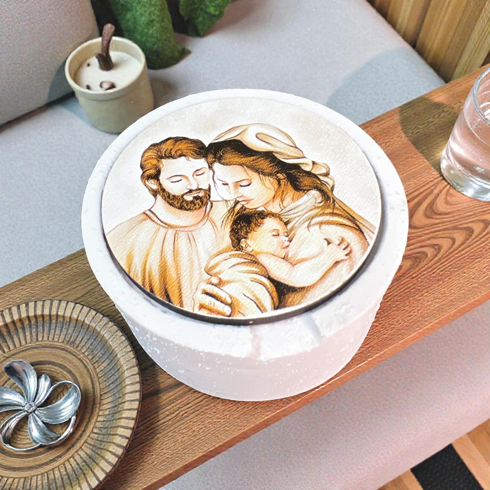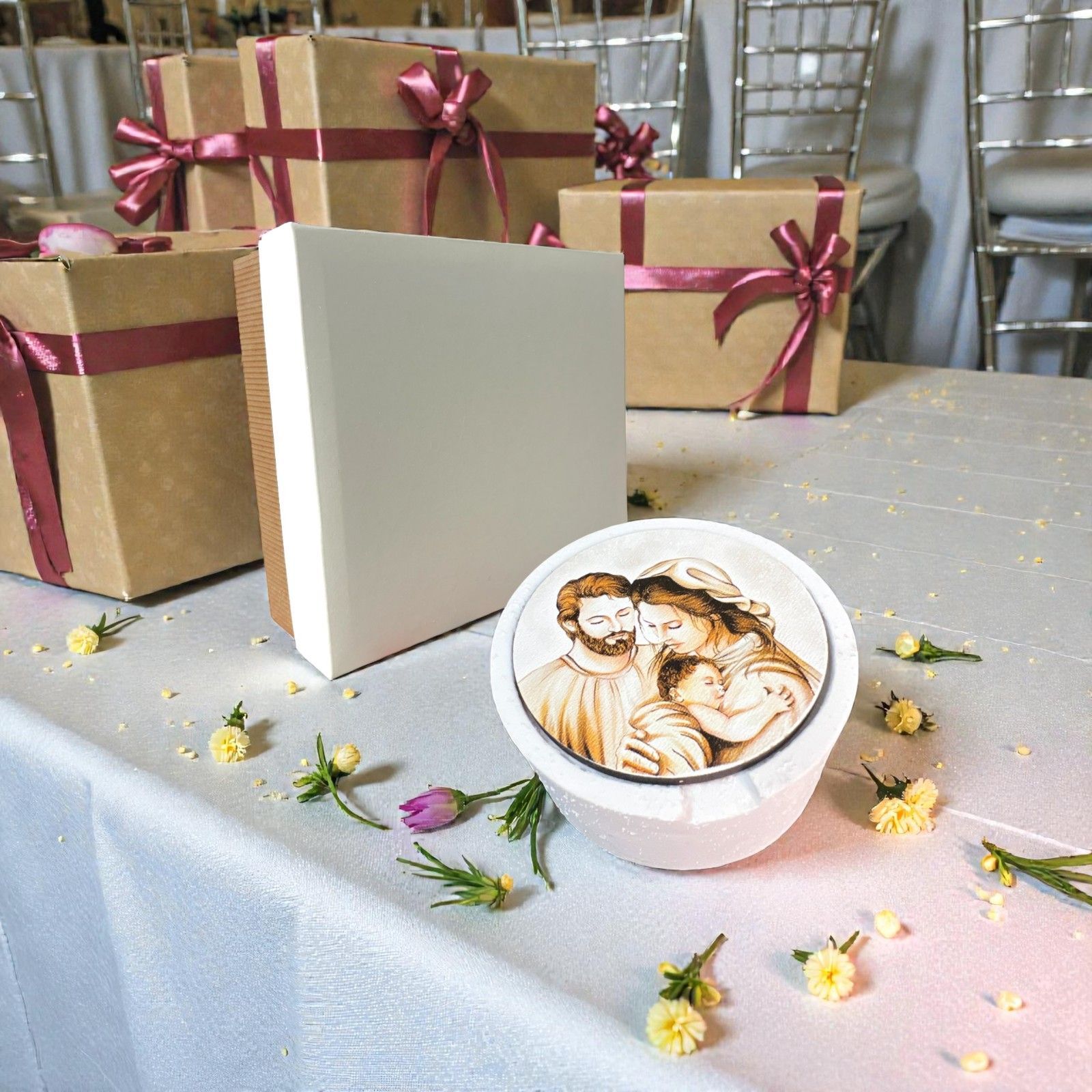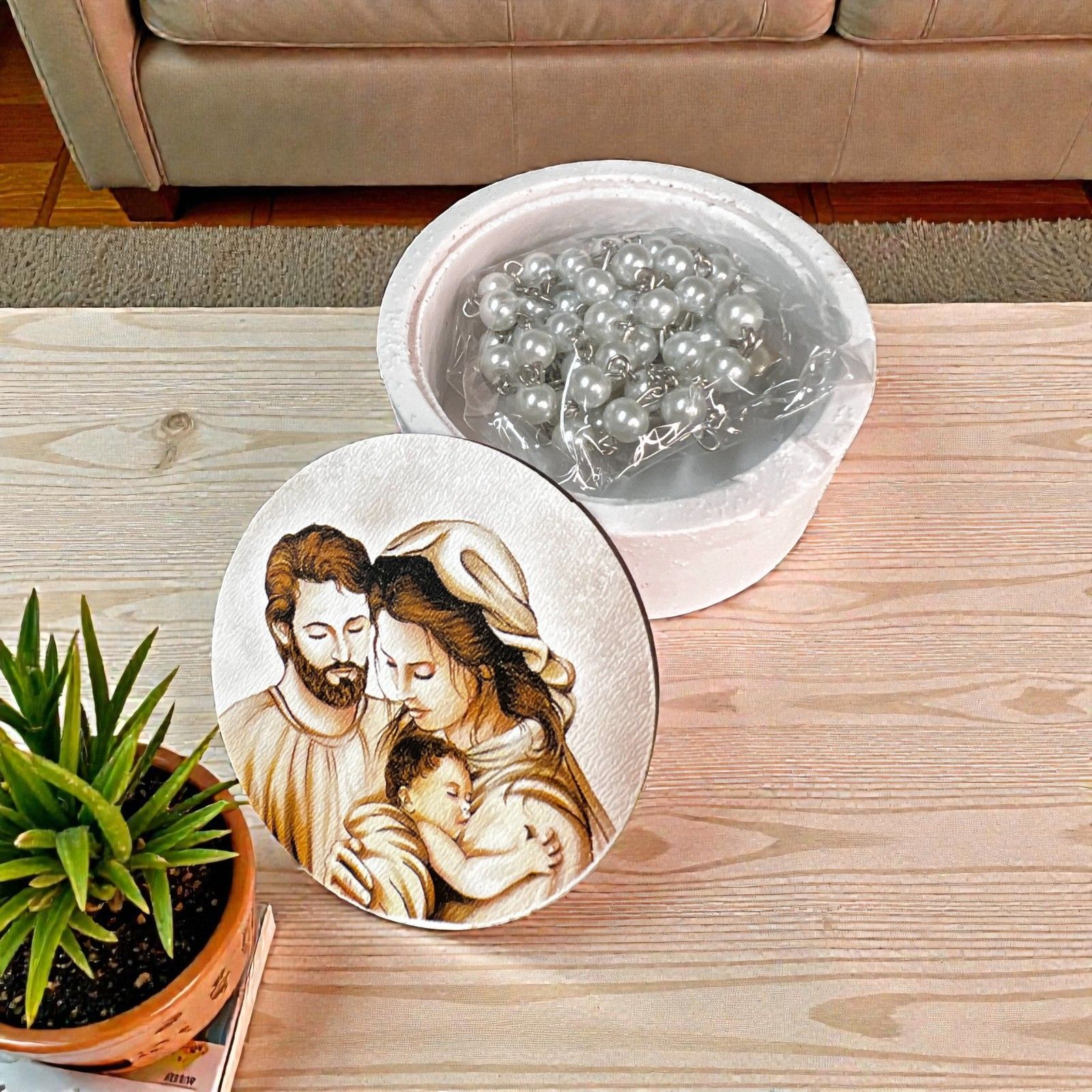 Realizzata in resina effetto pietra, questa scatolina bianca è un meraviglioso esempio di eleganza e raffinatezza. Il coperchio rotondo è adornato da una stampa sui toni del tortora che ritrae la Sacra Famiglia, rendendola un pezzo unico da conservare con cura. Ogni dettaglio è concepito per far risaltare il significato profondo di questo regalo, rendendolo una delle migliori bomboniere battesimo, bomboniere comunione e bomboniere cresima.