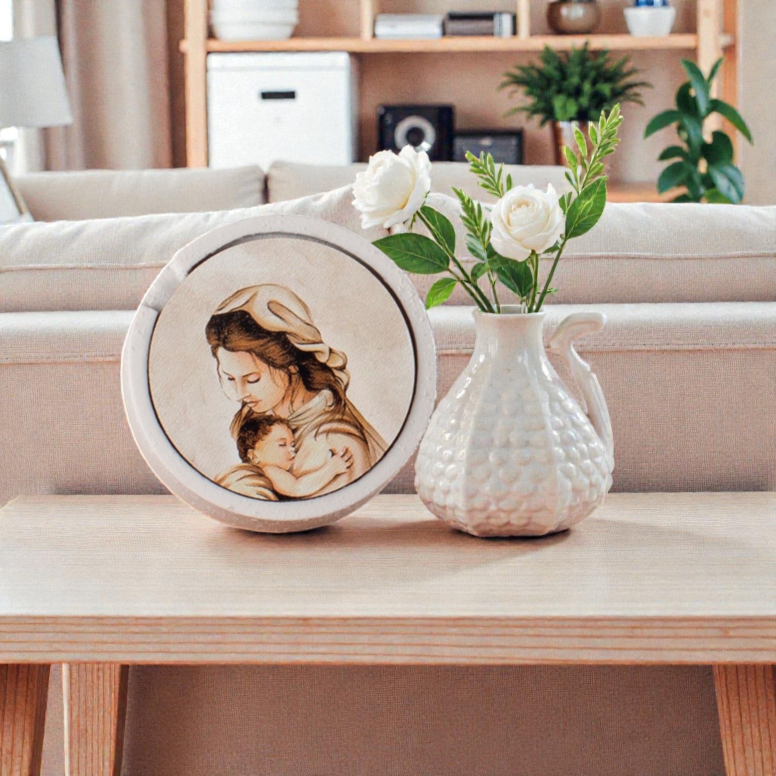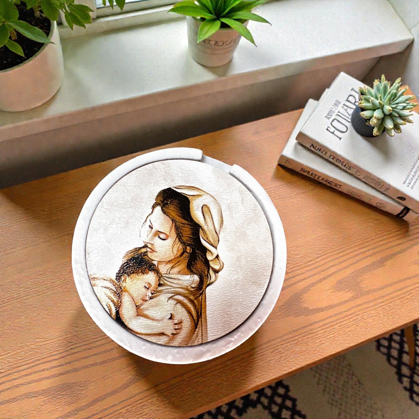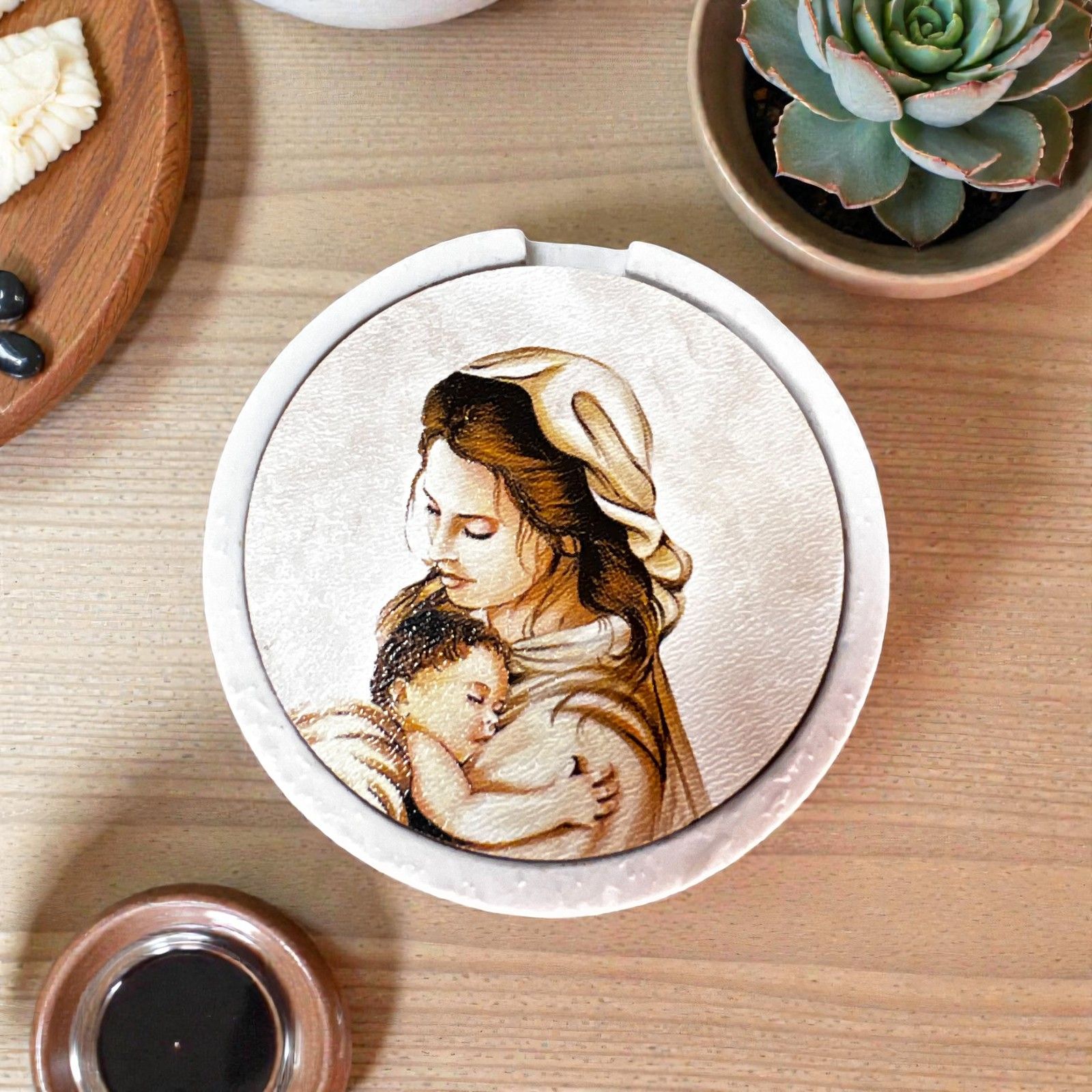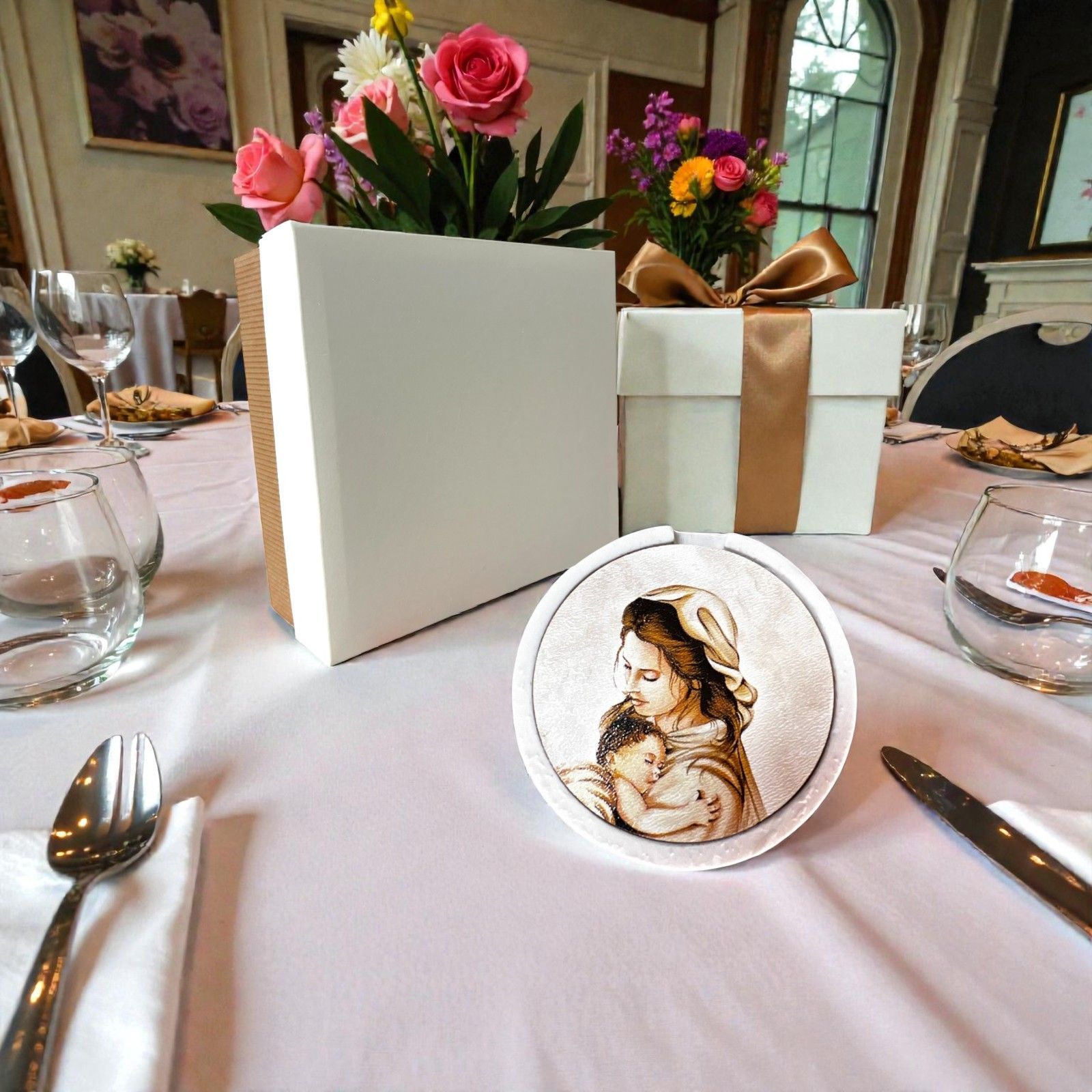 La scatolina porta rosario, dalla forma tonda e dal coperchio decorato con una delicata stampa nei toni del tortora, raffigura la Madonna con bambino, simboleggiando un legame speciale tra madre e figlio. Ogni dettaglio è curato per riflettere la sacralità di questo momento unico, offrendo un ricordo che durerà nel tempo.