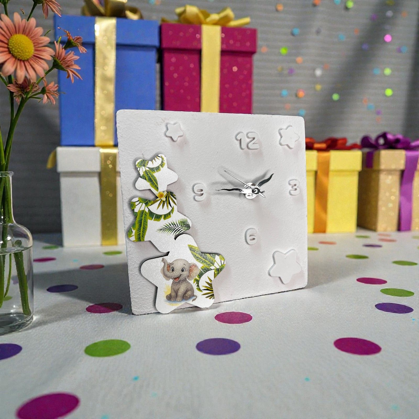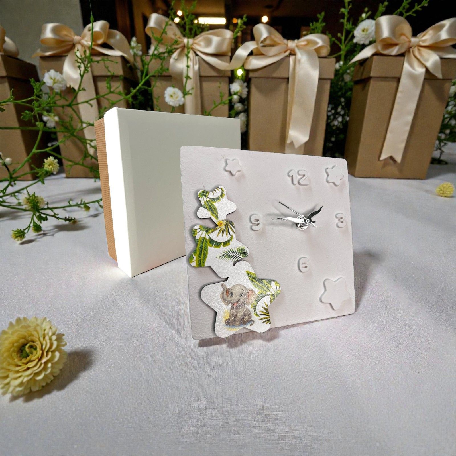Scopri l'emozione di un momento unico con il nostro Orologio con Elefante e Stelle, una delle più affascinanti bomboniere battesimo e bomboniere comunione che puoi scegliere per celebrare eventi indimenticabili. Questo orologio da tavolo non è solo un elegante accessorio, ma un simbolo di amore e protezione, ideale per accompagnare i tuoi cari in un viaggio di crescita e scoperta.