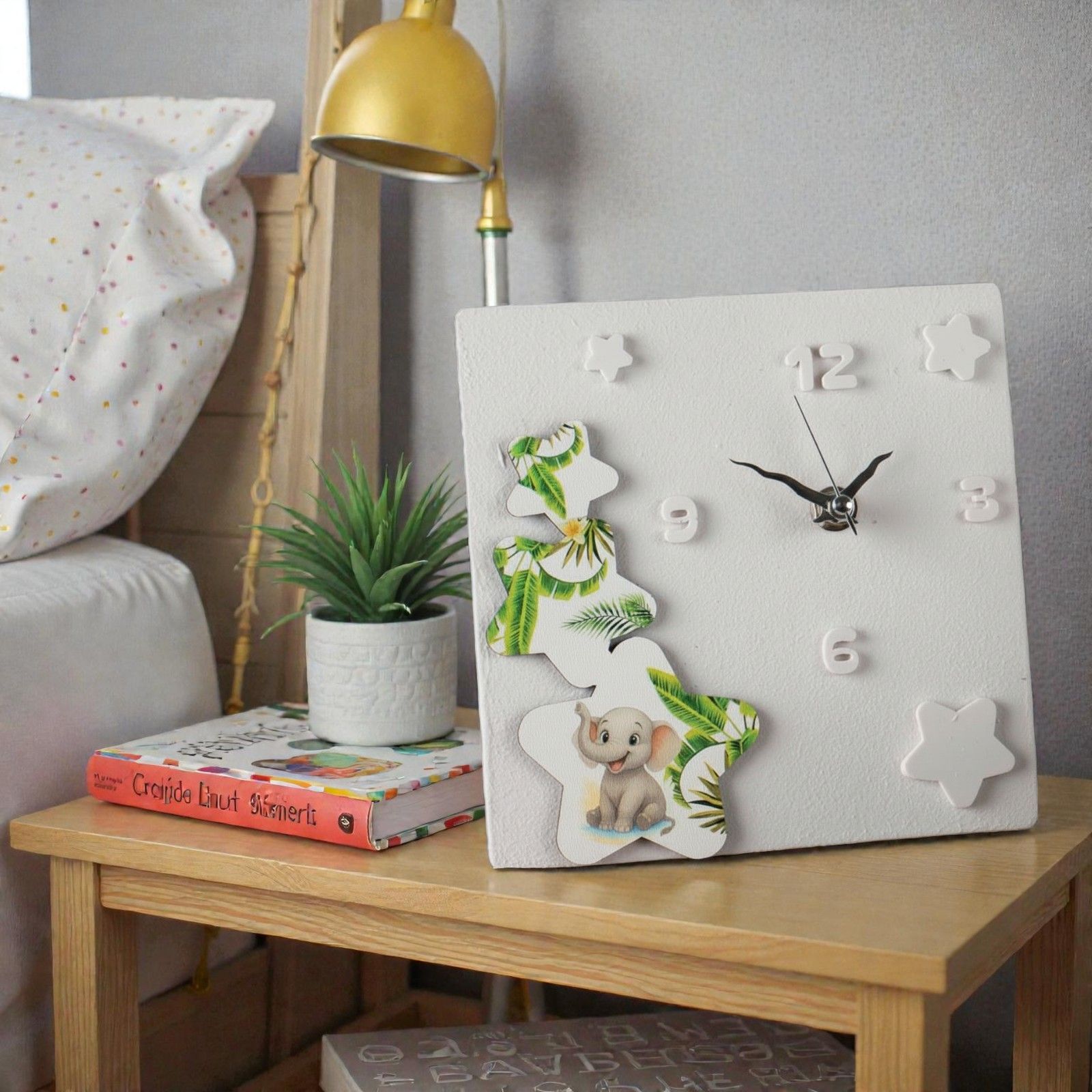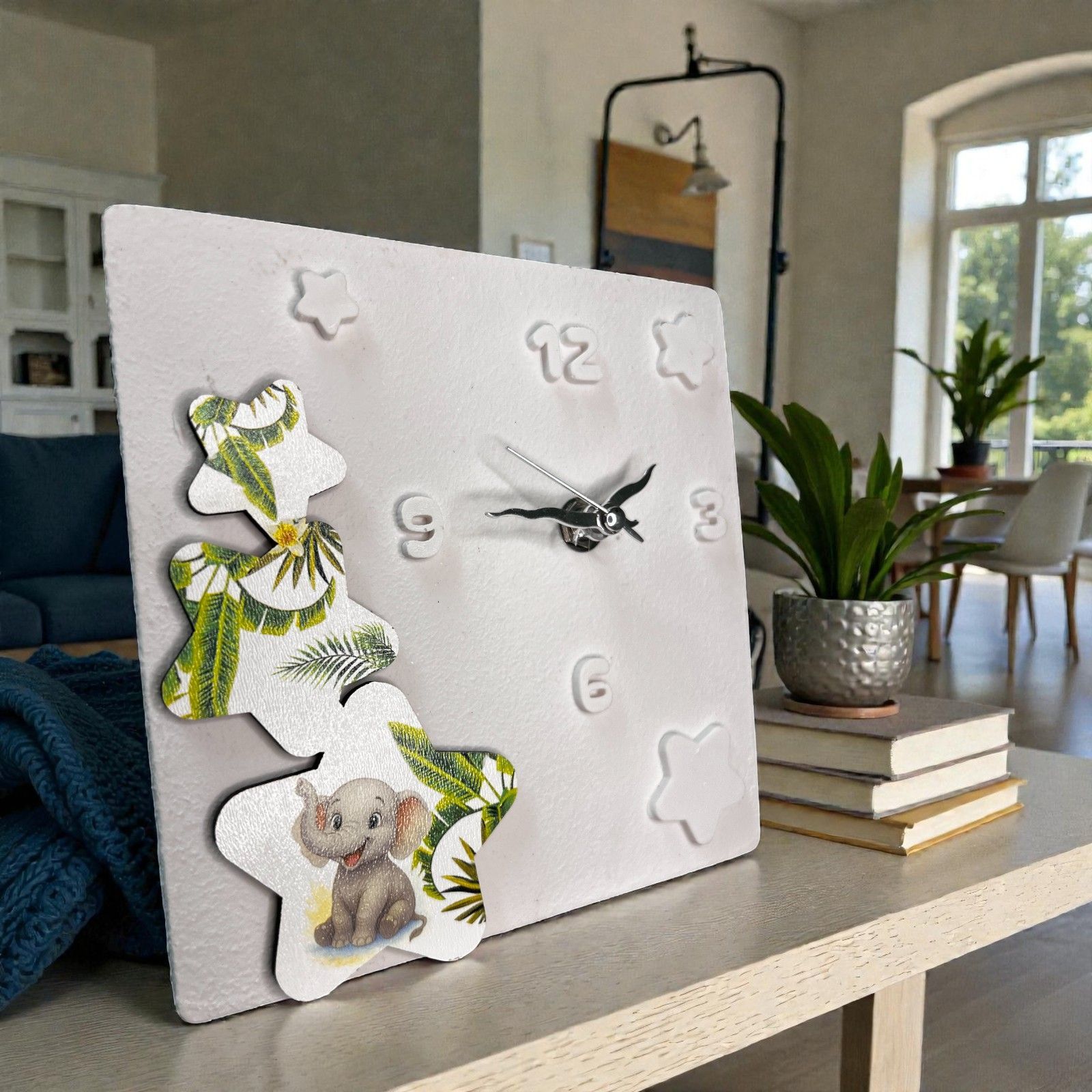 Realizzato in pregiata resina effetto pietra, il nostro orologio si distingue per il suo colore bianco, perfetto per ogni tipo di arredamento. Le stelle e i numeri in rilievo e le lancette argentate catturano la luce, creando un effetto magico che arricchisce qualsiasi ambiente. Ogni dettaglio è pensato con cura, dall'applicazione in legno delle stelle al tenero elefantino, simbolo di fortuna e saggezza, fino alle foglie di palma verdi che aggiungono un tocco di freschezza e vitalità.