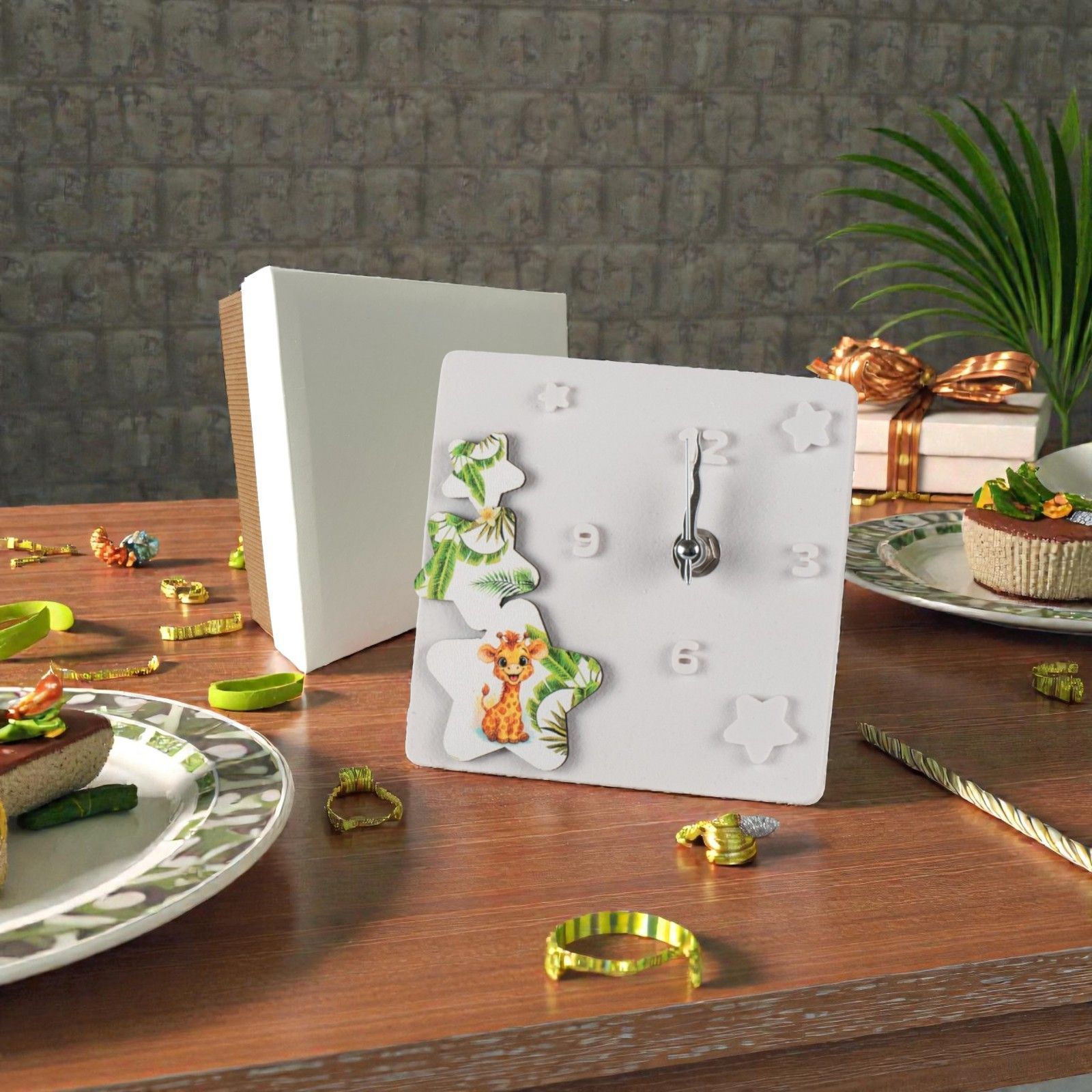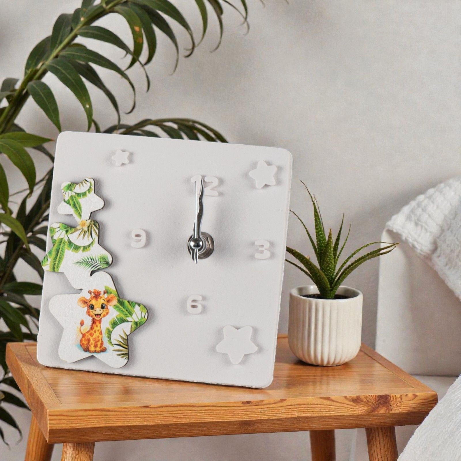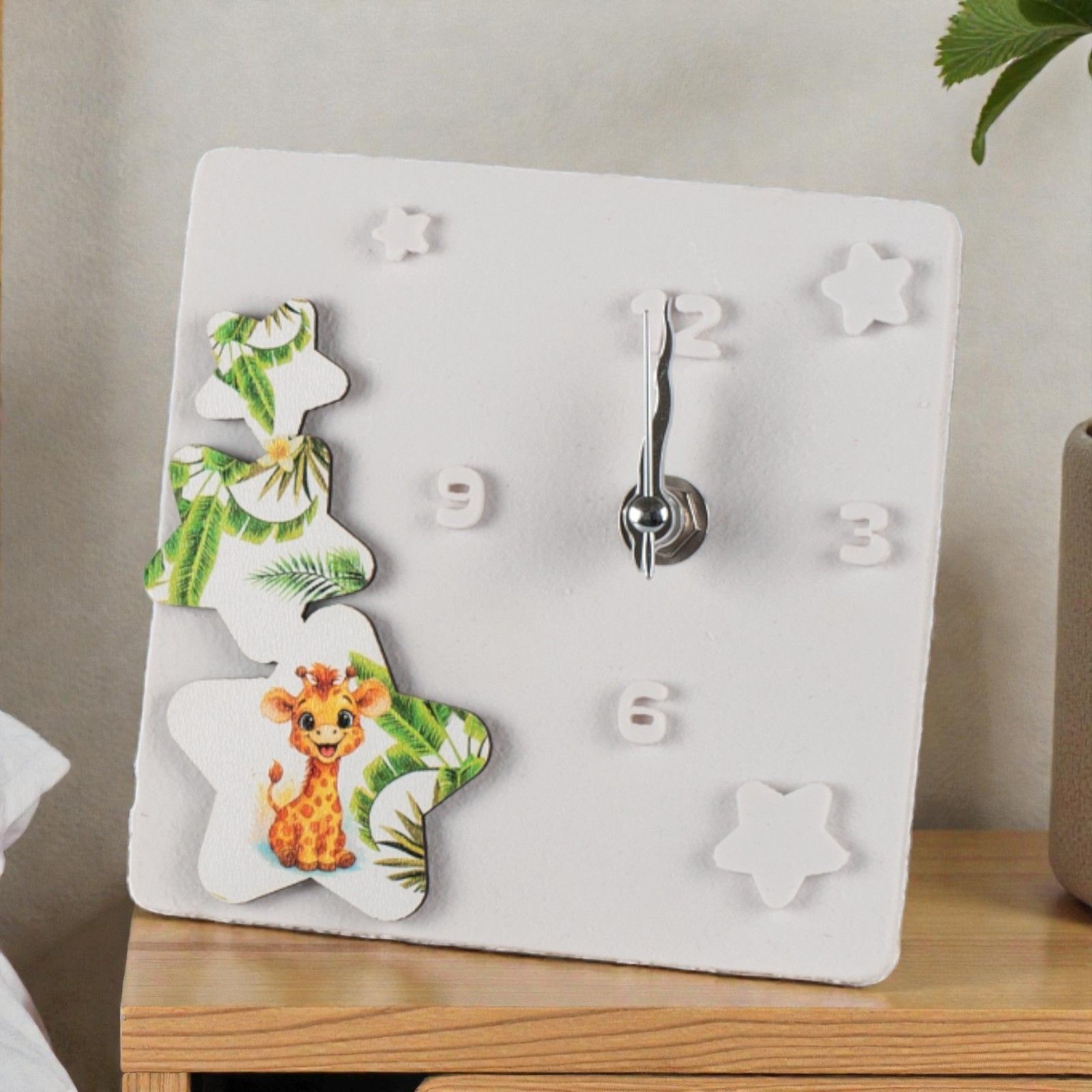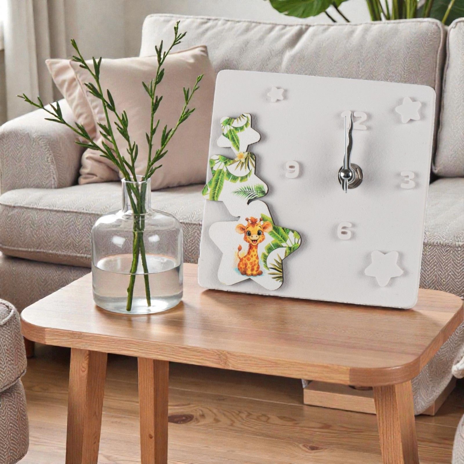 Realizzato in resina effetto pietra e decorato con stelline e numeri in rilievo, questo orologio si distingue per la sua eleganza e raffinatezza. Le lancette argentate e l'applicazione in legno di tre stelle con la dolce giraffa e foglie di palma verdi si uniscono per creare un design armonioso. È perfetto per ogni ambiente, portando un tocco di gioia e freschezza.