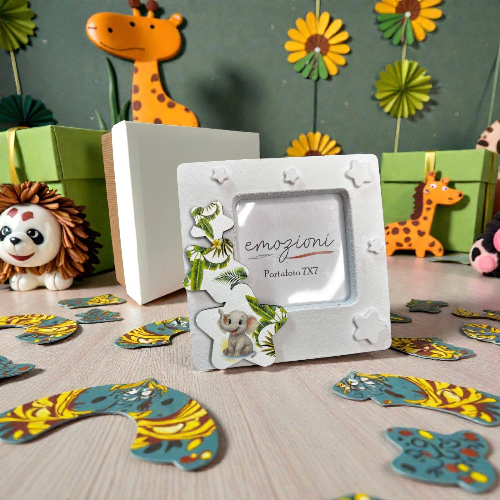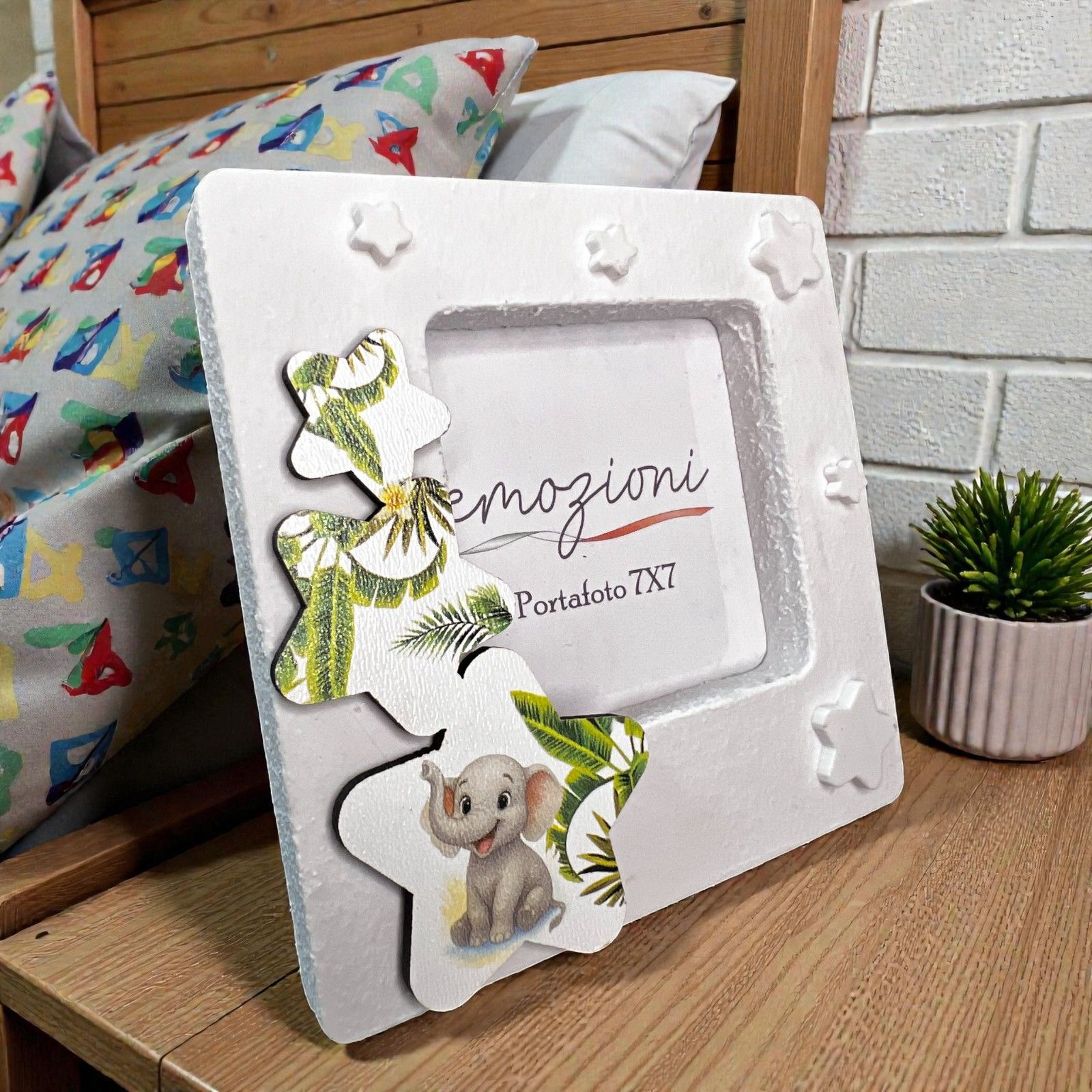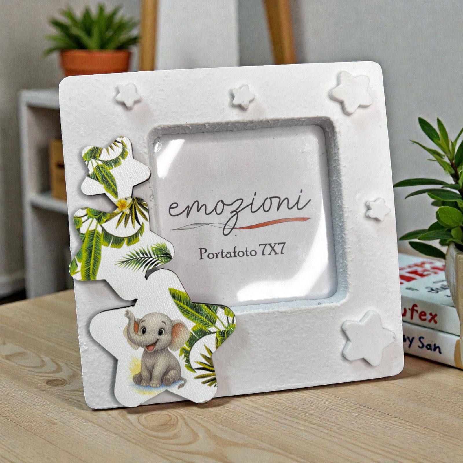 Il design raffinato di questo portafoto è arricchito da stelline in rilievo e da un adorabile elefantino, raffigurato su stelle in legno, ci ricorda l'importanza di custodire i ricordi più preziosi. Ogni volta che si guarda questa creazione, si rivivrà la gioia e le emozioni di quel giorno speciale. La presenza di foglie di palma verdi aggiunge un tocco di freschezza e vitalità, rendendo questo portafoto un elemento decorativo unico e significativo.