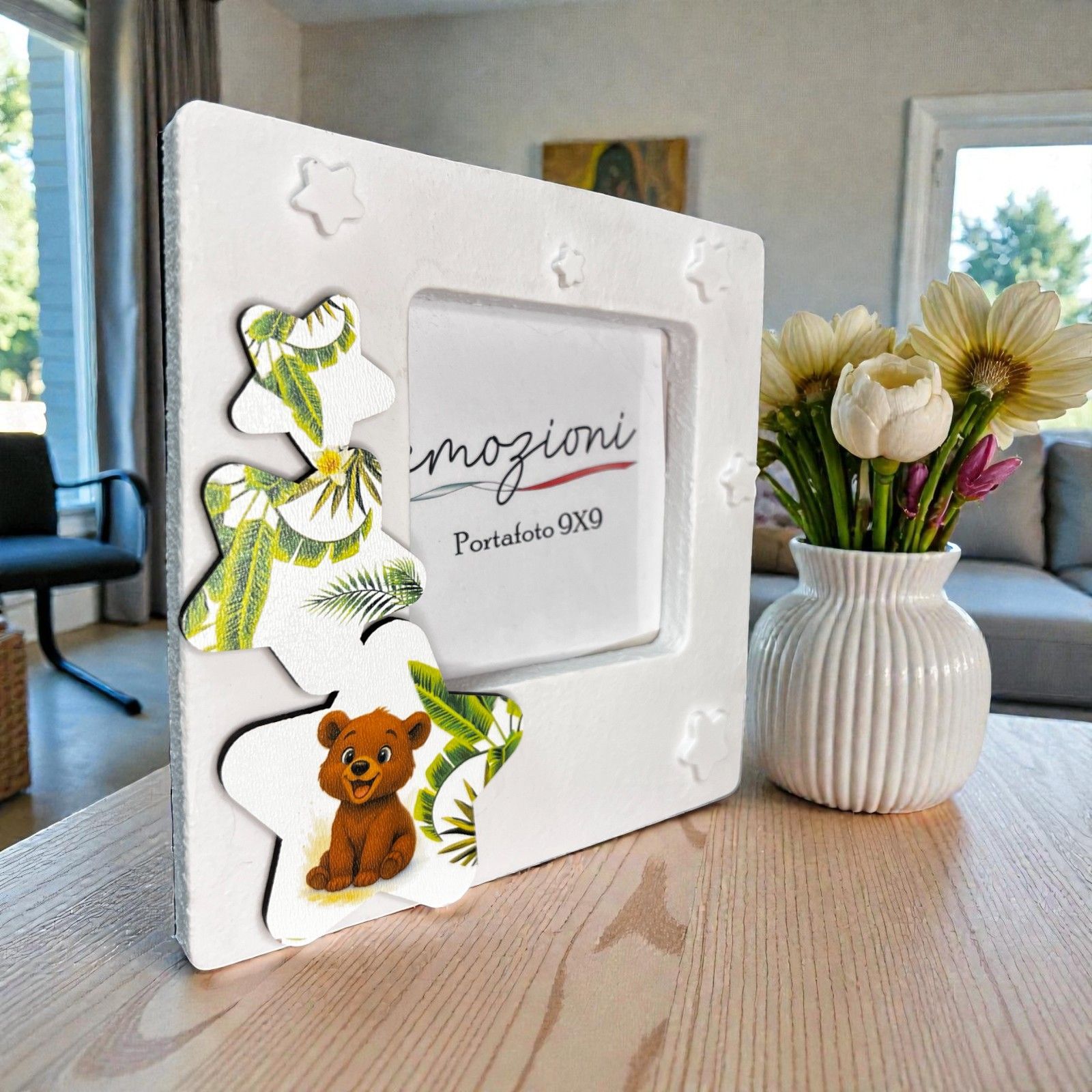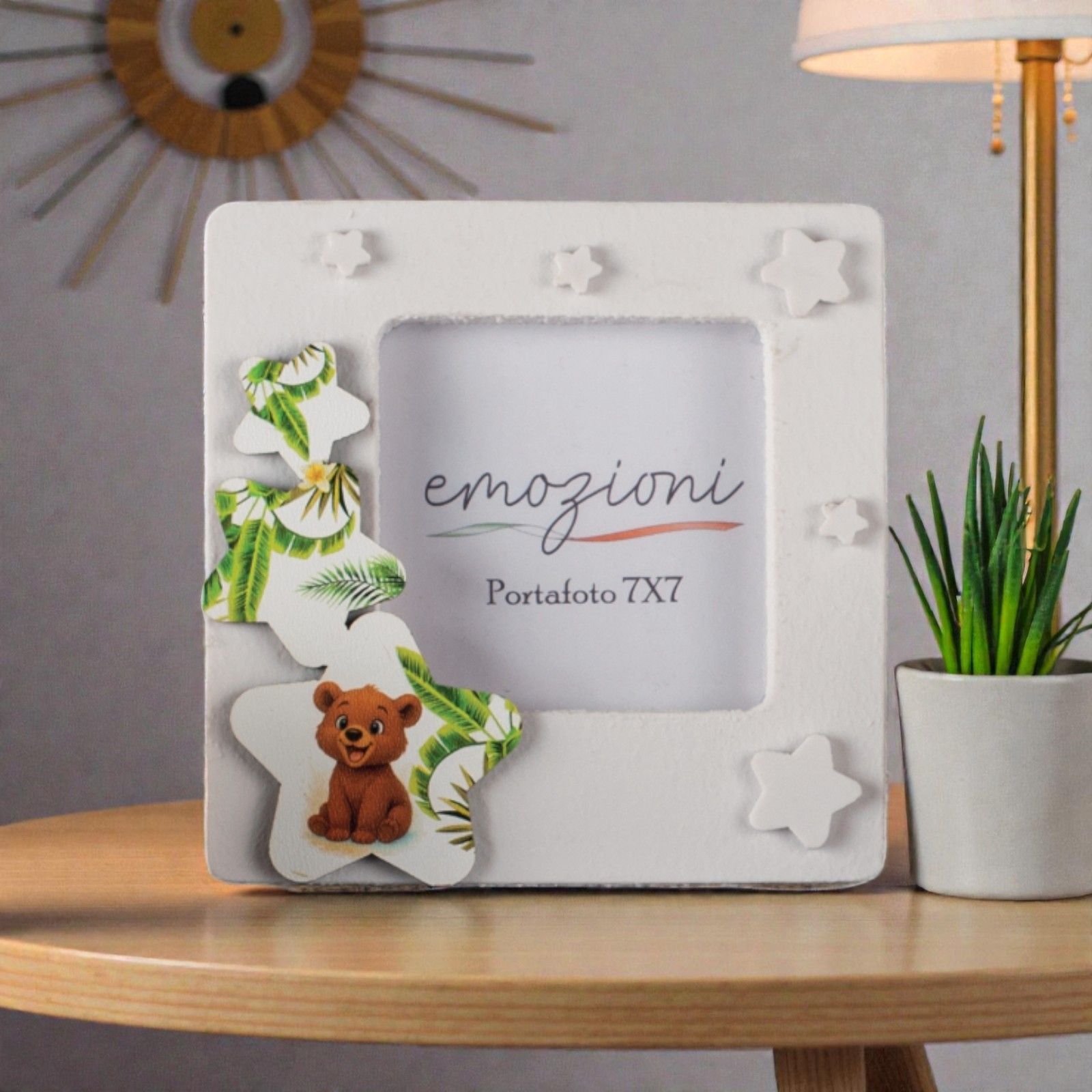 Realizzata in resina effetto pietra e decorata con adorabili stelline in rilievo, questa cornice presenta un'applicazione in legno con tre stelle su cui è raffigurato un dolce orsetto e fresche foglie di palma verdi. Questa creazione non è solo un portafoto, ma un’autentica opera d’arte che arricchisce ogni ambiente.
