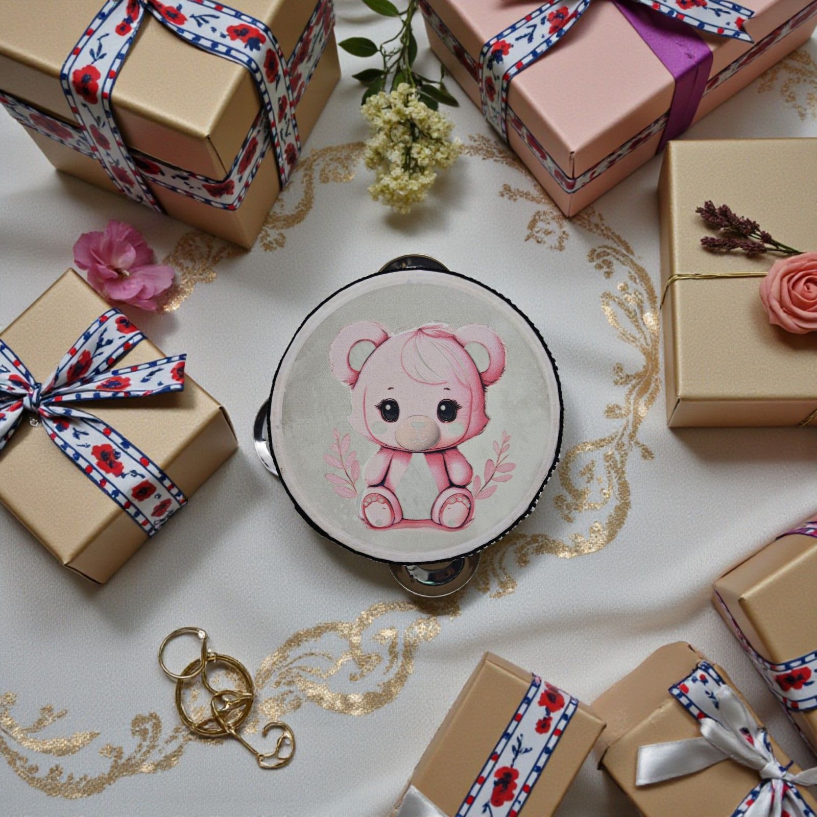 Non cercare oltre per le tue idee originali bomboniere: questa creazione affascinerà grandi e piccini, portando con sé il calore e l'affetto che solo un regalo pensato con amore può trasmettere. Scegli il tamburello con orsetto e rendi il battesimo della tua bimba un evento indimenticabile!