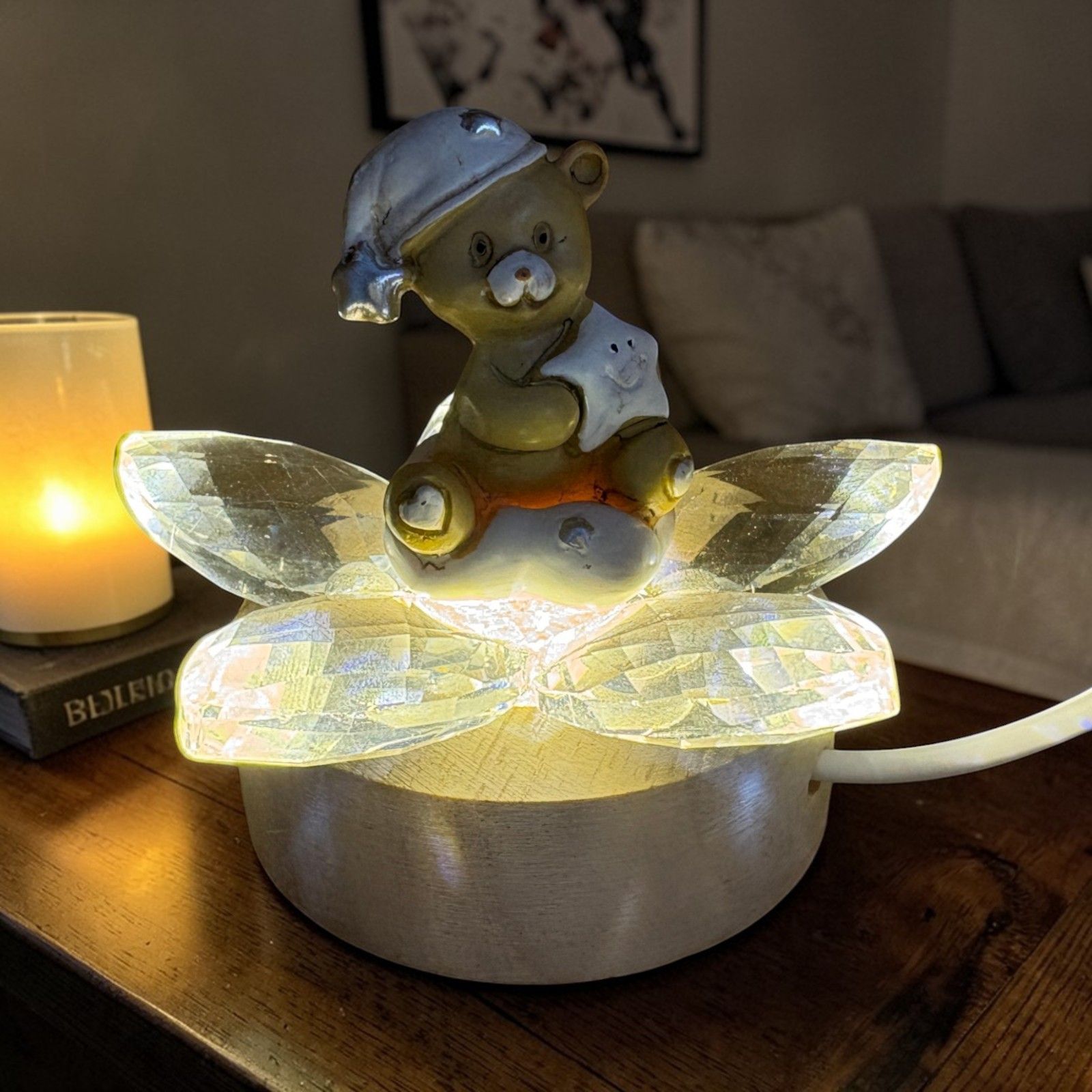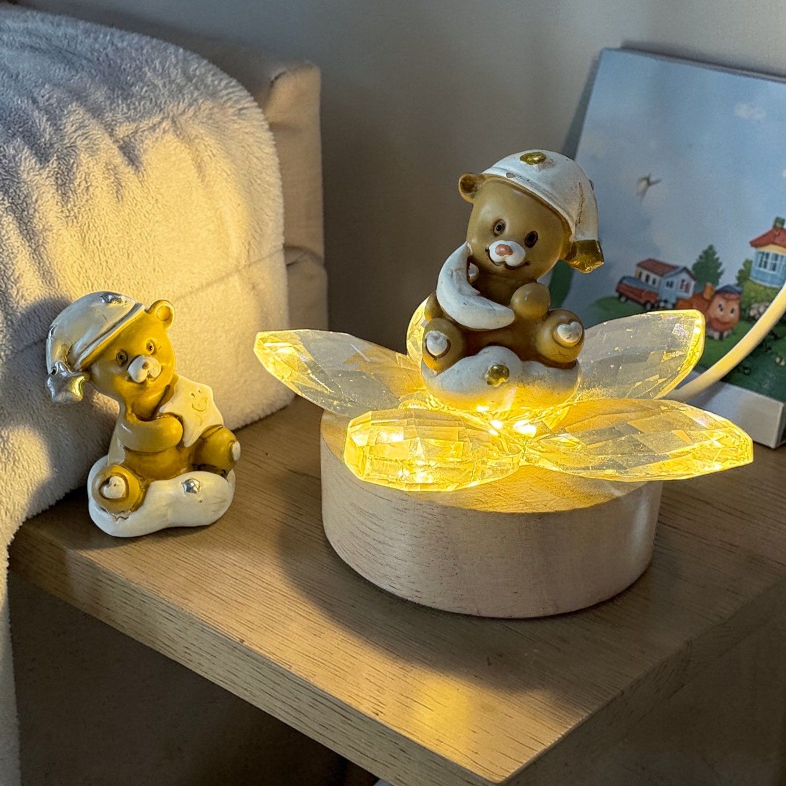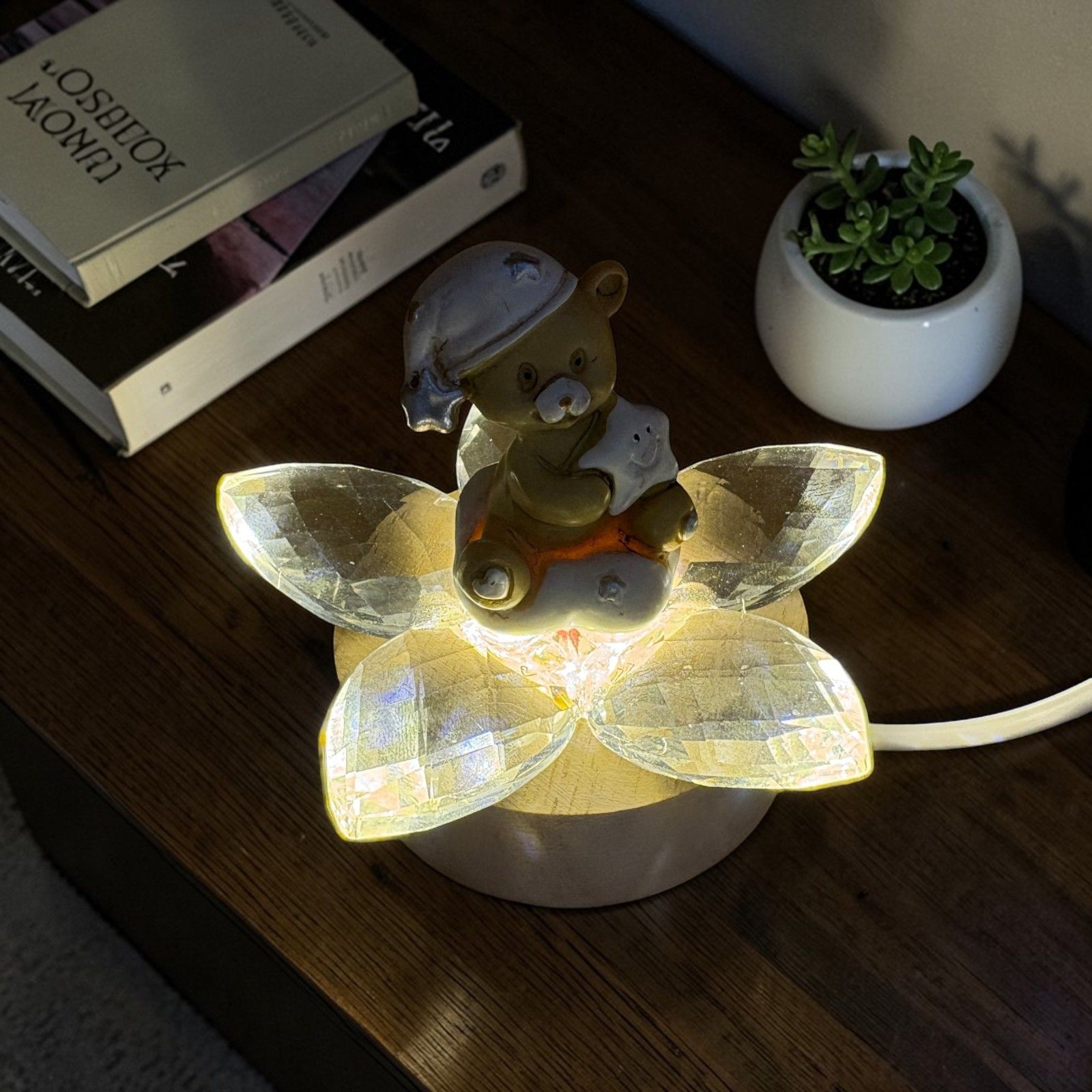 Rendi indimenticabile il battesimo o il primo compleanno con questa lampada led con fiore in cristallo. Il fiore illuminato dal led crea un bagliore delicato e raffinato, mentre l’orsetto su nuvola con cappellino a stelline e in mano luna o stella aggiunge un tocco di tenerezza che conquisterà tutti gli invitati.
