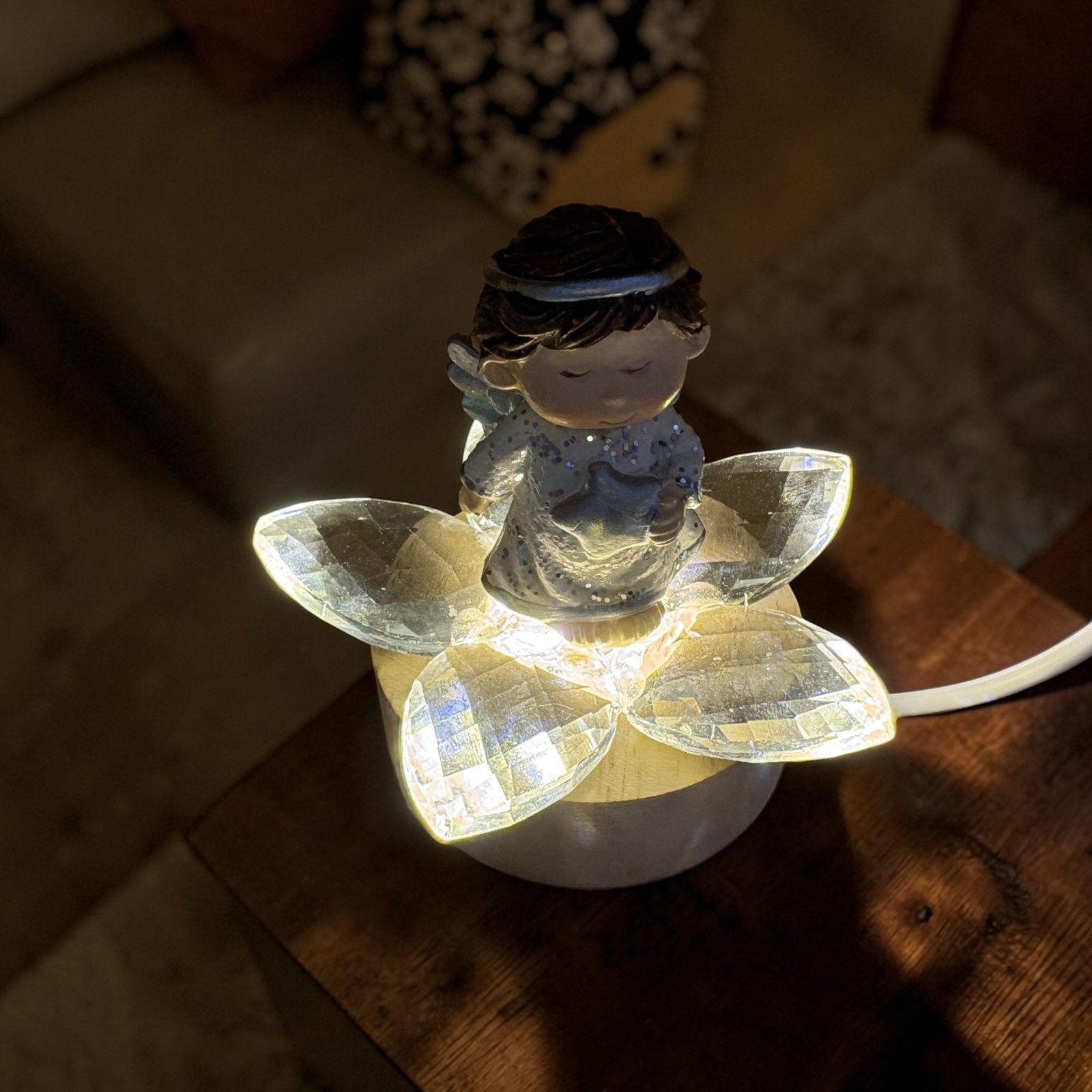 Accendi la magia del battesimo con questa simpatica lampada led con fiore in cristallo. Il fiore si illumina con un delicato bagliore, mentre il tenero angioletto glitterato, con ali color argento e un cuoricino o una stellina tra le mani, porta un sorriso immediato a tutti gli invitati. Perfetta come bomboniera battesimo bimba o battesimo bimbo!