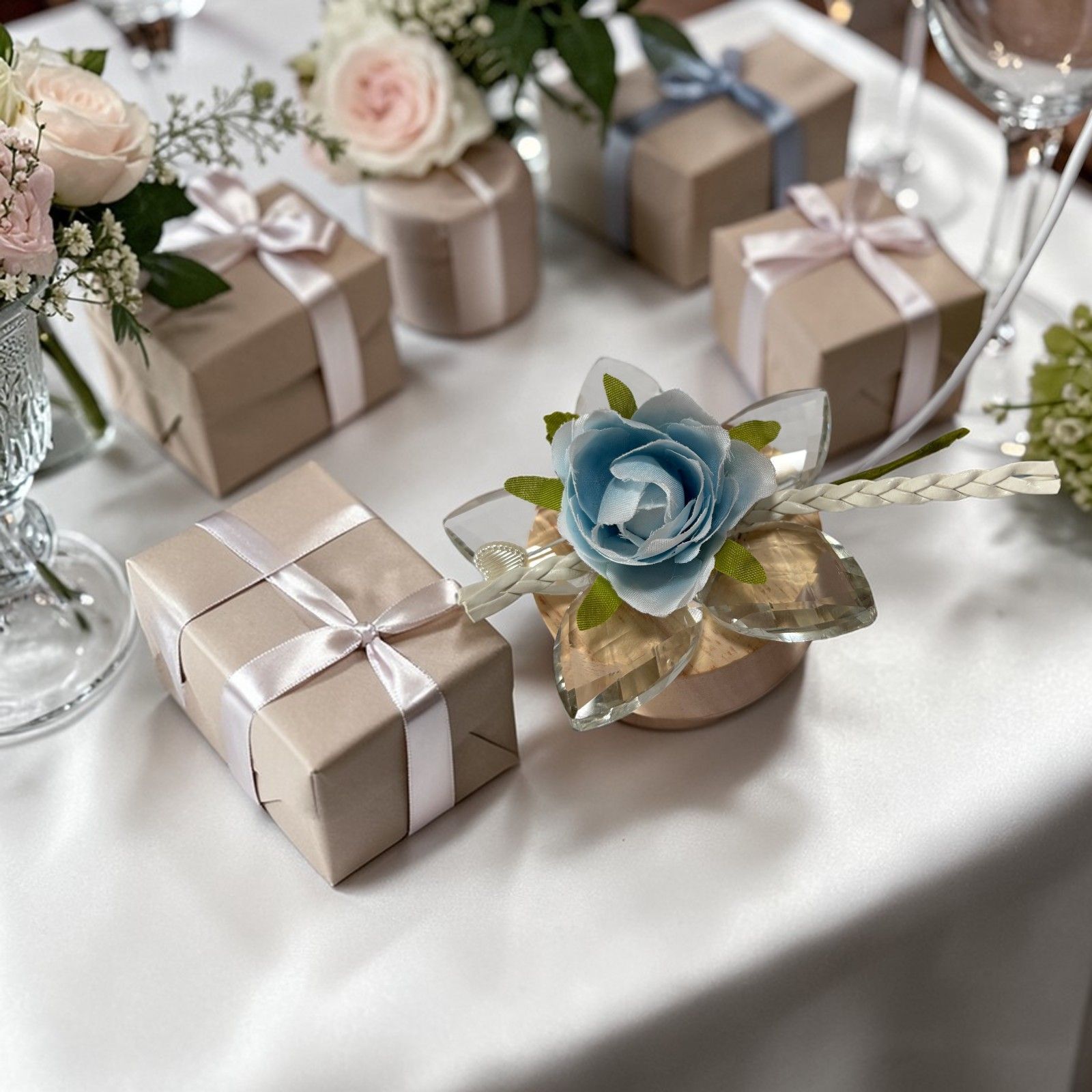 Questa bomboniera originale unisce magia e delicatezza: il cristallo cattura la luce diffondendola con dolcezza, mentre la rosa celeste simboleggia purezza, gioia e gratitudine. Ogni invitato riceverà un piccolo tesoro da custodire con affetto.