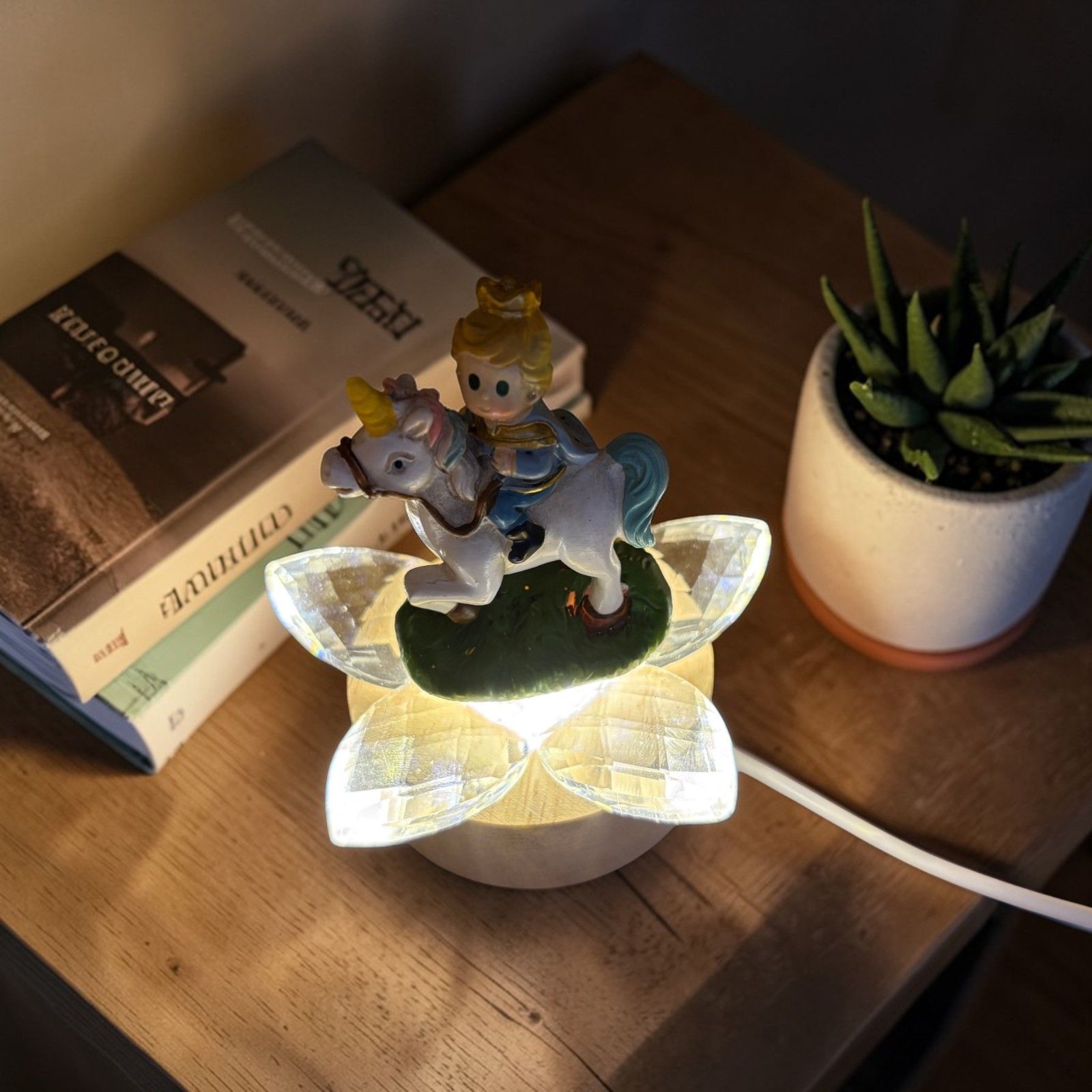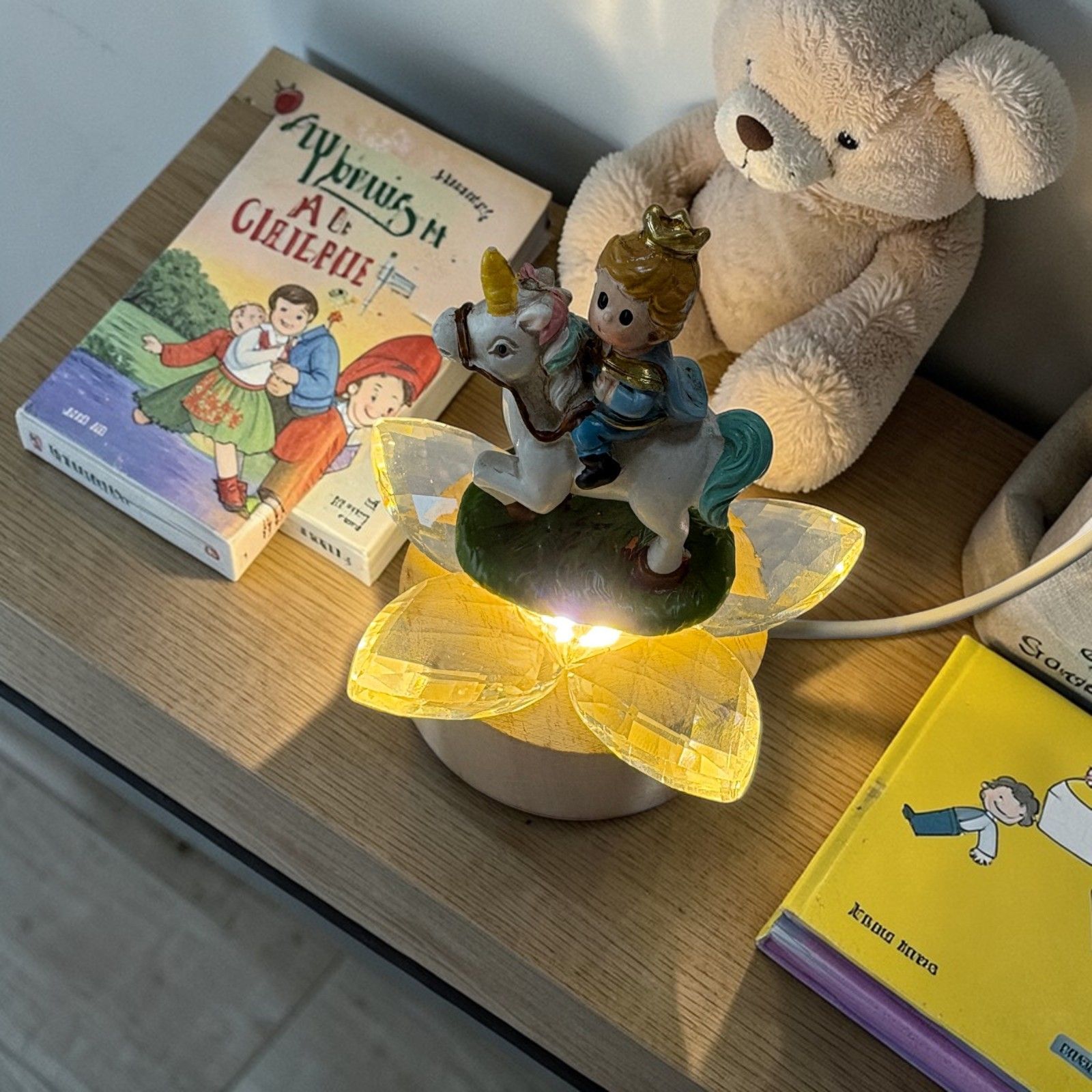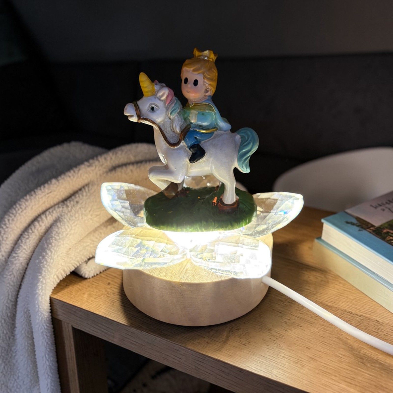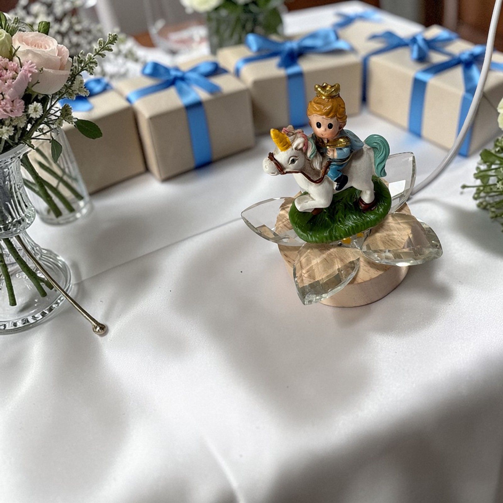 Rendi indimenticabile ogni evento speciale con questa delicata bomboniera. La lampada led illumina i petali in cristallo, esaltando la bellezza della statuina con il principino su cavallo, catturando lo sguardo e il cuore di ogni invitato.