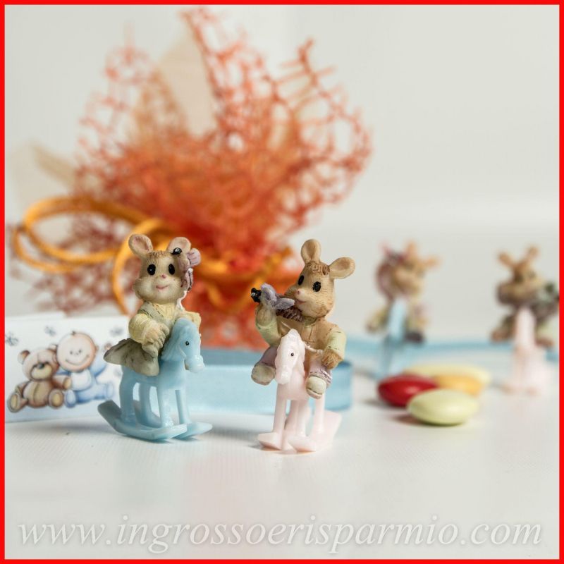 Ricordini nascita composti da piccoli oggettini in resina, raffiguranti teneri coniglietti in diverse posizioni che giocano con una farfalla, seduti su cavallucci a dondolo in plastica colorata rosa o celeste, a seconda del modello che preferisci e che potrai selezionare dal menù a destra.