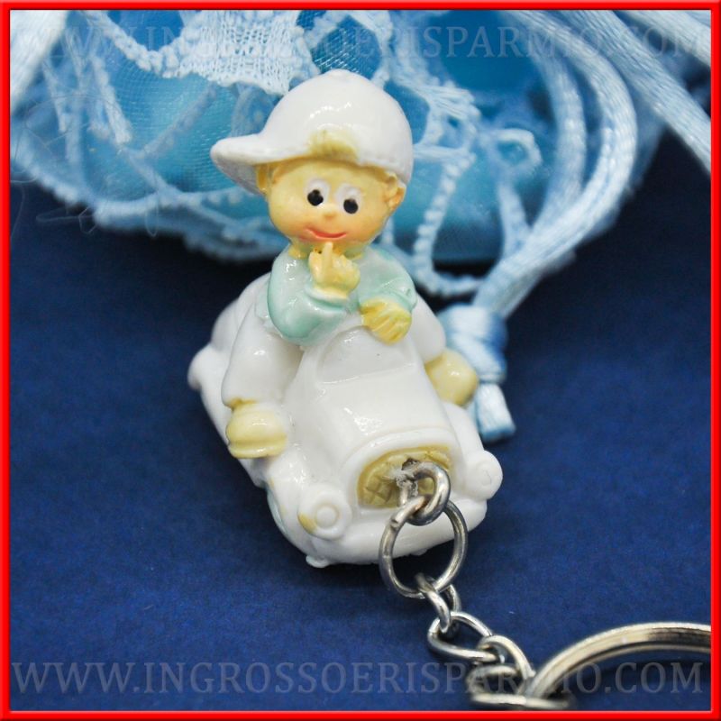 Portachiavi nascita bimbo in resina bianca lucida, raffiguranti un simpatico bambino in auto con cappellino/berretto con visiera ad un lato e maglietta azzurra.