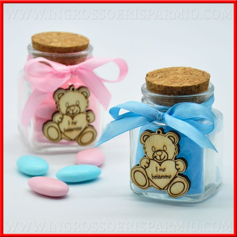 Barattoli vetro con orsetto in legno, idee bomboniere battesimo disponibili nella variante rosa e celeste, rispettivamente per bambina e bambino da donare agli invitati come originale confettata battesimo!