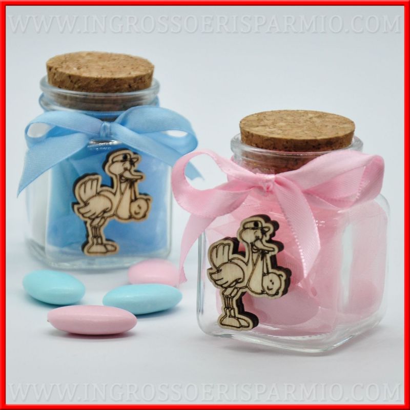Piccoli barattoli vetro con tappo in sughero personalizzati per l'evento nascita bambina e bambino. Ciascun vasetto è infatti decorato con un'applicazione in legno a forma di cicogna postina con fagotto nel becco e con un fiocco in raso, di colore rosa o azzurro a seconda del sesso del nascituro!