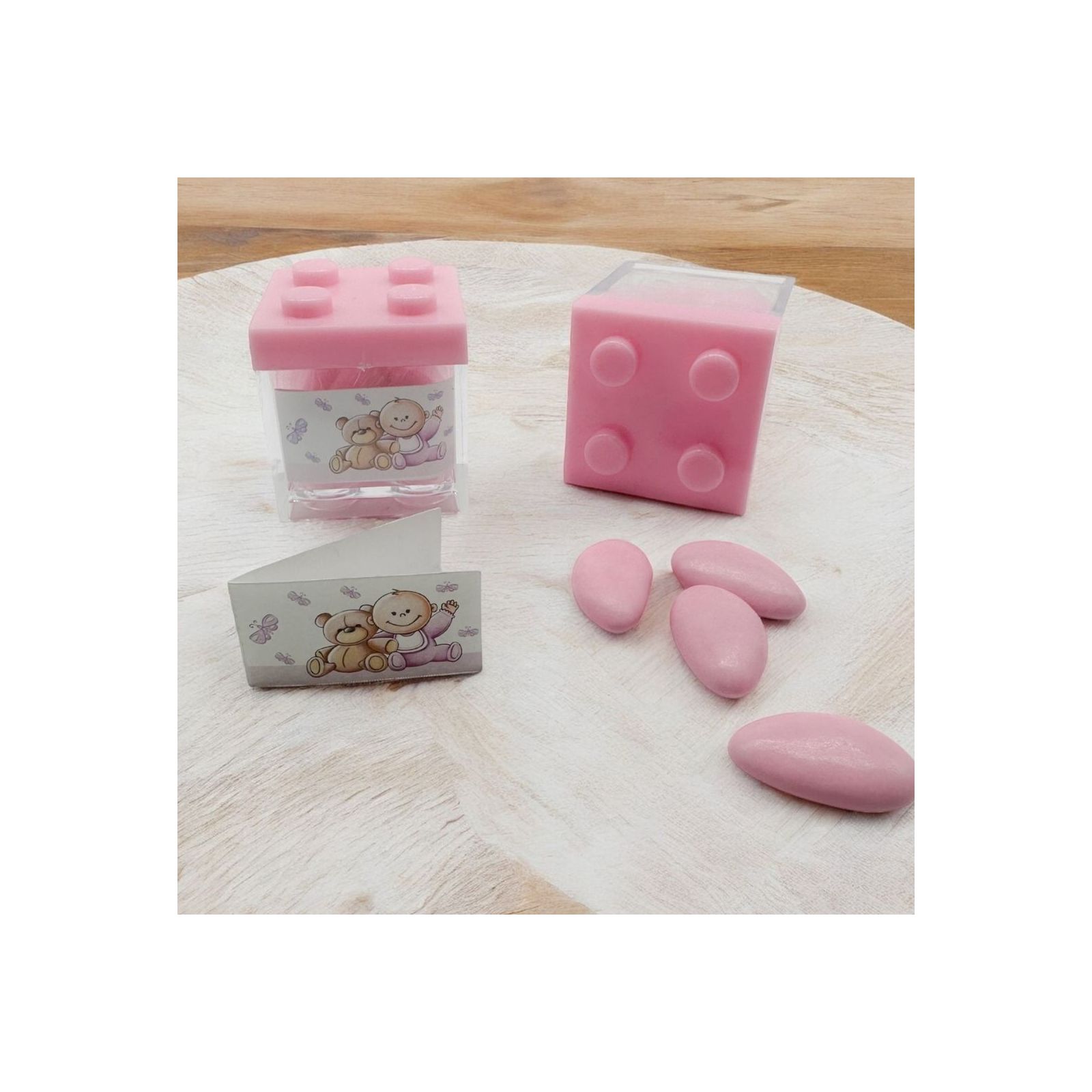 Scatoline Lego per confetti nascita, scatole cubo plexiglass trasparente con coperchio in plastica colorata rosa, indicata per eventi femminuccia. Il tappo raffigura fedelmente i famosi mattoncini Lego, costruzioni amate da adulti e bambini!