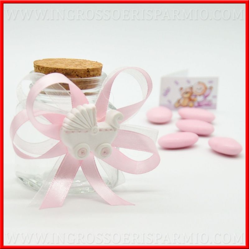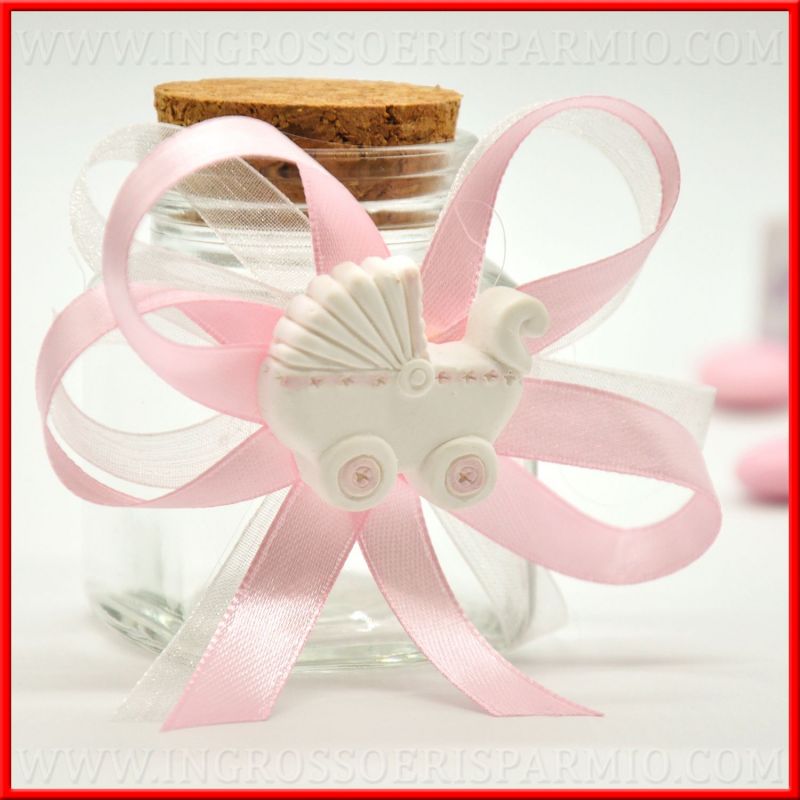 Preparati al meglio all'arrivo della tua bambina con bomboniere per nascita originali. Barattoli vetro con tappo in sughero decorati con fiocchi di nastro in raso ed organza rosa con al centro gessetti nascita a forma di carrozzina, con dettagli di colore rosa!