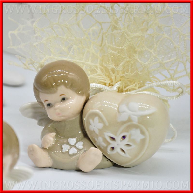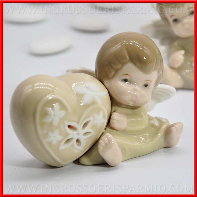 Angioletto bomboniera in porcellana bianca e beige, raffigurato in posizione seduta accanto ad un cuore, all'interno del quale si trova un led con luce multicolor, che illumina la statuina, trasformando queste bomboniere battesimo angeli in piccole luci notturne.