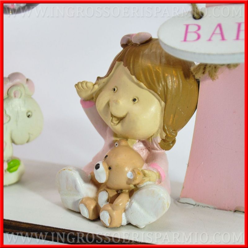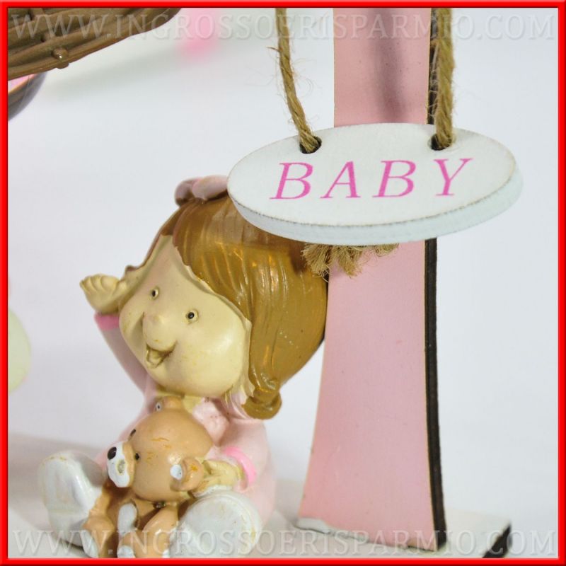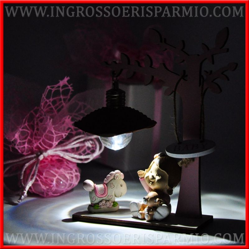 Lucetta notturna, con accensione led a batteria, decorativa: un albero in legno rosa regge su un ramo una piccola lampadina, con interruttore sovrastante. Sulla base è posizionata una tenera bambina in resina sorridente, con orsetto peluche ed un cavalluccio a dondolo. Una targhetta con la scritta baby è appesa all'albero.