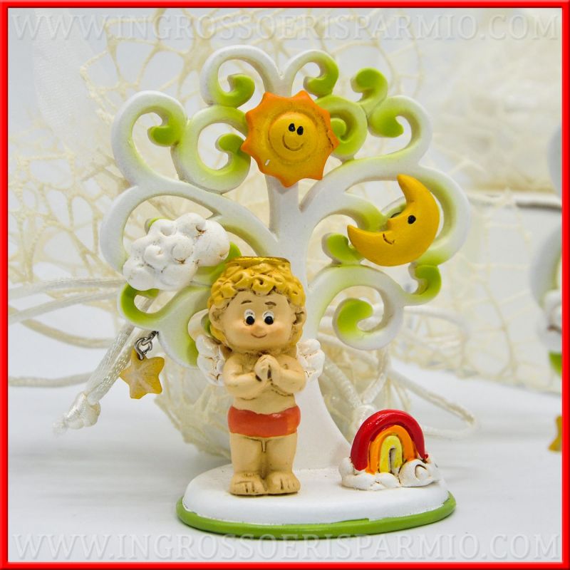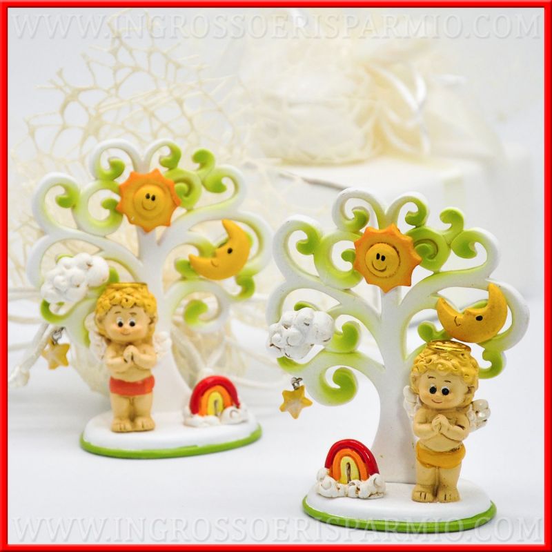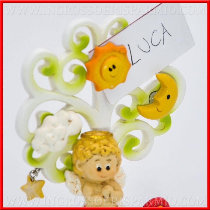 L'importante simbolo albero della vita è stato rivisitato in una versione indicata per bambini, per bomboniere battesimo, associandolo ad una statuina angioletto a mani giunte con un piccolo arcobaleno accanto (in 2 posizioni differenti, assortite). Ai rami dell'albero sono applicate piccole calamite a forma di nuvola, sole e luna ed un ciondolo a forma di stellina. Attraverso i magneti in resina potranno essere applicate foto, bigliettini e memo, realizzando un portafoto battesimo originale!