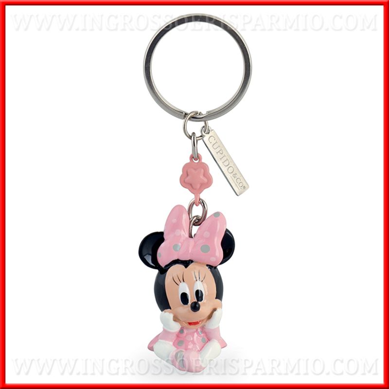 Portachiavi bomboniere Disney baby con ciondolo Minnie realizzato in resina lucida con catenina e anello in metallo argentato. Alla catenina portachiavi è applicata una piccola targhetta in metallo sulla quale è inciso da un lato "Disney" e dall'altro "Cupido" ossia la casa fornitrice del marchio Disney bomboniere.