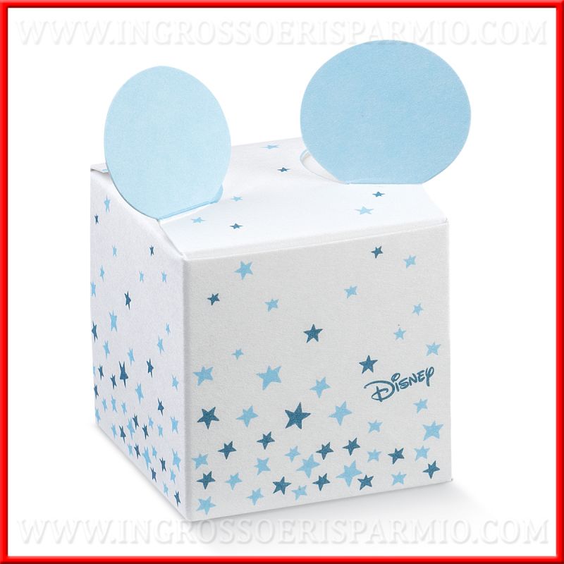 Cubo in cartoncino celeste e bianco decorato con stelline e divertenti orecchie Topolino azzurre che fuoriescono dalla scatolina portaconfetti.