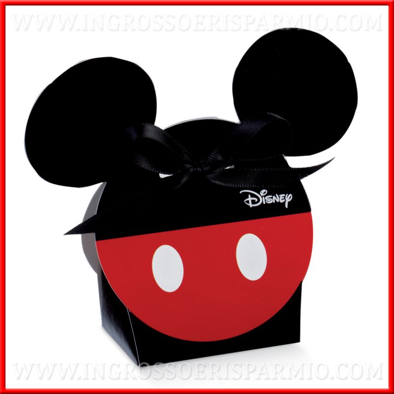 Ogni scatoletta si compone di due sagome faccia Topolino in cartoncino nero e rosso ed un vano portaconfetti al centro. Le due facce sono tenute insieme da un nastrino (NON INCLUSO).