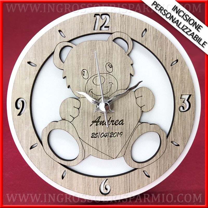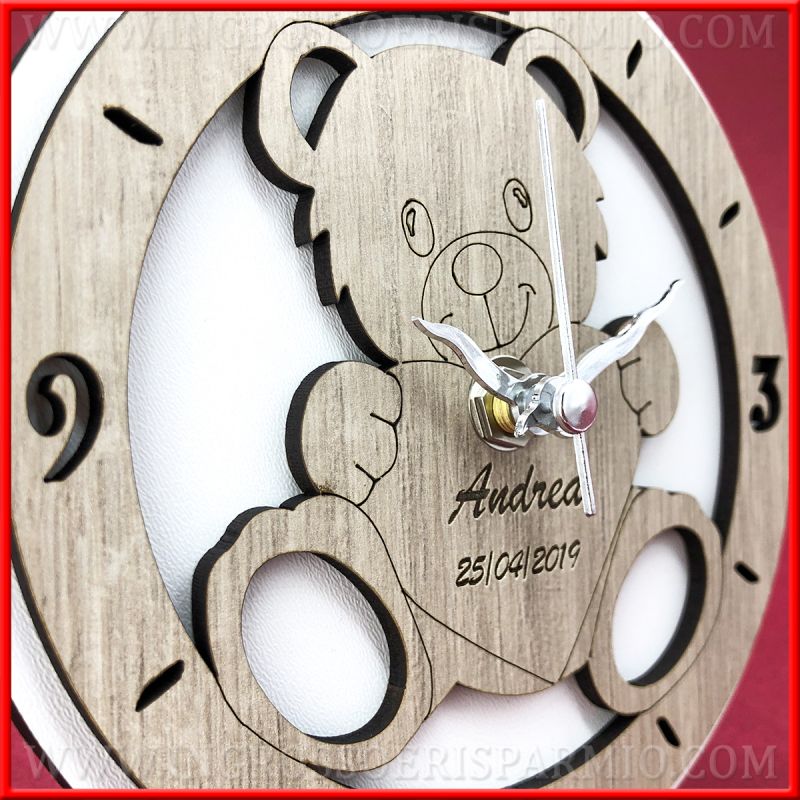 Orologio in legno a sfondo bianco con soggetto orsetto, raffigurato in posizione seduta con un cuore tra le braccia, anch'esso in legno color tortora. Utilizza l'orologio da tavolo o da muro, grazie alla presenza di un piede d'appoggio amovibile e ad un supporto per l'affissione alla parete.