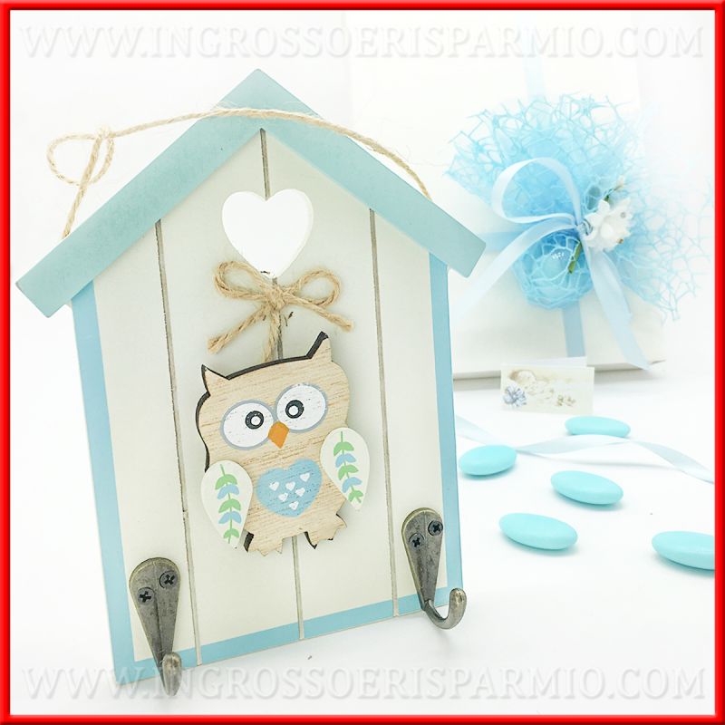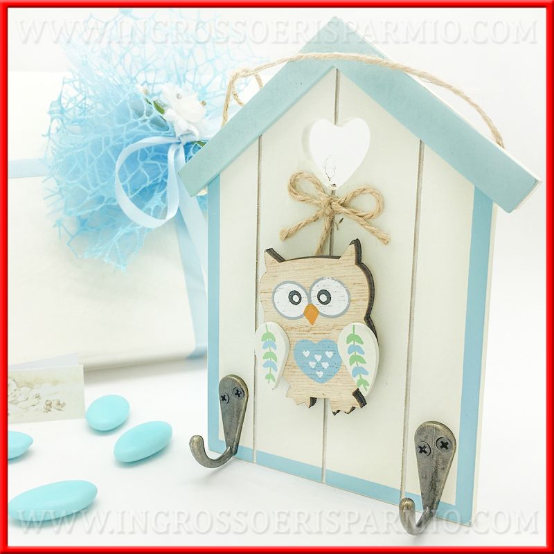 Bomboniere battesimo utili ed originali: un appendino da muro con dettagli celesti ed un simpatico gufetto portafortuna per bomboniere battesimo maschio che stupiranno i tuoi invitati!